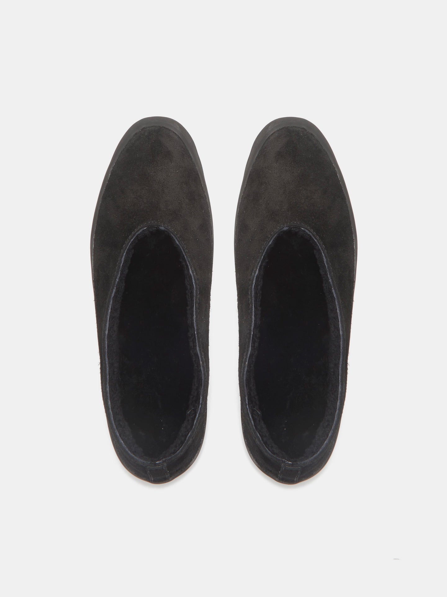 The Après Ski takes the ease of a slipper and reimagines it for the outdoors. Handcrafted in black suede with a tonal shearling lining, the style is equal parts cozy and refined. A cushioned insole keeps every step comfortable, while the smooth rubber tread and understated 8mm heel provide subtle lift and stability. Designed for cold-weather dressing without sacrificing polish, this is a flat that feels as natural fireside as it does on city streets.