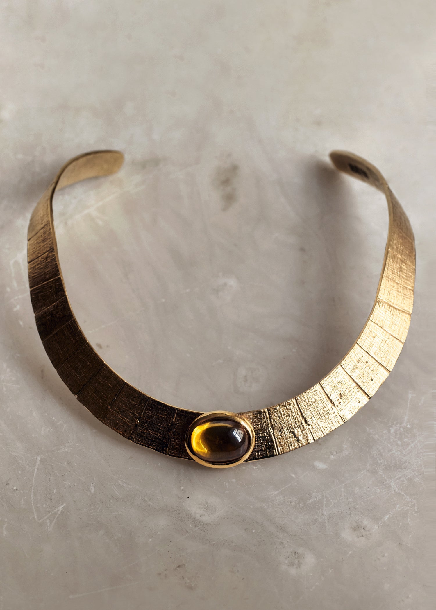 Hand sculpted to sit neatly at your collarbone and centered with a cabochon citrine stone. Juju Vera's signature 'Athena' style mixes clean lines, organic textures, and antique-inspired paneling. Designed with an open back for ease and flexibility.