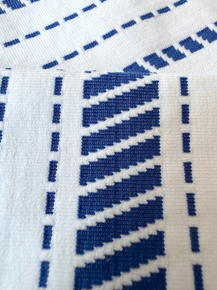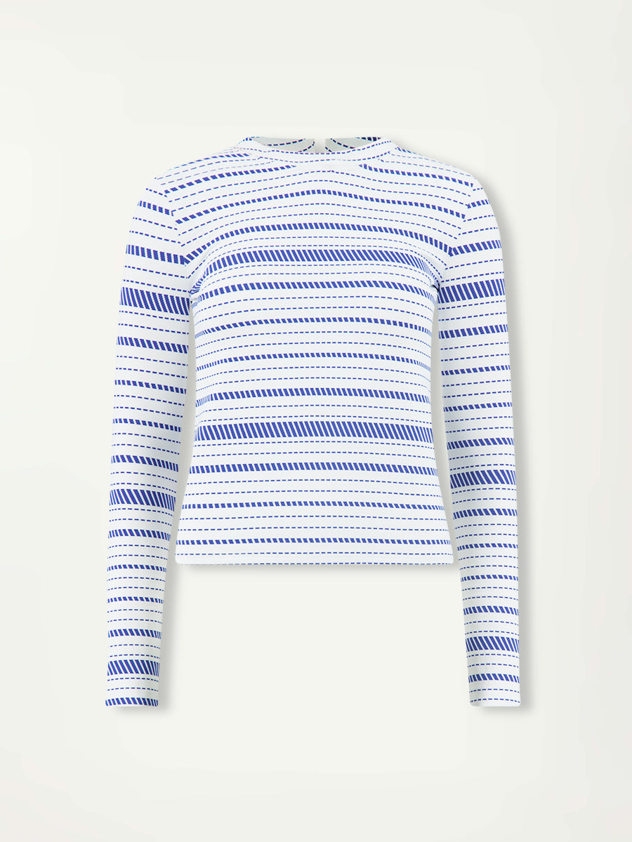 The Azeb Rash Guard in Tiki Azure blends sleek sun protection with Lemlem's signature style. Featuring a crisp white base with bright blue jacquard-inspired patterning, this long-sleeve swim top is designed for both performance and elegance. The streamlined silhouette includes a high neckline and slim fit for active coverage, while the soft, stretchy fabric ensures comfort in and out of the water. Fully lined in lightweight jersey and responsibly made in Morocco, it's a modern essential for swim, surf, and sun.