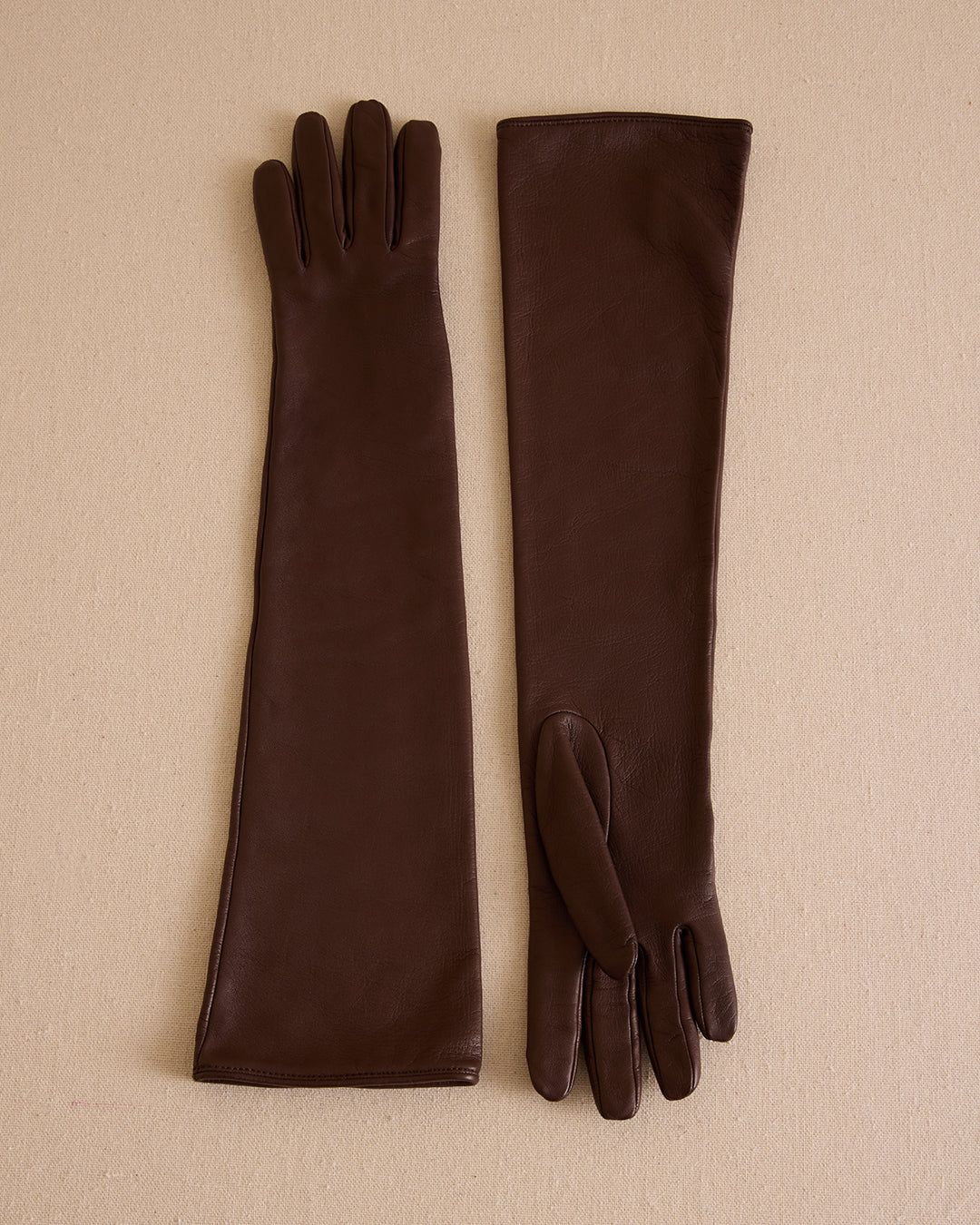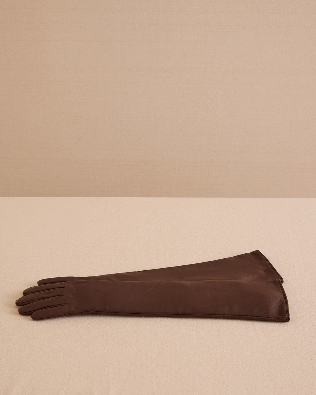 These opera-length gloves are the ultimate luxury accessory. Hand-crafted in Italy from 100% nappa calfskin leather, these are lined in 100% cashmere and designed to elevate any look. The Chocolate nappa leather pairs beautifully with soft creams and earth tones.