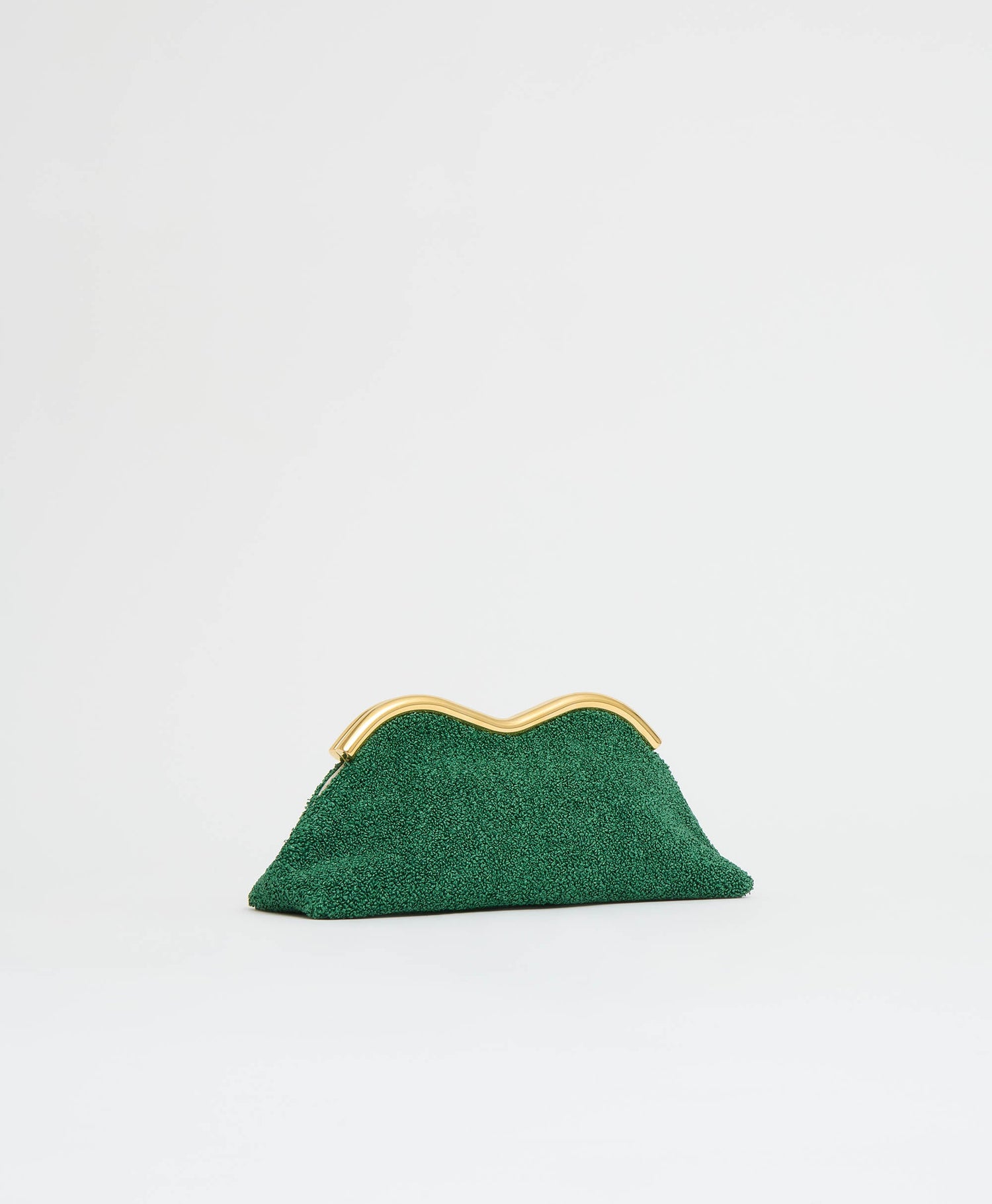 !!!Description---The Baci Clutch is crafted from textured raffia with a soft construction and metal exposed wave like frame. Lined with Italian canvas, it features a single compartment that fits all phones.