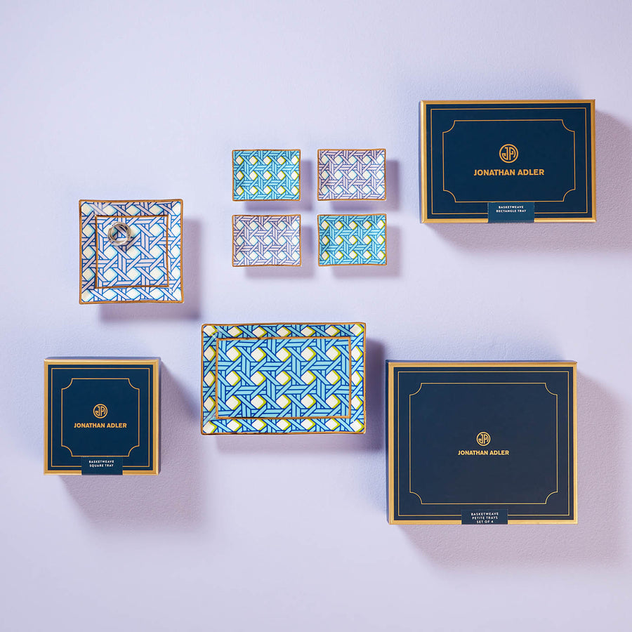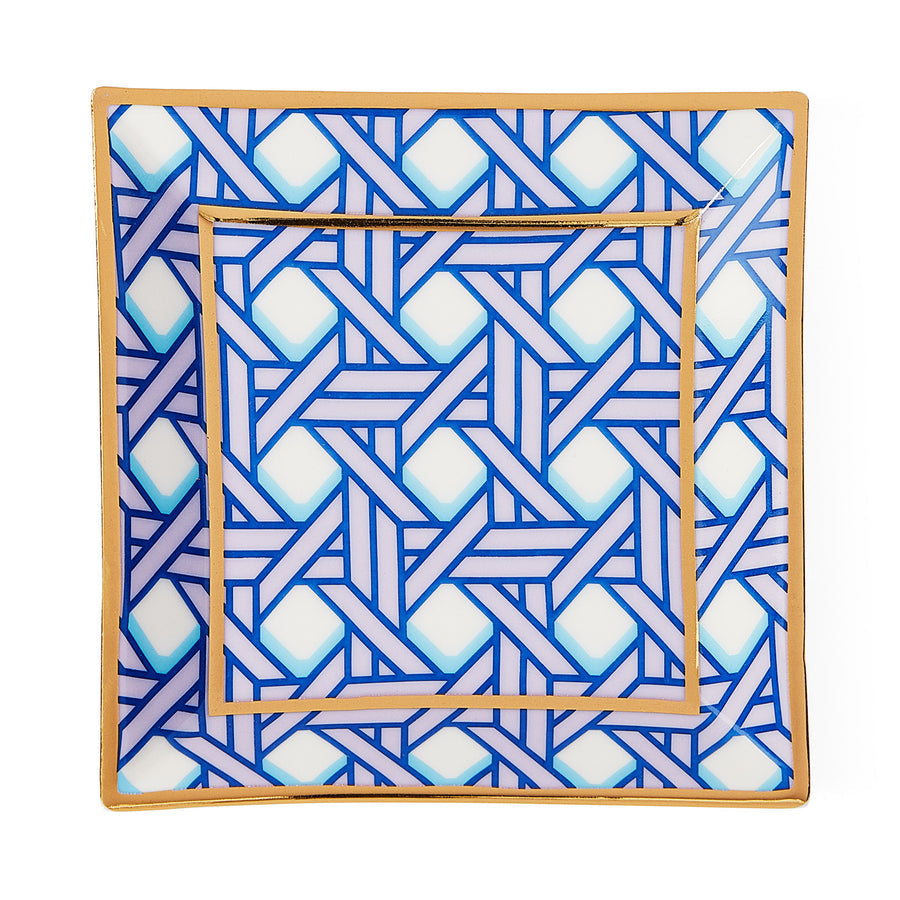 Treat your tablescape to our posh and preppy Basketweave Square Tray, featuring a traditional basket weave pattern in cool blues and lavender with warm gold accents. Crafted from high-fired porcelain. Packaged in a nifty gift box, it makes a perfect hostess present (or pick-me-up for yourself).