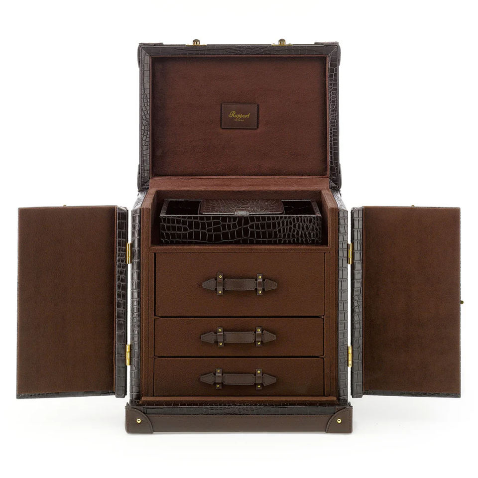 A modern trunk for the gentleman with a flair for leather luxury. Handcrafted in a crocodile-effect leather, the Brompton trunk is a luxurious place to store your fine jewellery, accessories and two watches. It boasts a smooth suede interior with multiple drawers and a detachable tray. Chrome or gold plated clasps are used to secure the two front opening doors.
