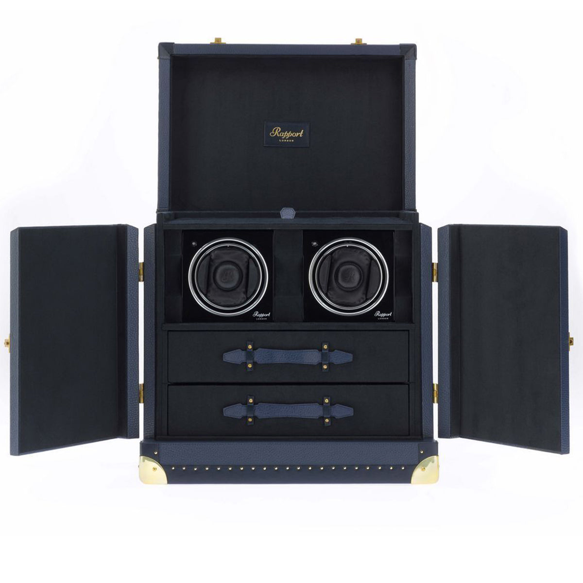 Handcrafted with navy leather and gold-plated accents, the Cambridge Watch Winder Trunk opens to reveal two watch winder cubes and suede-lined drawers designed to hold your valuables, from timepieces to cufflinks and beyond.