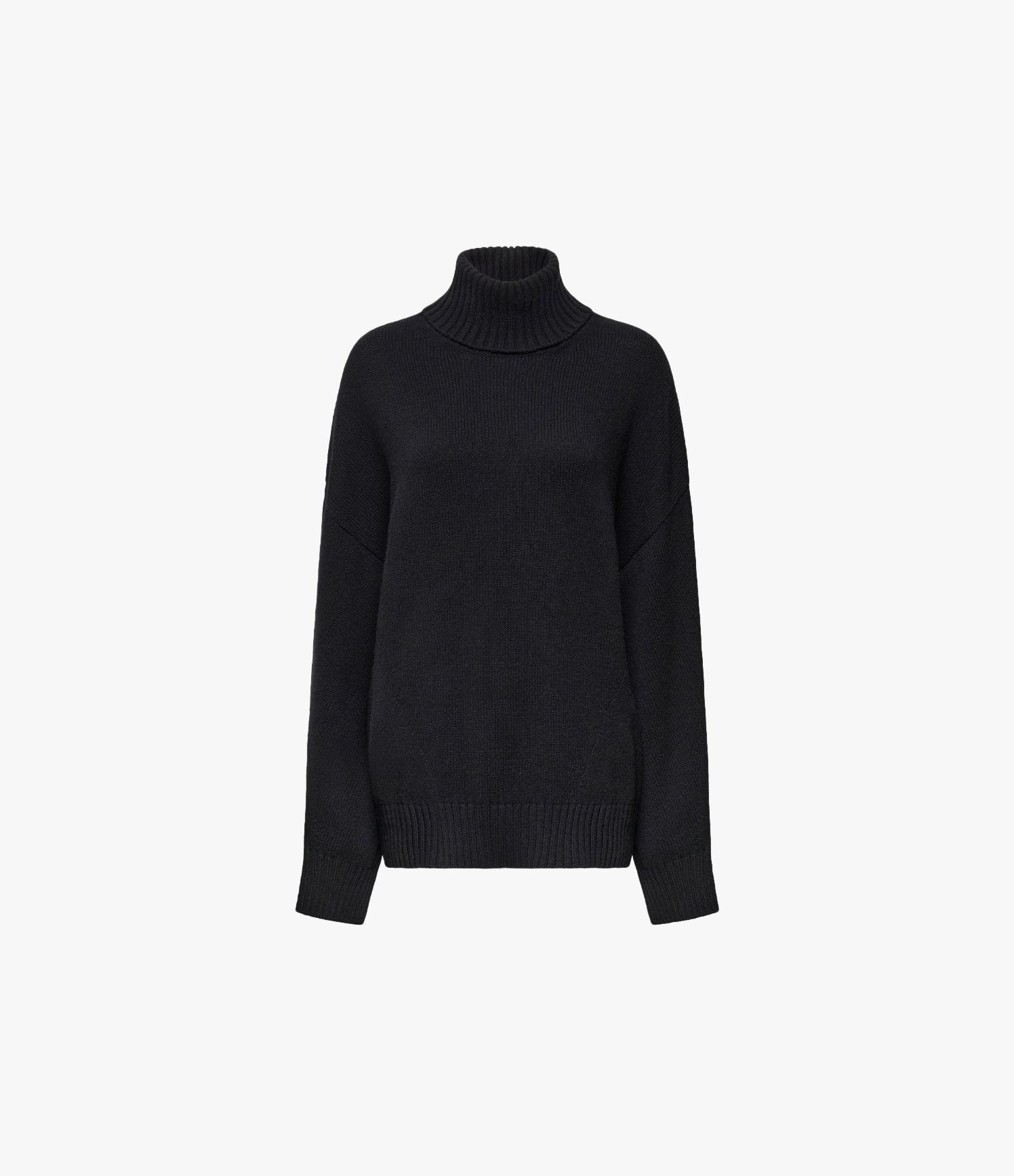 The Cashmere Oversized Turtleneck in Black is the epitome of understated luxury—soft, sculptural, and endlessly versatile. Crafted in midweight recycled cashmere, it features a relaxed silhouette with cocoon-shaped sleeves and subtle stitch detailing along the shoulders for quiet dimension. The generous turtleneck can be folded or left slouchy, offering warmth and ease in equal measure. Wear it half-tucked into tailored trousers for a modern, refined look, or drape it over denim for effortless weekend polish.
