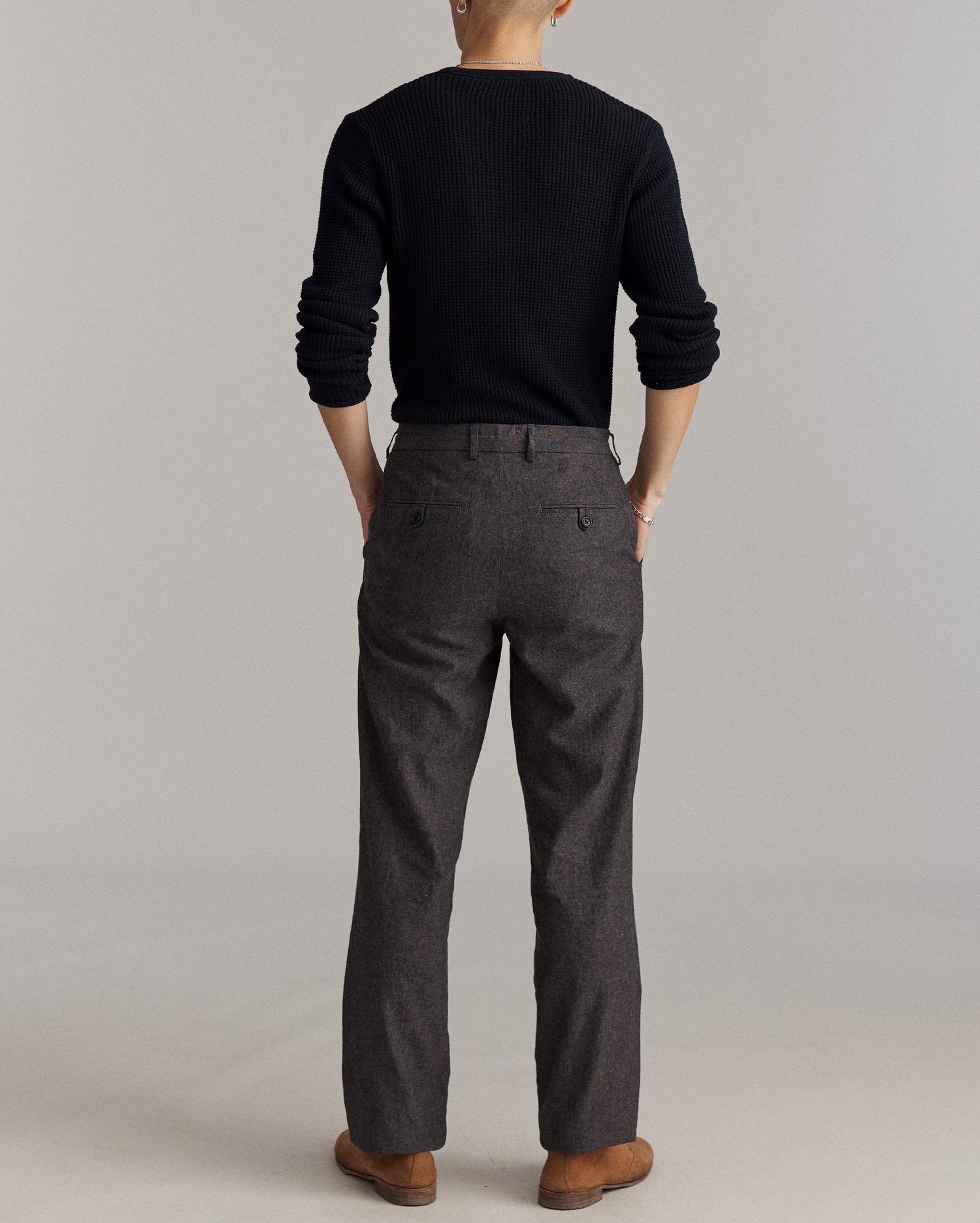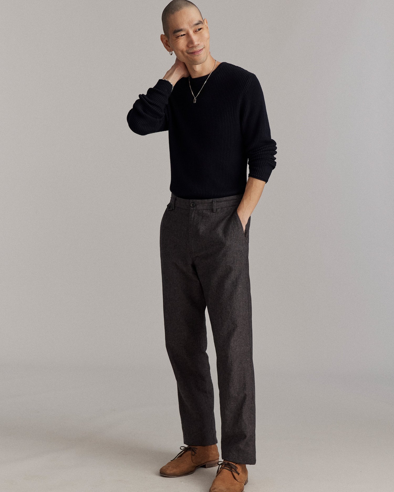 A refined take on everyday tailoring. The Chambray Flat Front Pant combines the structure of a trouser with the ease of a khaki, cut in a cotton-linen blend that's light, breathable, and soft to the touch. The slim fit and mid rise offer a modern silhouette, while the chambray weave brings subtle texture to the charcoal colorway.