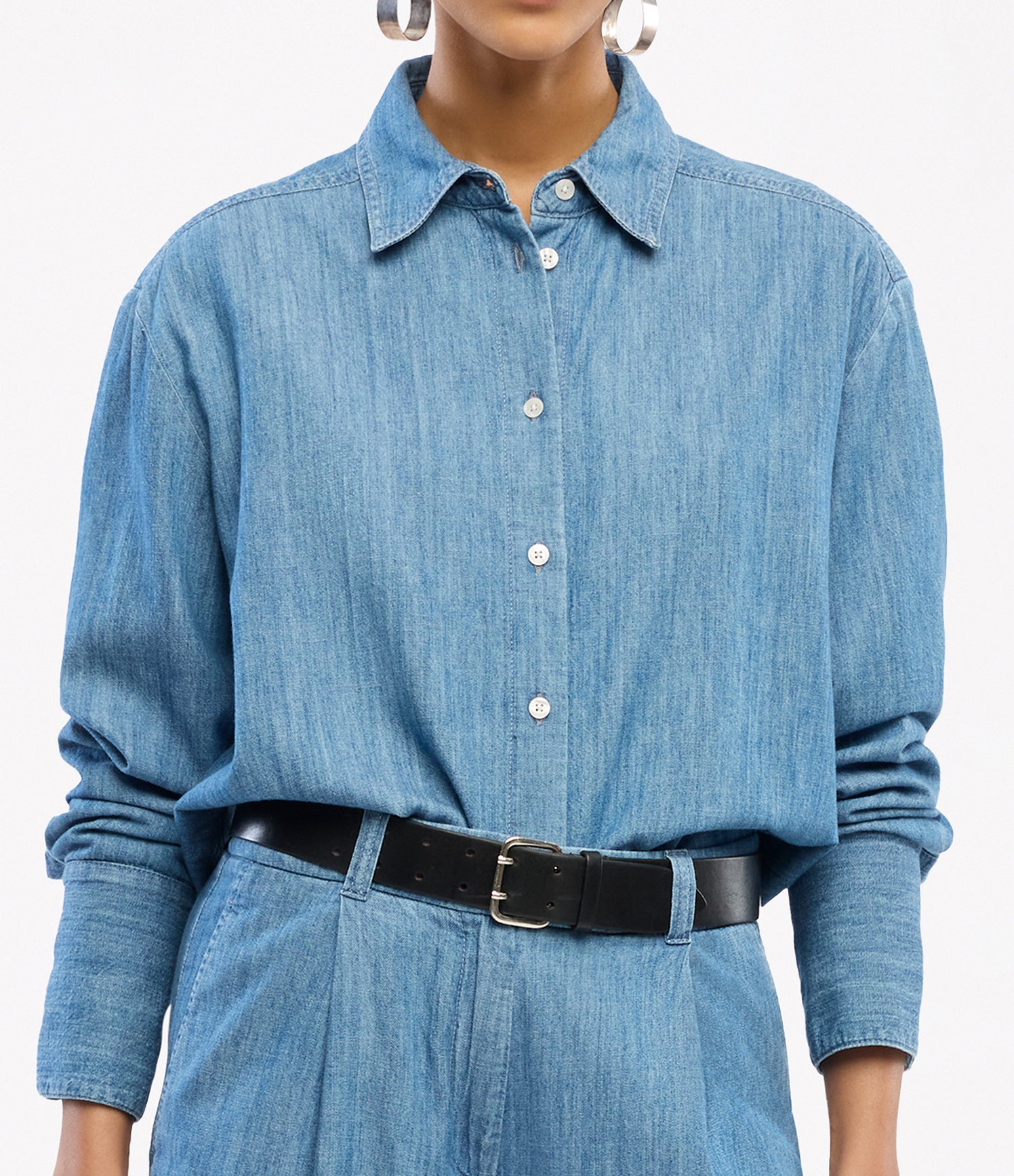 The Chambray Shirt in Dark Blue is designed with an intentionally oversized fit. An exaggerated curved hem lends ease and movement, while back darts shape the body into a subtle cocoon silhouette. Finished with an embroidered logo at the waist, it offers quiet distinction without sacrificing versatility. Crafted from fabric produced at an Italian mill pioneering circular production since 1976, while the shirt gets finished in Italy as well.