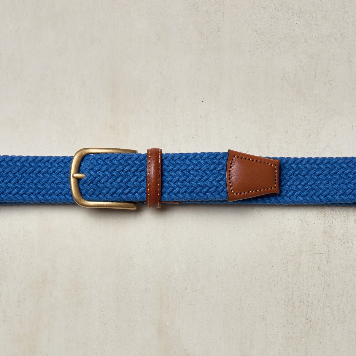 The Cotton Elastic Woven Belt in Blue is a fresh take on a timeless accessory. Crafted in Italy from a durable cotton and elastic blend, it offers a comfortable stretch and secure fit. The vibrant blue hue adds a subtle pop of color, making it a versatile choice for pairing with everything from chinos to summer tailoring. Finished with leather accents and a classic metal buckle for a refined touch.