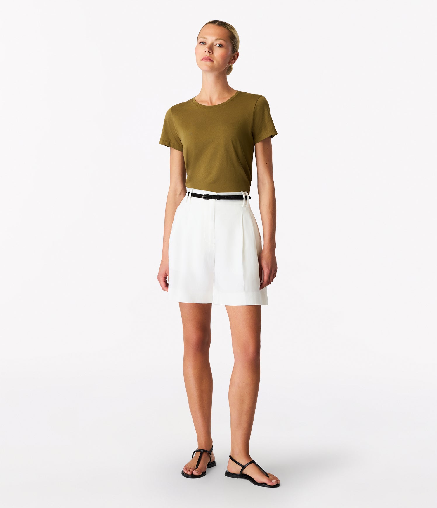 An essential in every wardrobe, the Crew Neck T-Shirt in Moss balances ease with refinement. Cut from a 100 percent organic cotton blend, the silhouette is slightly sheer, skimming the body with a flattering drape and finished with a subtle kick at the sleeve. Designed to wear on its own or layered, it pairs effortlessly with tailoring or denim for a timeless look. The moss green hue offers understated depth, versatile enough to transition from casual days to evenings out.