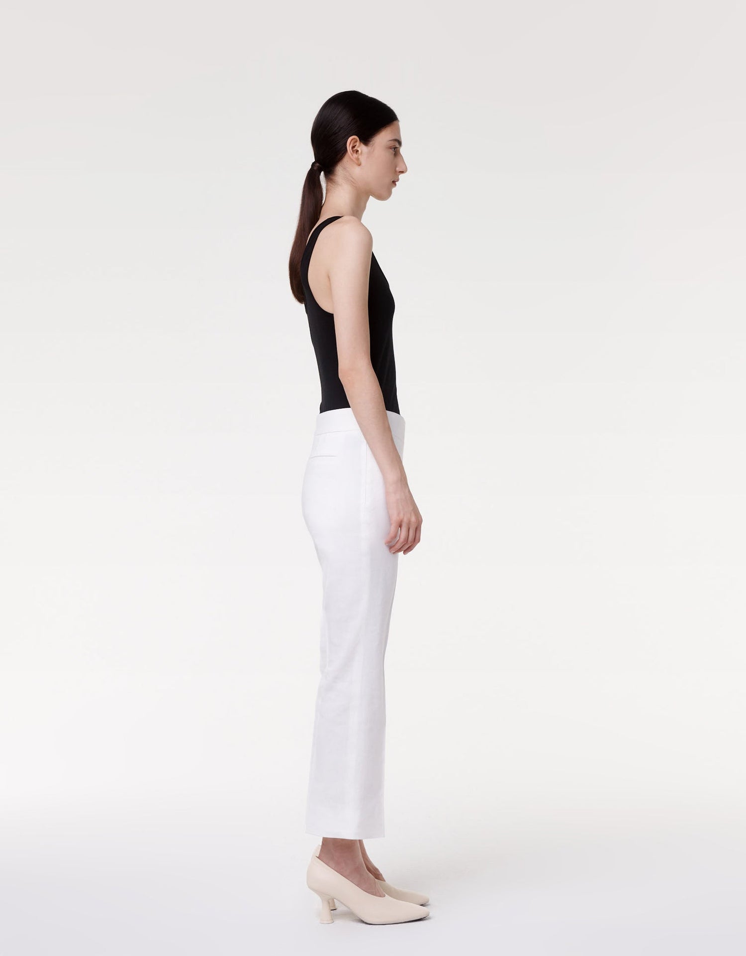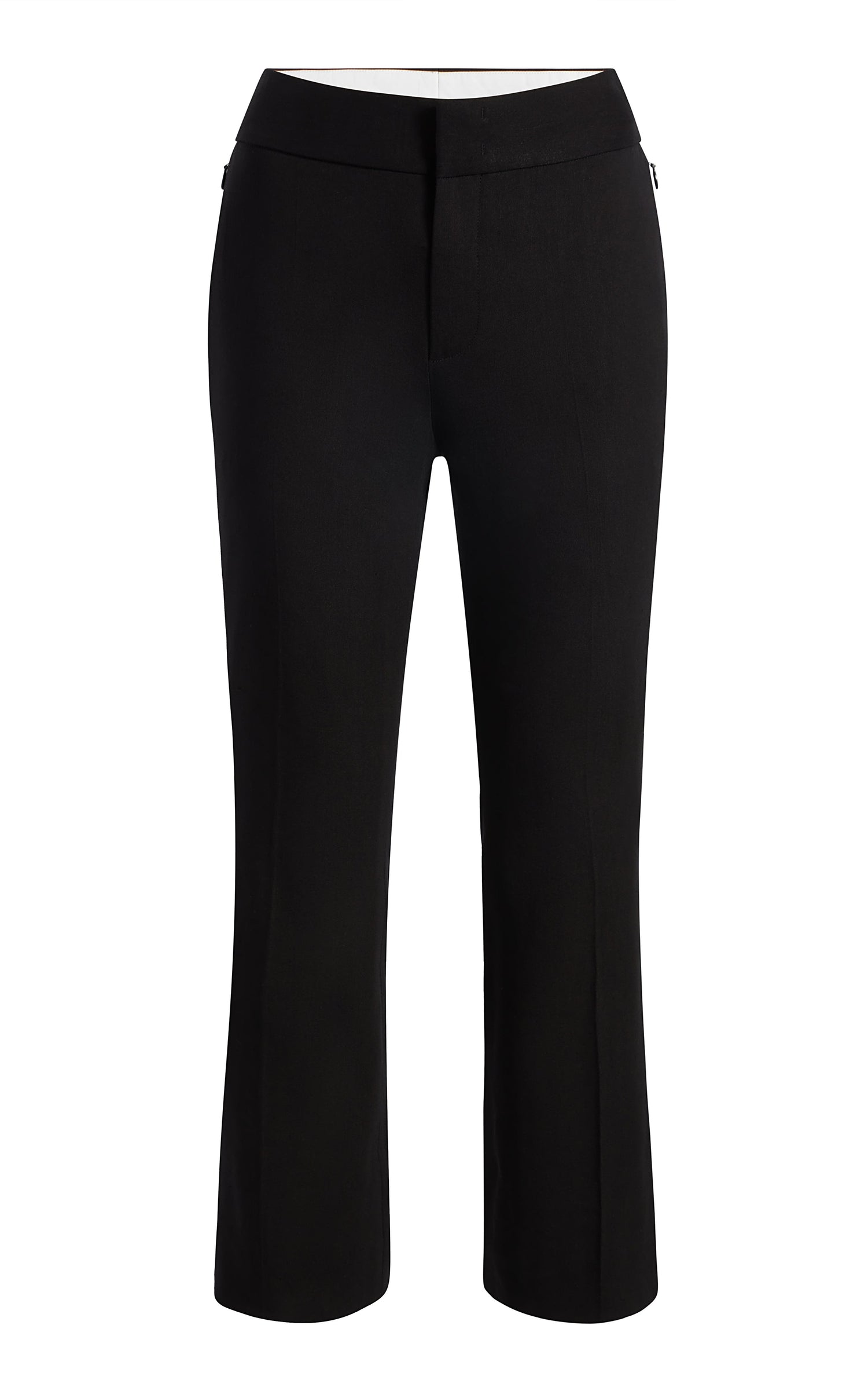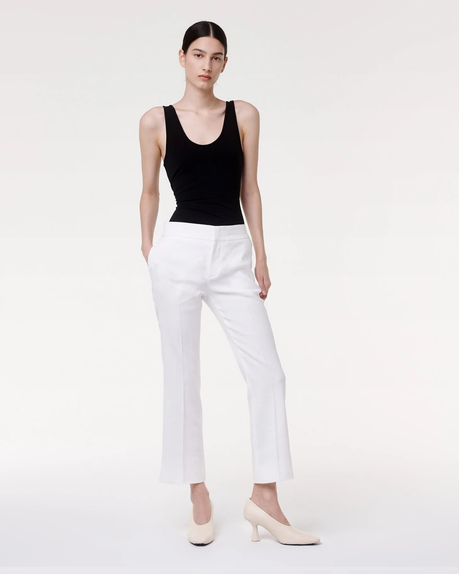 This pant is designed to sit slightly below the natural waist, with hook and bar and corozo button closures at the front fly. Cropped and flared just above the ankle, these seamed trousers pair beautifully with heels for an elongated and feminine look.
