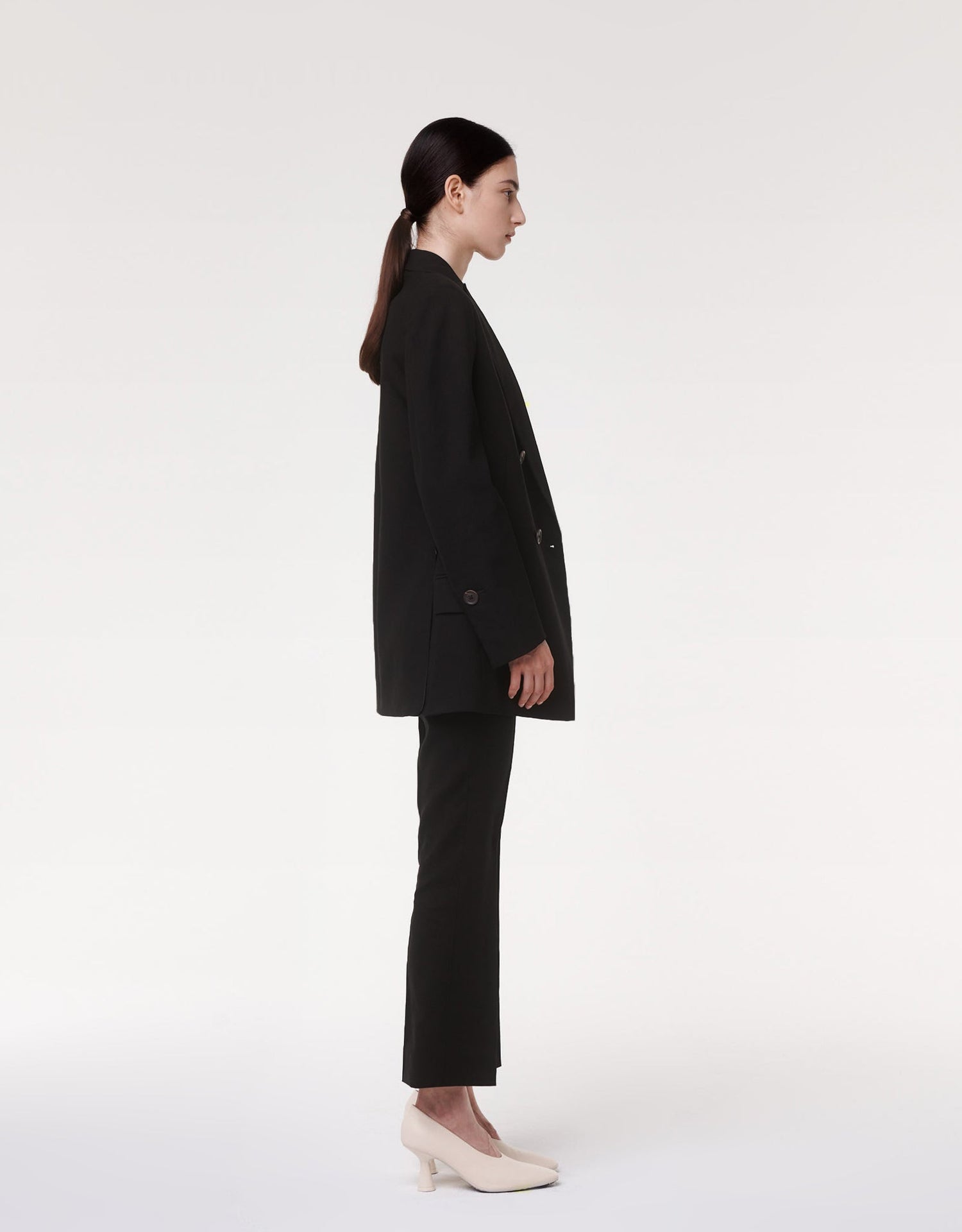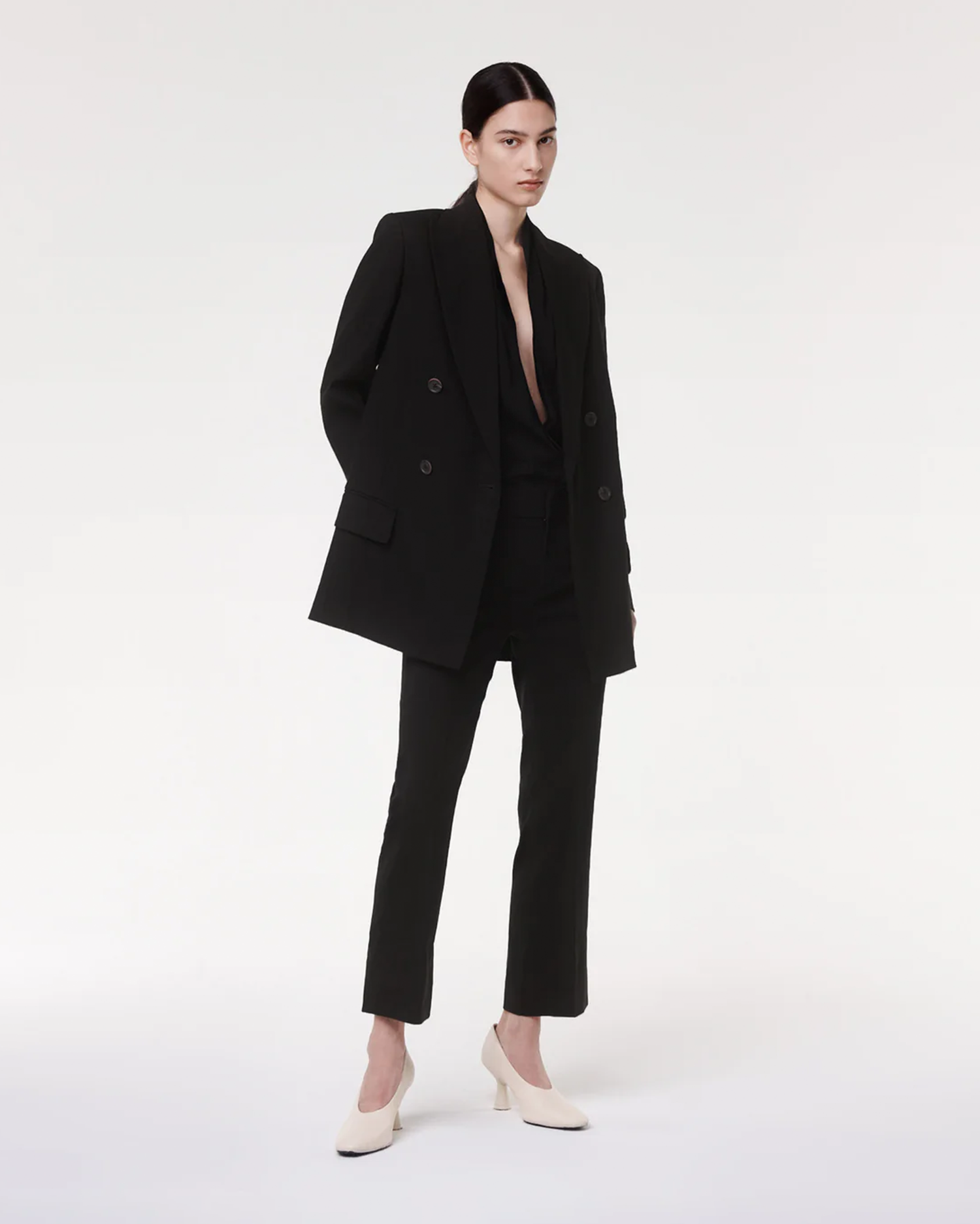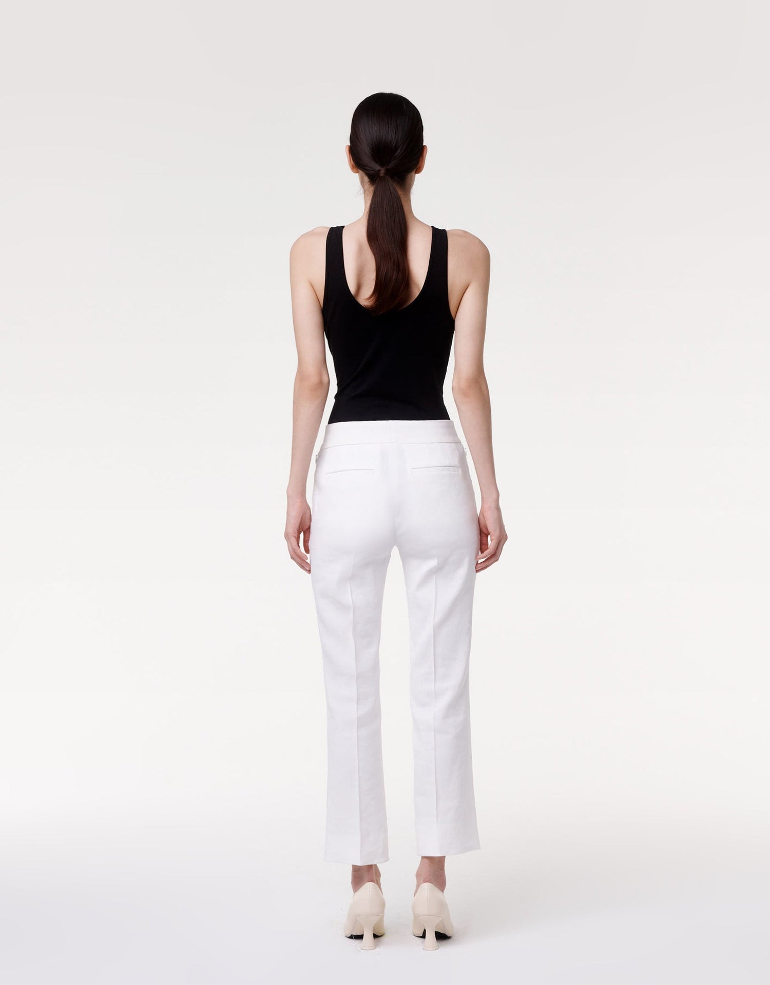 This pant is designed to sit slightly below the natural waist, with hook and bar and corozo button closures at the front fly. Cropped and flared just above the ankle, these seamed trousers pair beautifully with heels for an elongated and feminine look.