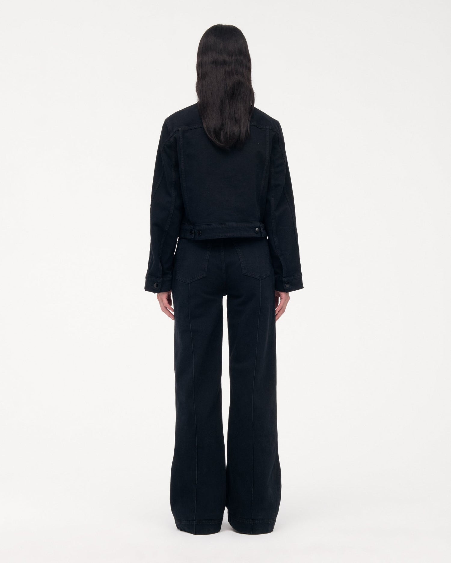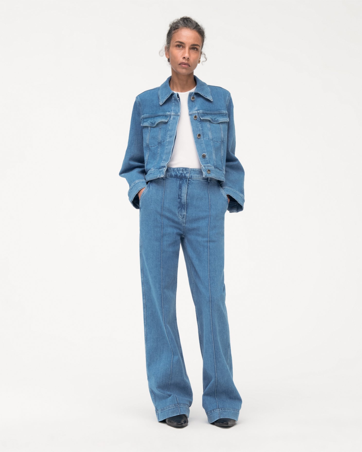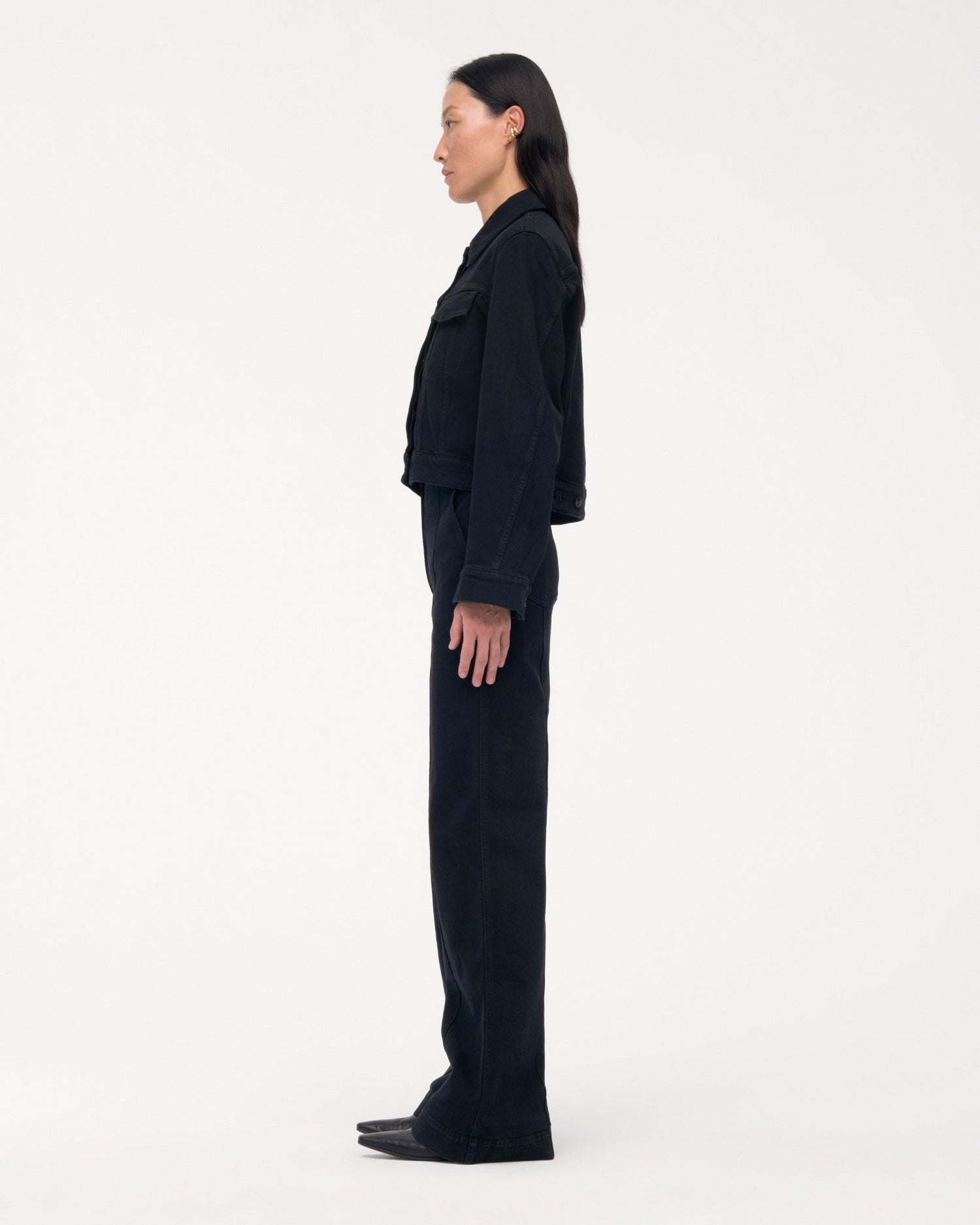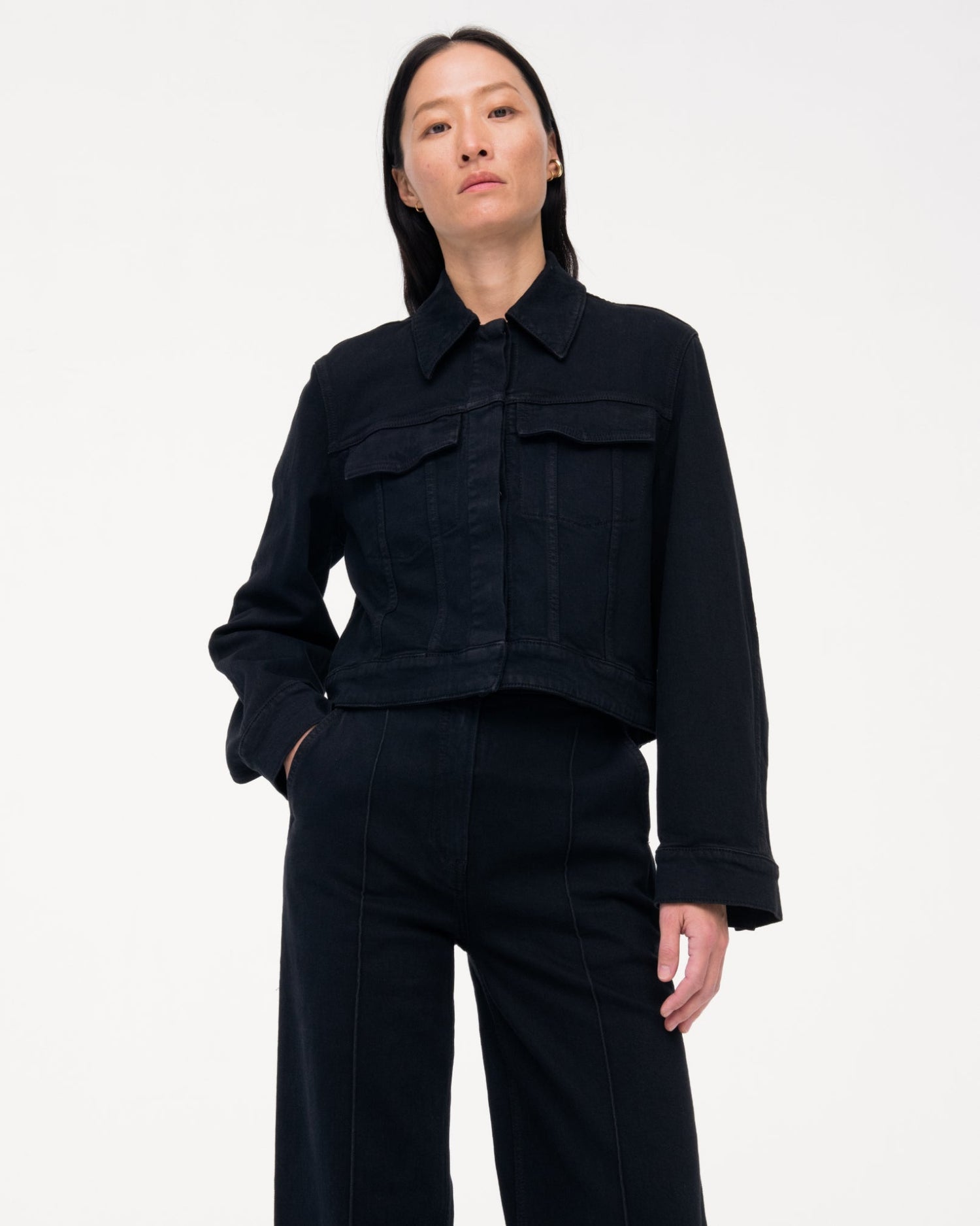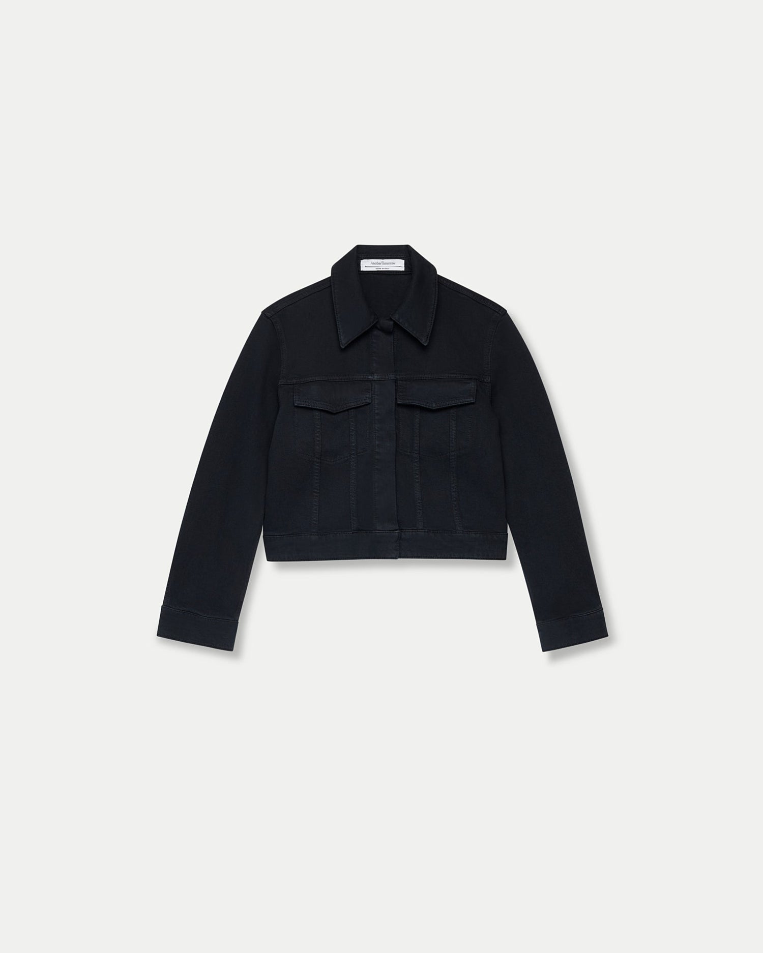 An homage to classic motorcycle and workwear jackets, Another Tomorrow's Cropped Denim Jacket is sustainably made from organic cotton processed in a GOTS-Certified Italian mill.