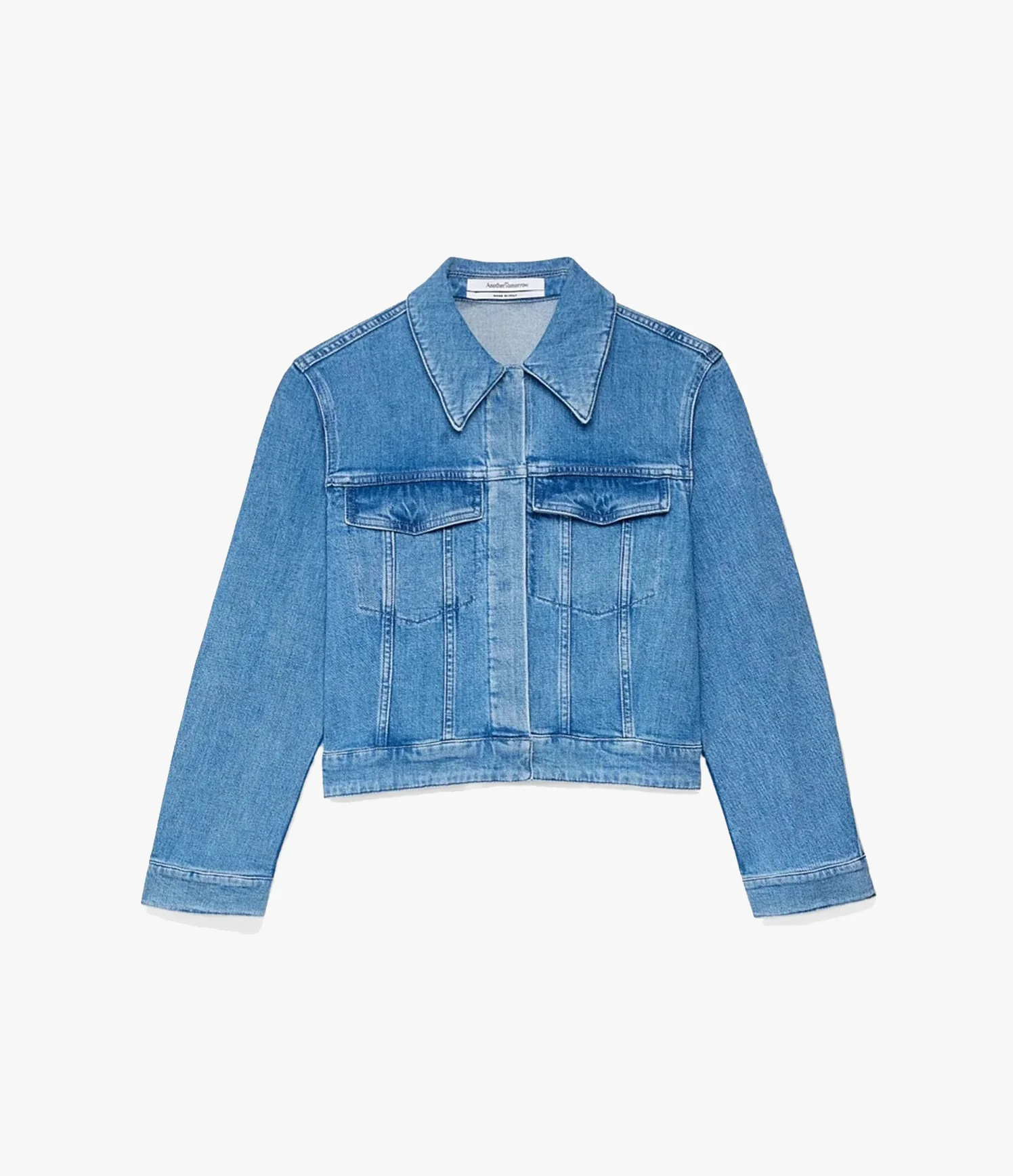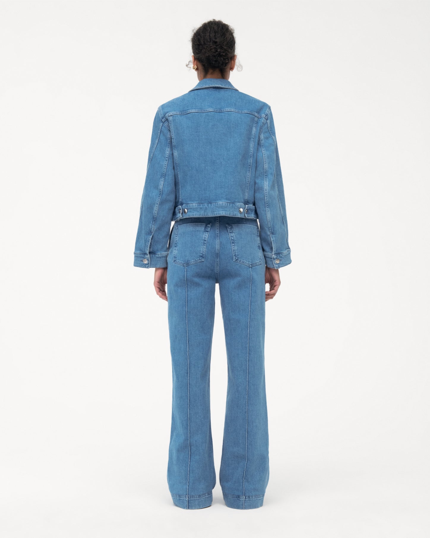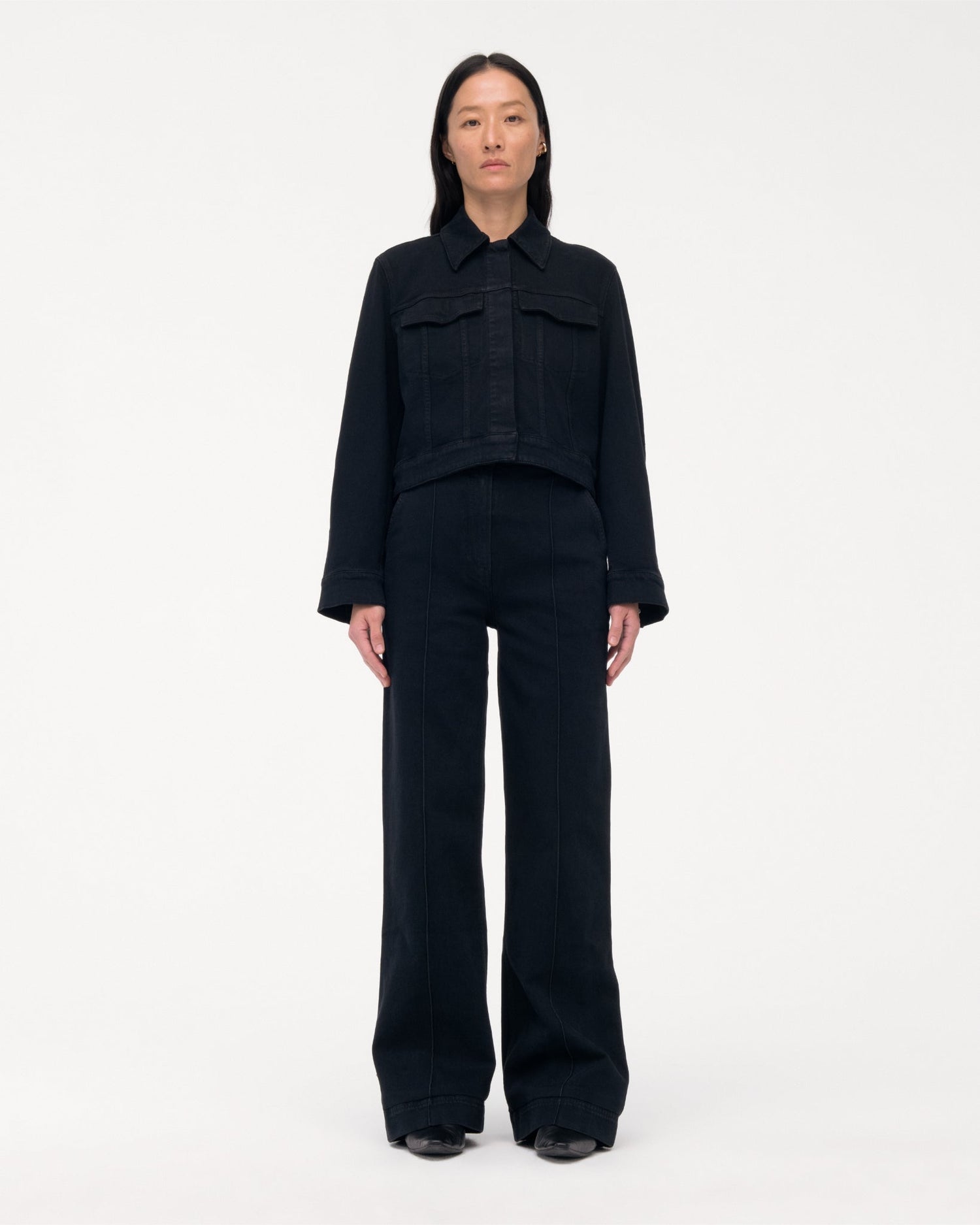 The Cropped Denim Jacket takes cues from vintage motorcycle and workwear silhouettes, reimagined with sharp seaming and a rounded, cropped shape. Clean lines are emphasized with hidden closures and a covered placket, keeping the focus on form. Chest patch pockets and a waist tab nod to utility, while the dark wash lends a polished edge. Designed to be worn on its own or paired with matching denim for a full suit, it's a modern take on a forever piece.