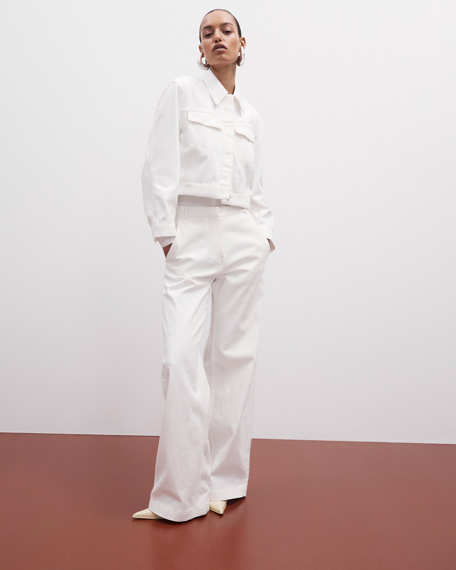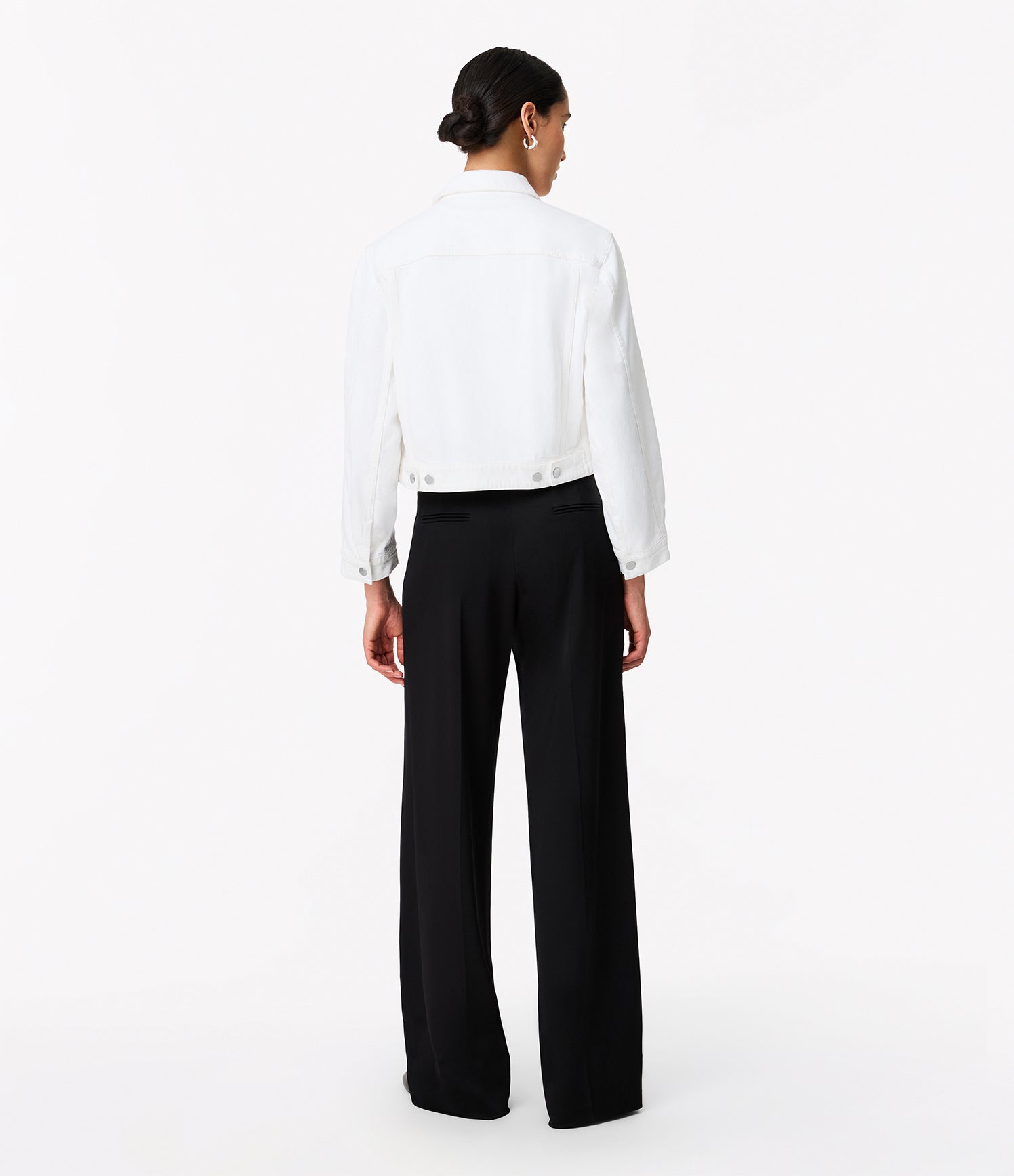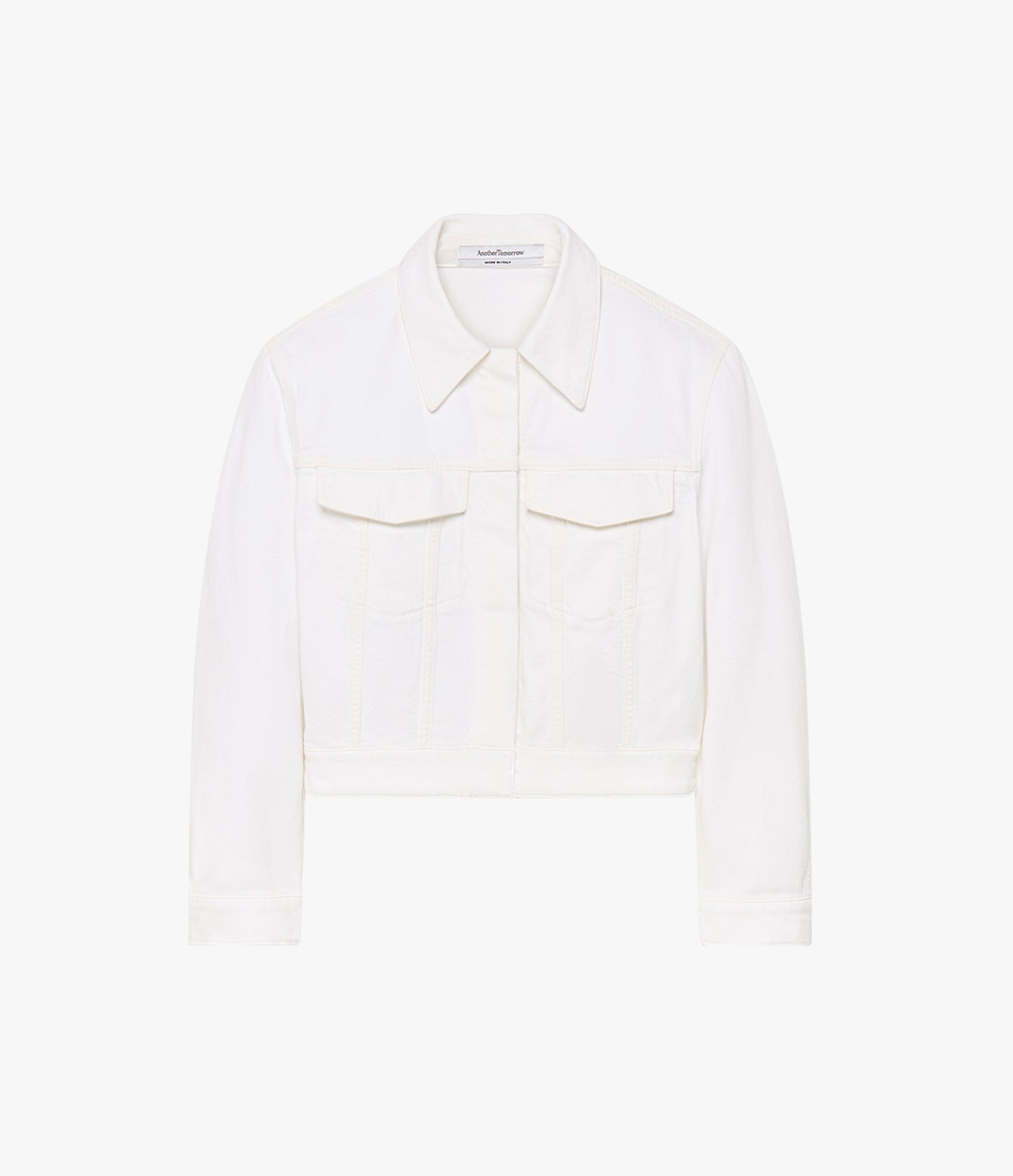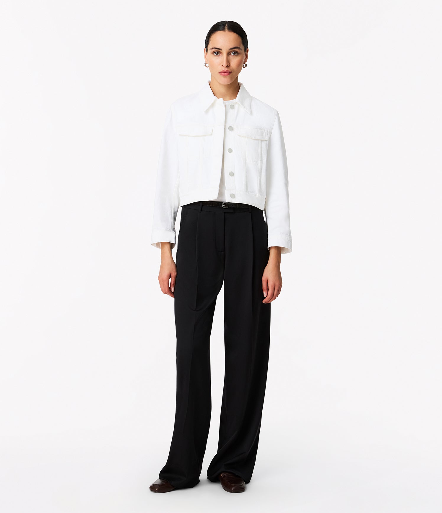 The Cropped Denim Jacket takes cues from vintage motorcycle and workwear silhouettes, reimagined with sharp seaming and a rounded, cropped shape. Clean lines are emphasized with hidden closures and a covered placket, keeping the focus on form. Chest patch pockets and a waist tab nod to utility, while the dark wash lends a polished edge. Designed to be worn on its own or paired with matching denim for a full suit, it's a modern take on a forever piece.