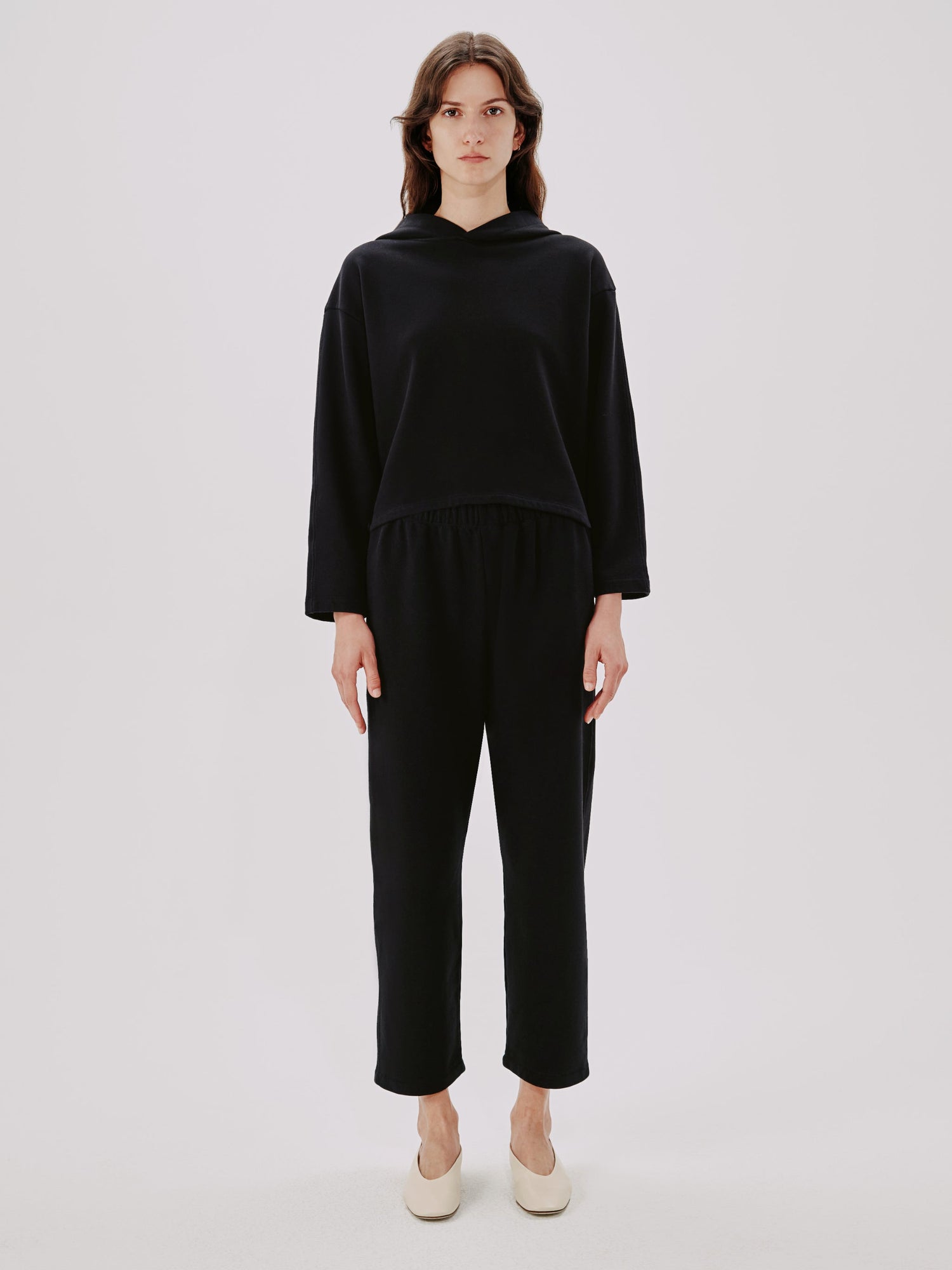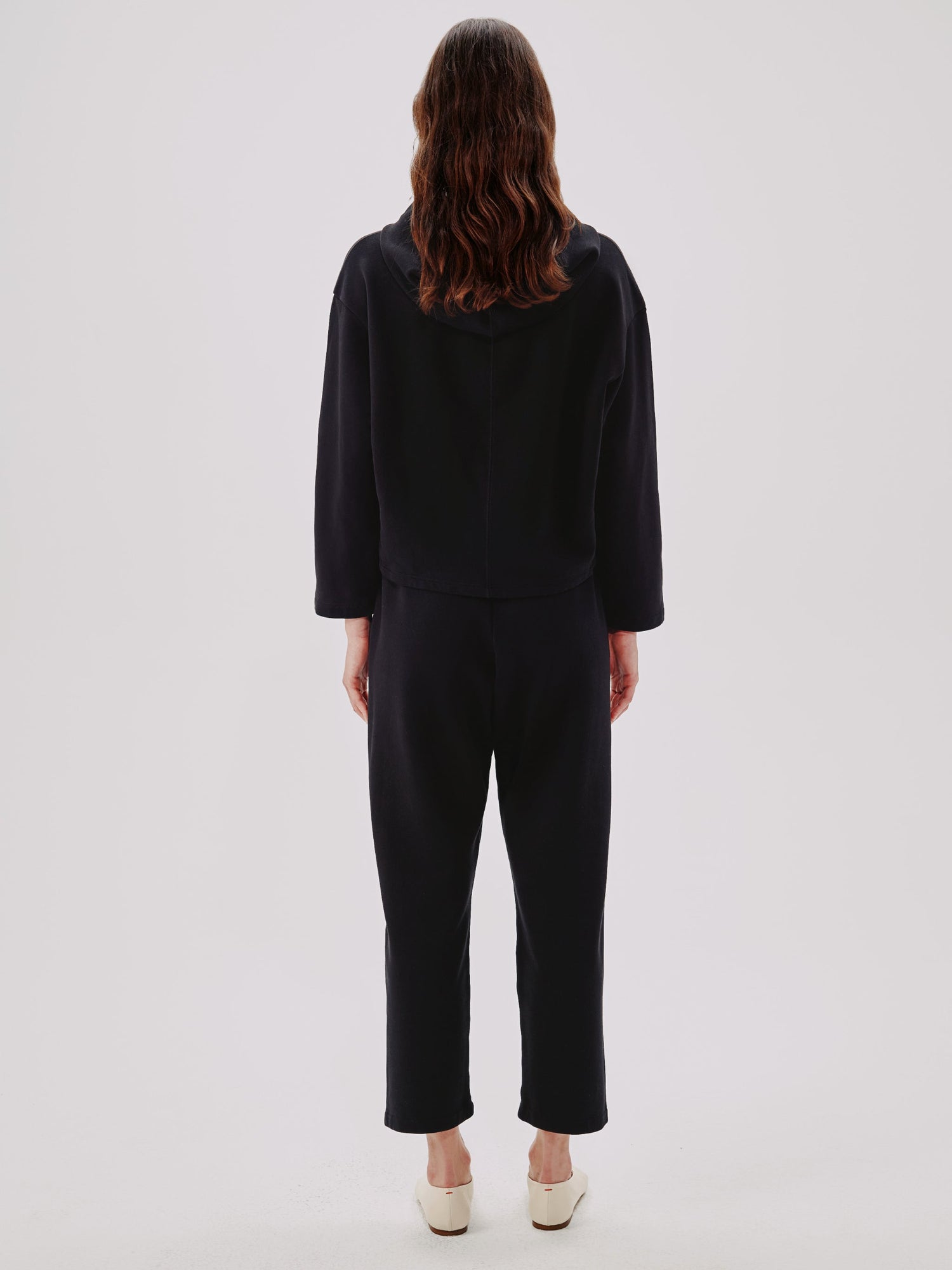 Effortless comfort meets elevated design in the Cropped Hoodie in Black from Another Tomorrow. Crafted from a custom-developed cotton and Seacell fleece, this piece redefines loungewear with its relaxed fit, soft hand, and modern cropped silhouette. Subtle stitch detailing along the shoulders and center back adds quiet structure, while bracelet-length sleeves lend an easy, refined finish. Pair it with the matching Jogger for a polished take on off-duty dressing—comfortable enough for home, considered enough for everywhere else.