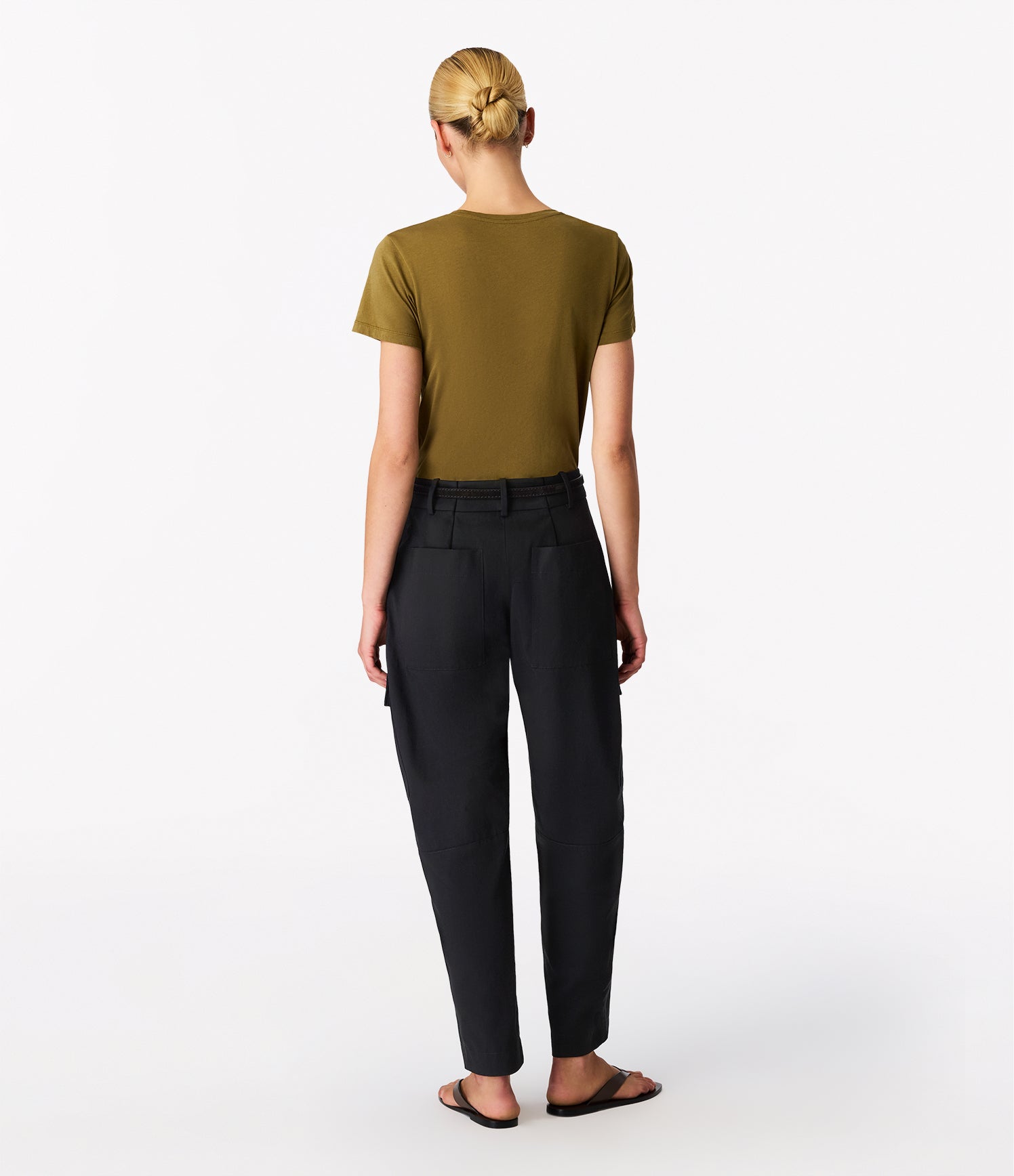 A modern interpretation of the utilitarian classic, the Curved Cargo Pant in Black blends ease with structure. Designed with a softly rounded leg and slightly cropped hem, it flatters the form while maintaining a relaxed, effortless silhouette. Cargo patch pockets and subtle seam detailing at the knee add quiet dimension. Style it with a crisp button-down for a polished daytime look or pair it with a slim knit for casual refinement. Its warm golden hue brings a fresh, unexpected twist to a wardrobe essential.