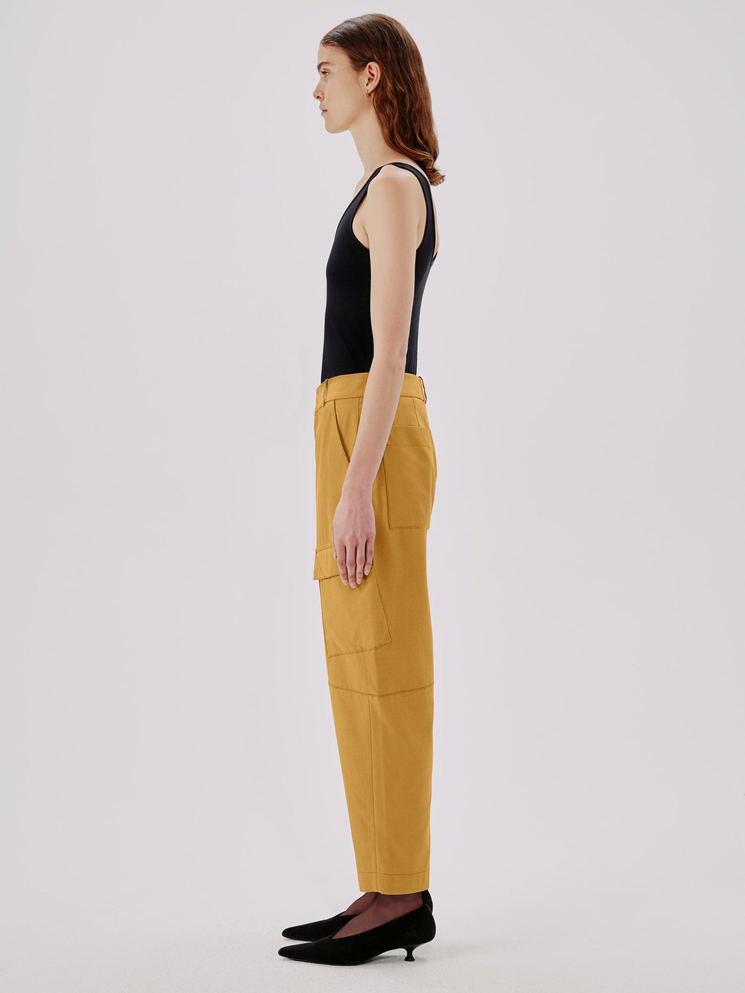 A modern interpretation of the utilitarian classic, the Curved Cargo Pant in Goldenrod blends ease with structure. Designed with a softly rounded leg and slightly cropped hem, it flatters the form while maintaining a relaxed, effortless silhouette. Cargo patch pockets and subtle seam detailing at the knee add quiet dimension. Style it with a crisp button-down for a polished daytime look or pair it with a slim knit for casual refinement. Its warm golden hue brings a fresh, unexpected twist to a wardrobe essential.