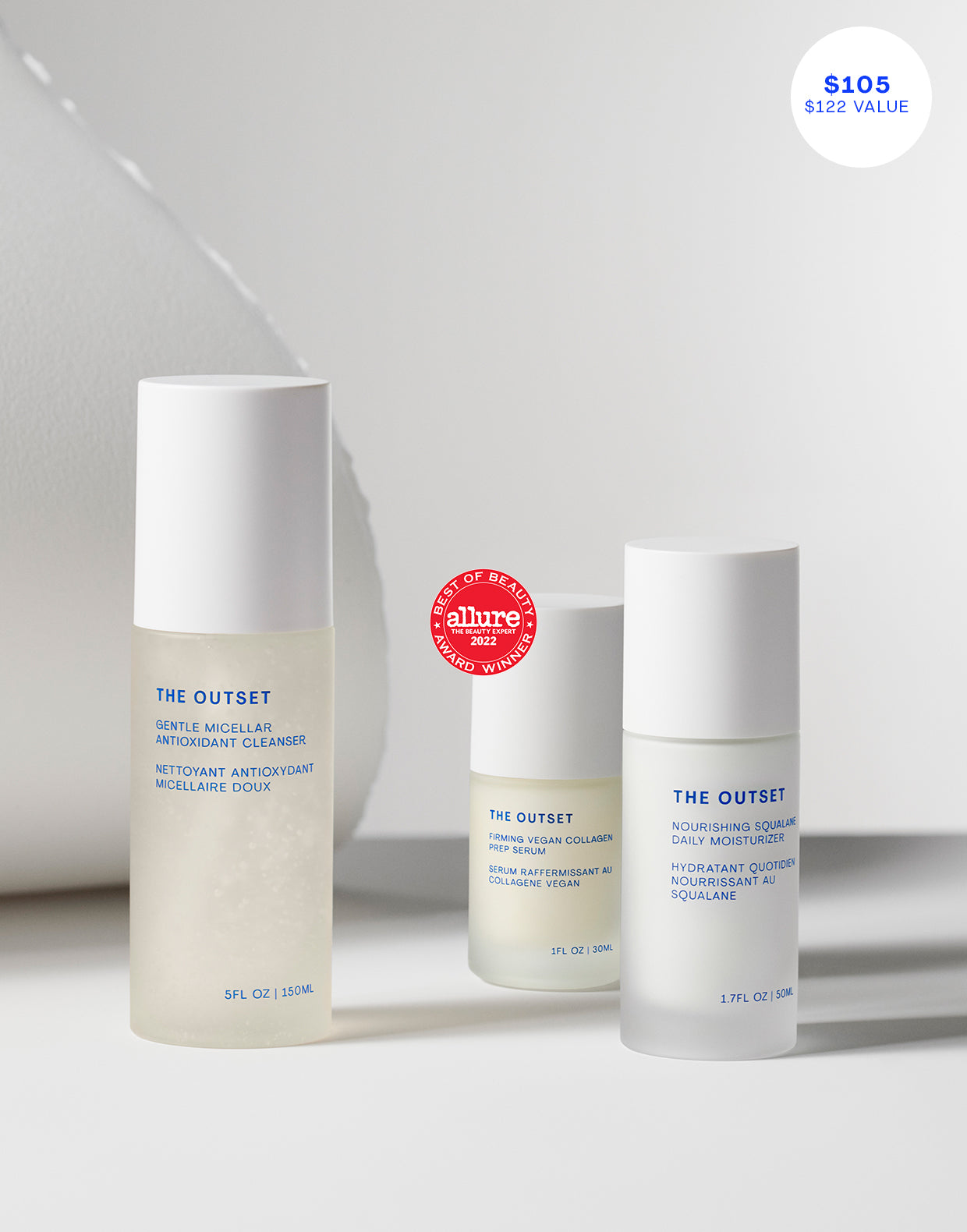 Deeply hydrate skin in three simple steps in under three minutes daily for beautifully radiant and youthful-looking skin. Most traditional three-step routines strip the skin in the first two steps with a cleanser and toner, leaving all the moisturizing muscle to the cream. The Outset hydrates at every step, with their signature Hyaluroset™ botanical hydrator that outperforms hyaluronic acid in 24-hour moisturization tests and repairs the skin barrier in two weeks.