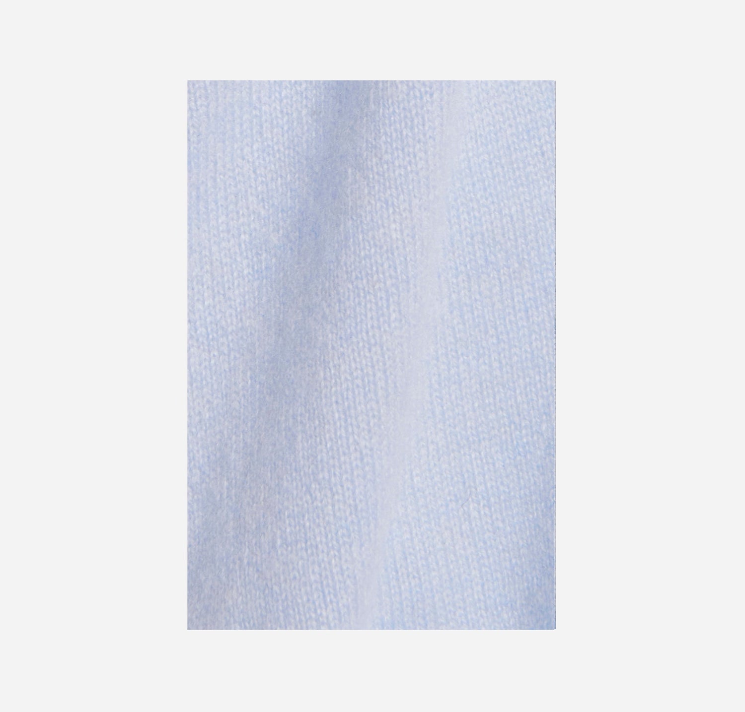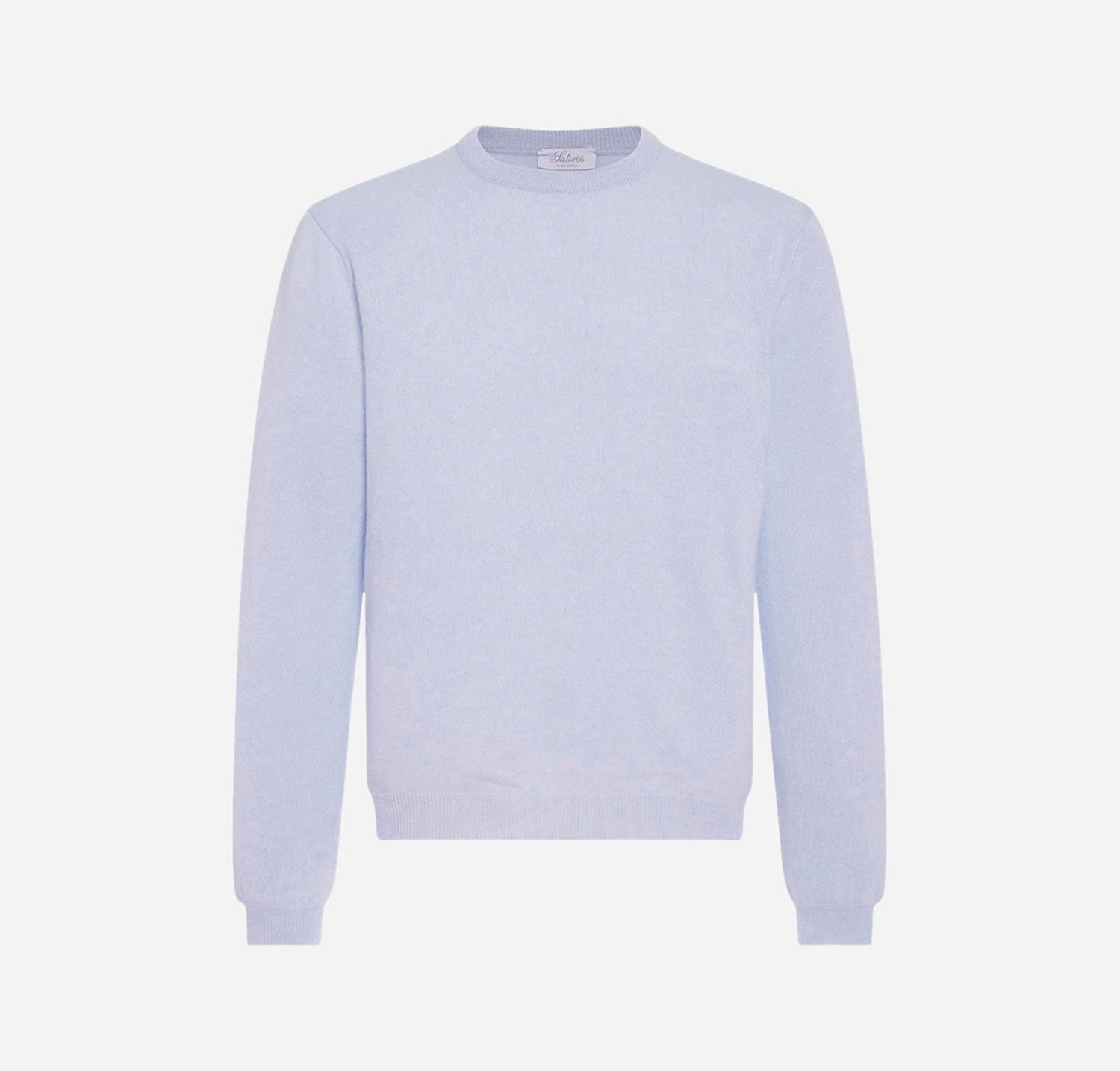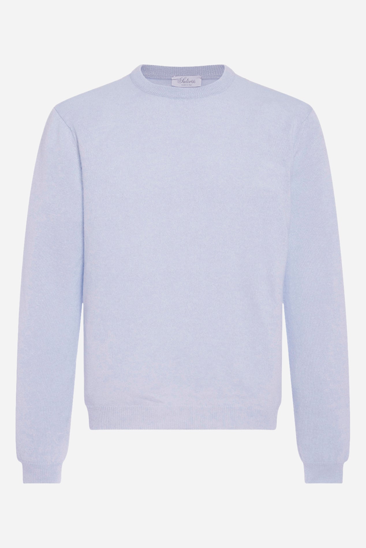 Pure cashmere crewneck sweater with ribbed collar, cuffs, and hem.