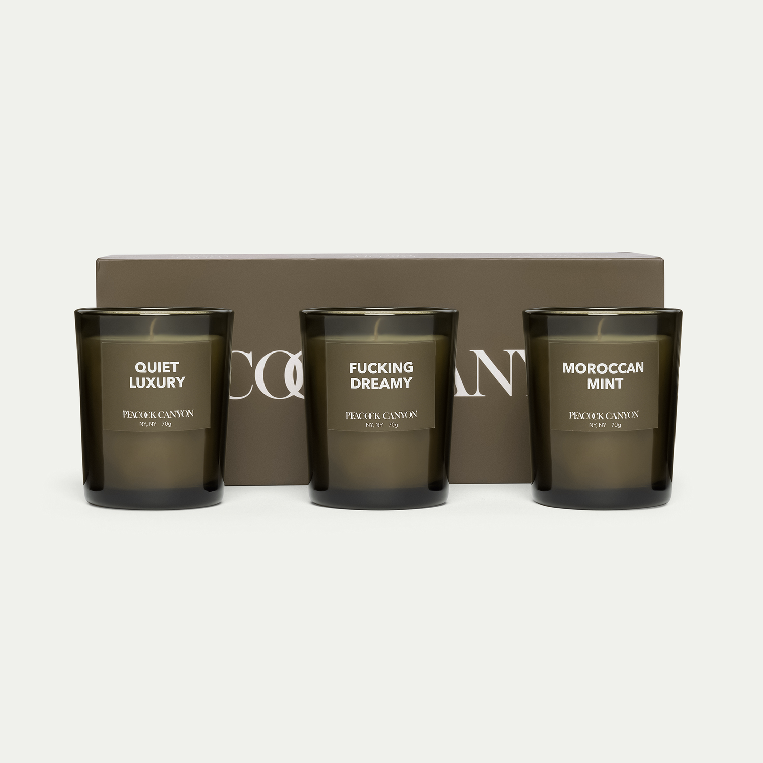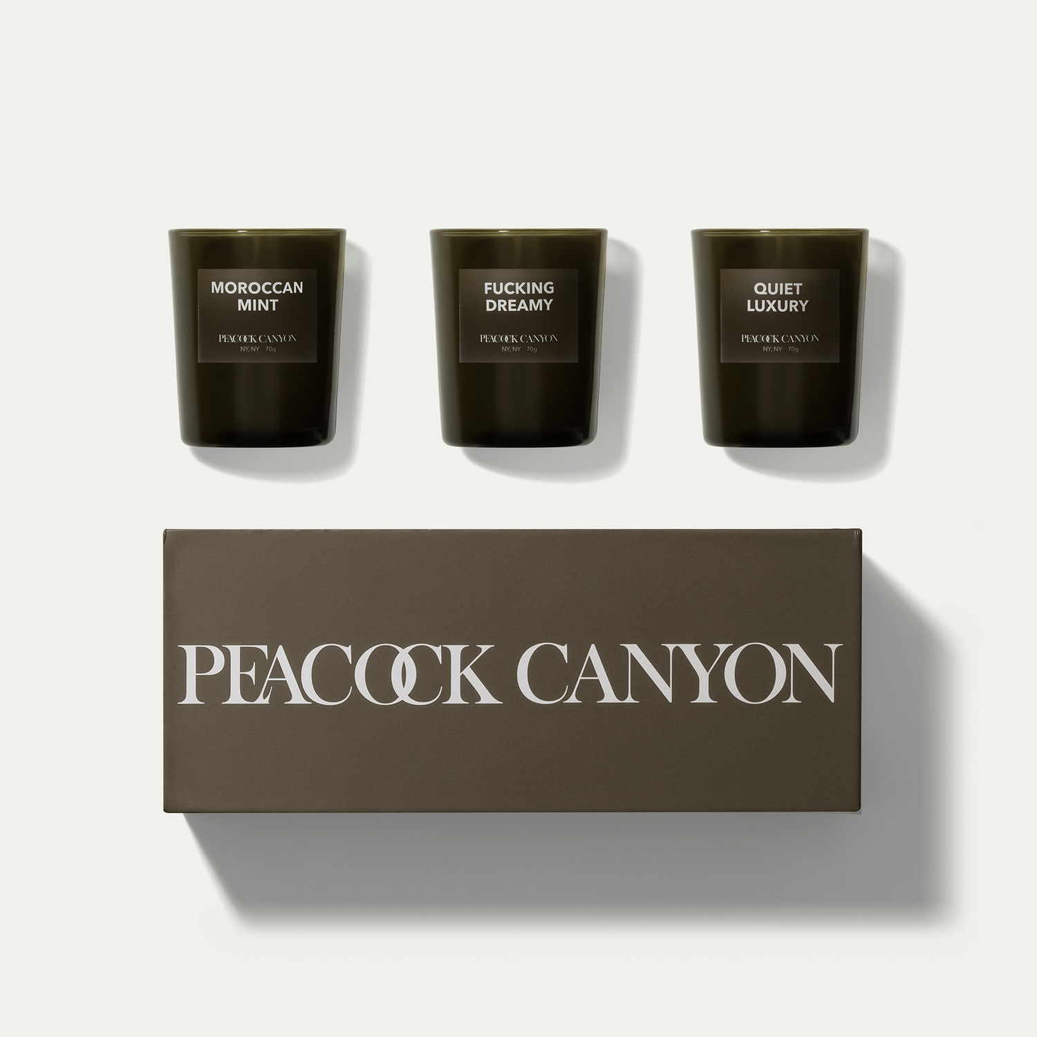 Meet the candles that started it all. The Discovery Set brings together three mini-sized scents in 70 g vessels—ideal for gifting, sampling, or indulging your curiosity. Moroccan Mint offers a crisp, herbaceous escape. Fucking Dreamy blends warmth and sensuality in a fragrance that lingers. Quiet Luxury is an understated stunner, a soft burn that whispers elegance. Together, they capture the spirit of Peacock Canyon in one irresistible set.