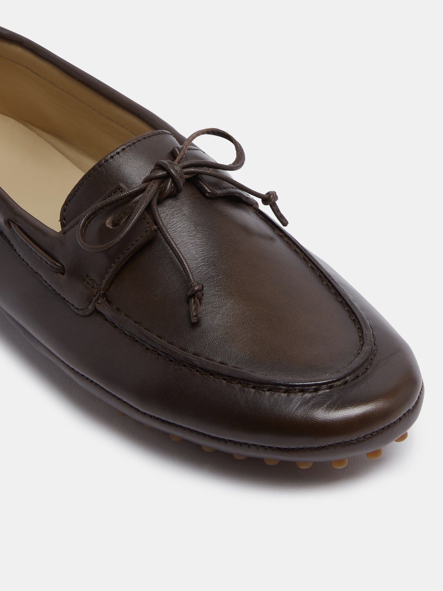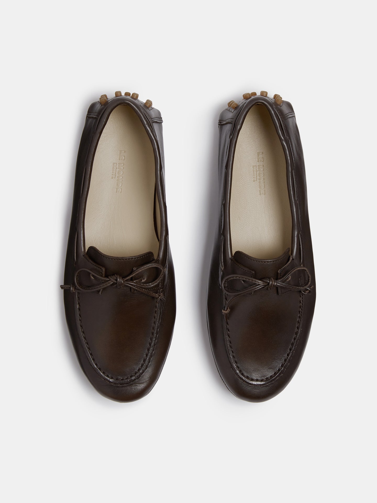 Put your foot on the pedal with the Driver Moccasin in chocolate calf leather. Featuring a cushioned calf leather insole and rubber pebble sole with a 8mm heel. Made in Italy.