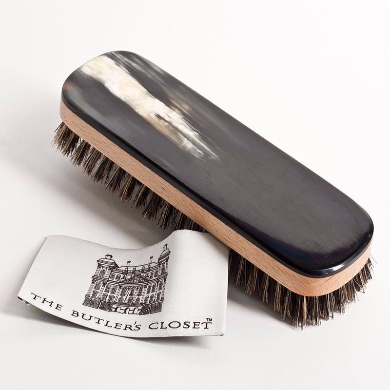 This English Horn Clothes Brush is handcrafted from natural materials. Boar bristles gently raise fibers on fabrics to loosen and remove dust. Dry cleaning too often can damage fabrics and shorten the life of your wardrobe. Brush your clothes before returning them to the closet.
