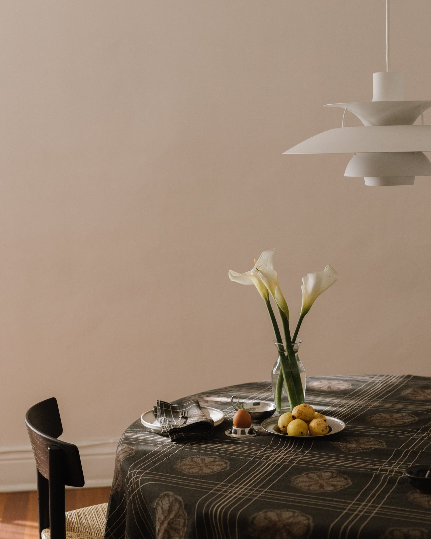 Autumn Sonata's most geometric print is inspired by the Japanese tradition of egasuri, or "picture kasuri," a weaving technique named for its naturalistic motifs — in this case, a repeated floral medallion. The washed Italian linen featured in this tablecloth creates a soft, durable, and luxurious canvas out of your table.