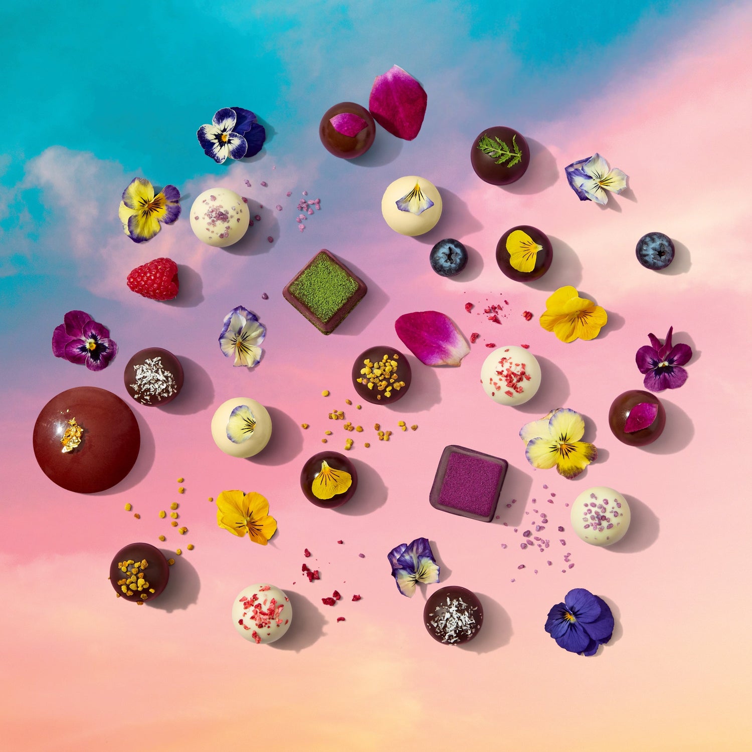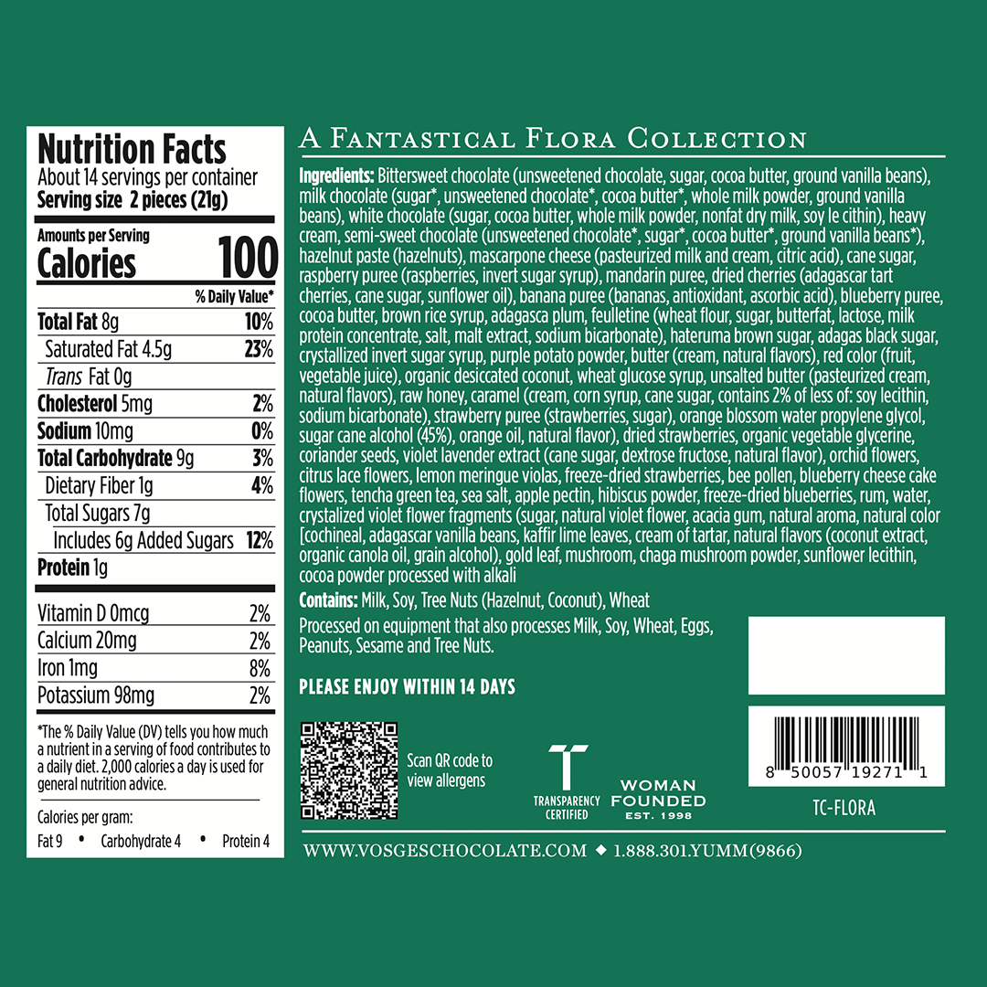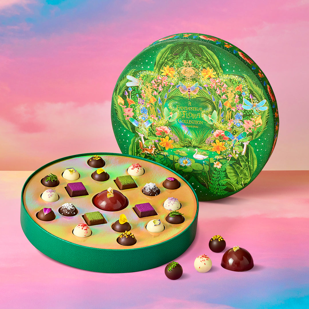The Fantastical Flora Truffle Ensemble celebrates seasonal flowers, fruits and plants from all over the world. Each ingredient uses its magic to evoke nostalgia and, in every bite, remind us that renewal is always possible. For this collection, the focus is on tried and true favorites like I.G.P. Piemonte hazelnuts, Mirabelle plums, Appleton Estates rum, candied Violets, and many other Vosges staples to inspire this season of new beginnings.