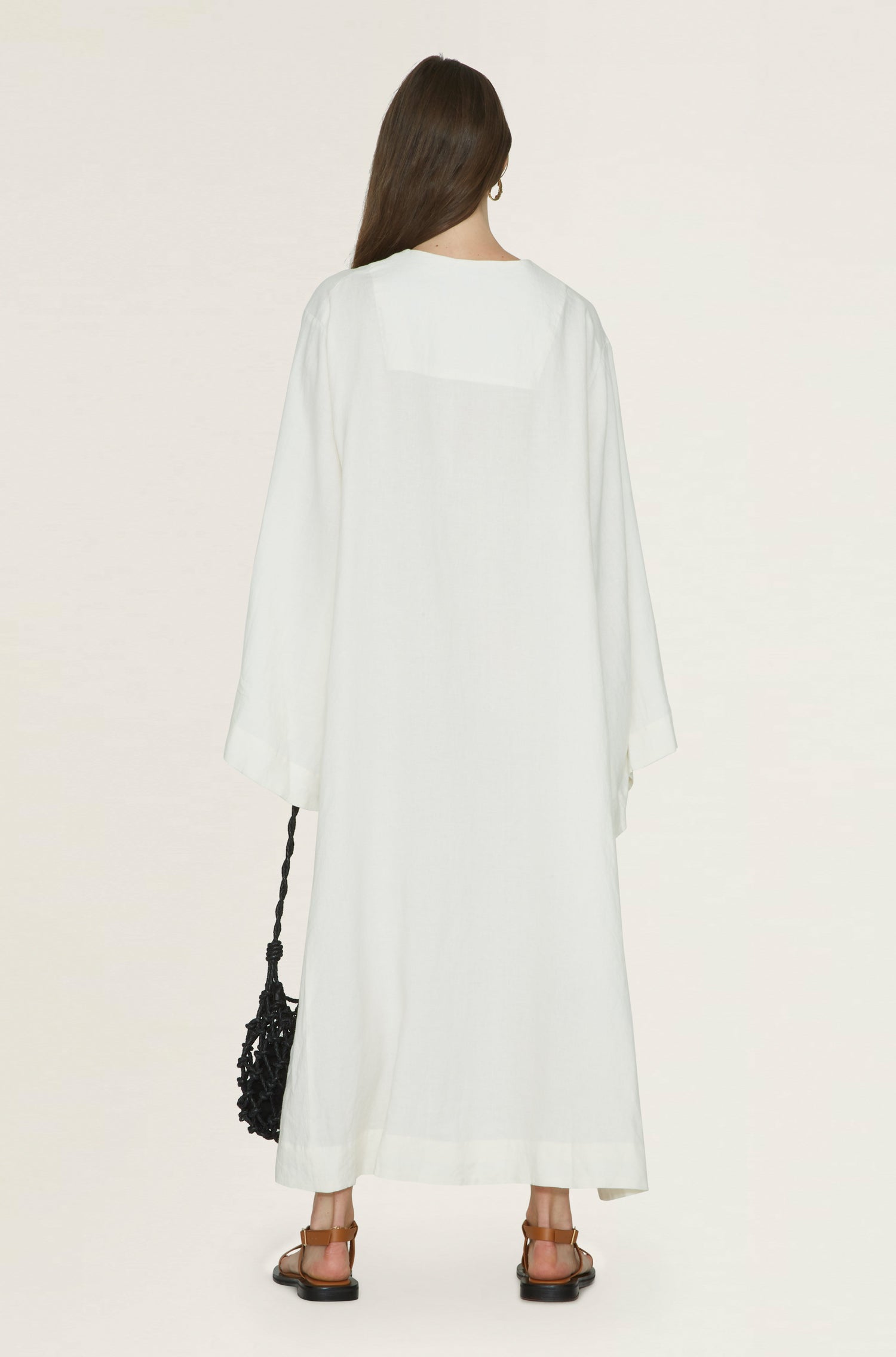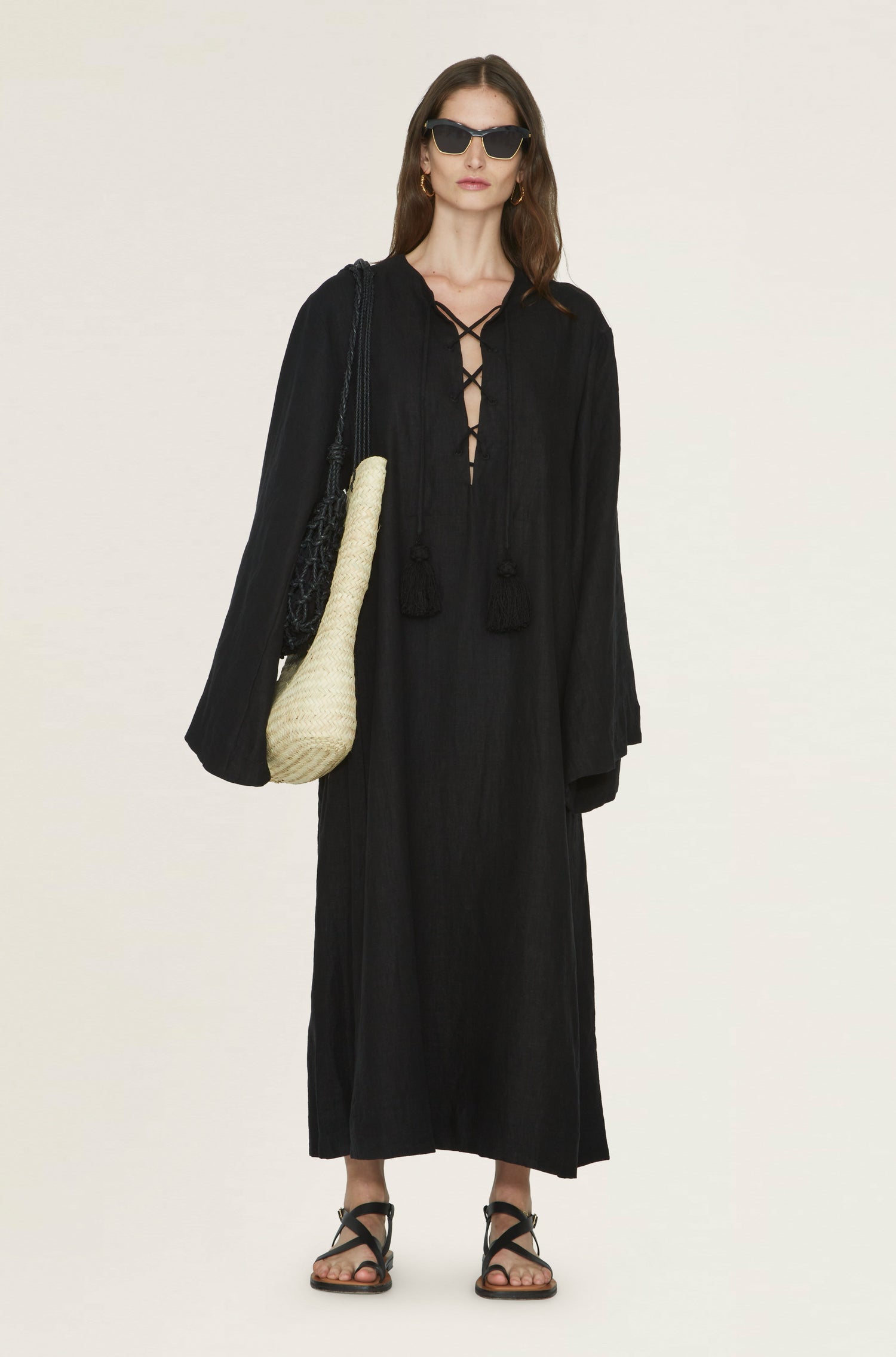 Fil De Vie's linen Lilith Caftan offers a spacious silhouette accented with flared sleeves, extra-long tassels, and a crisscrossing lace-up closure.
