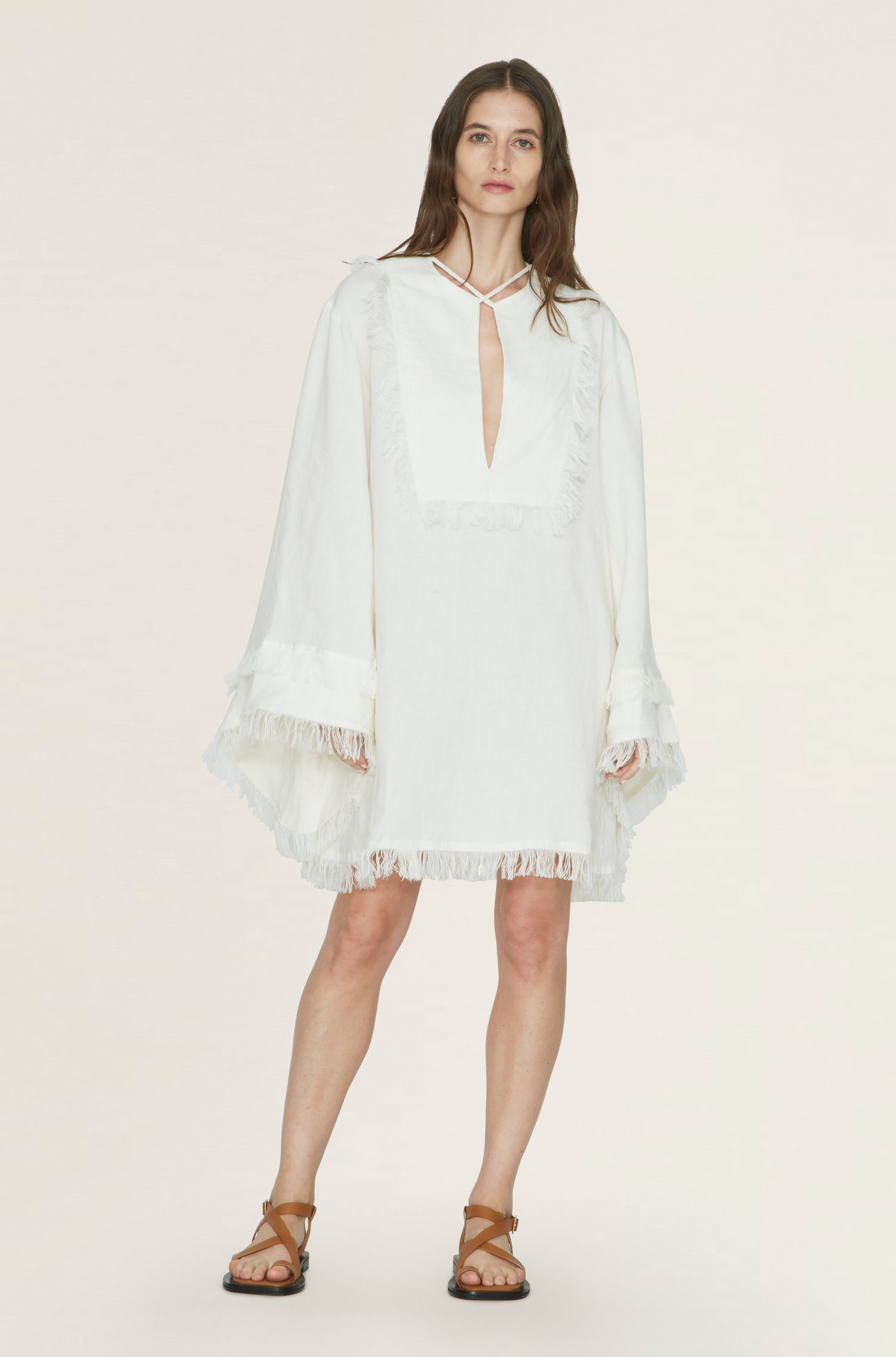 Fil de Vie's voluminous linen caftan features cotton fringe hems, bell-shaped sleeves, and airy side vents.