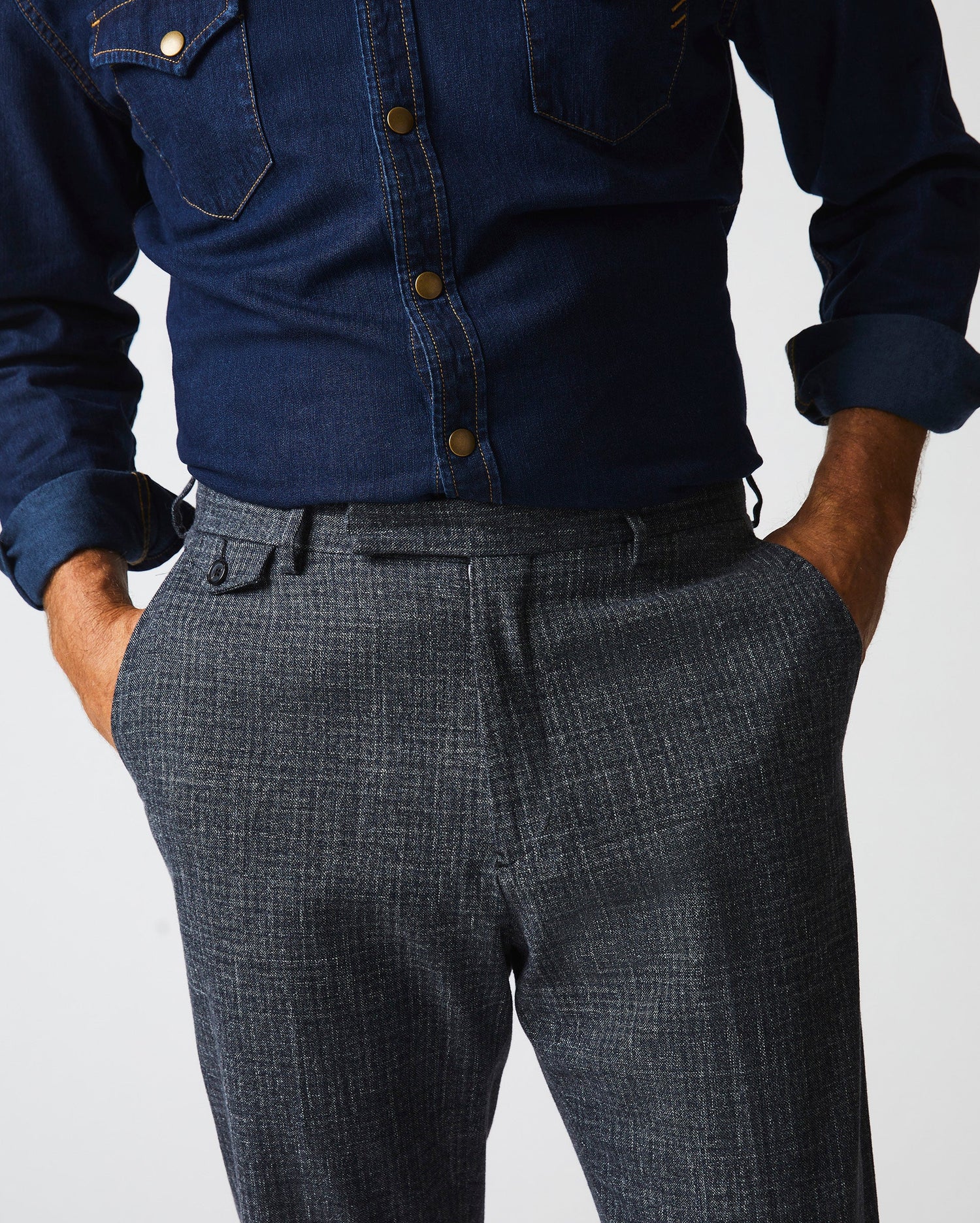 This trouser is slim fit through the hip and thigh with a slim leg. Size up for a more relaxed fit. Fully customizable fit when working with a tailor.