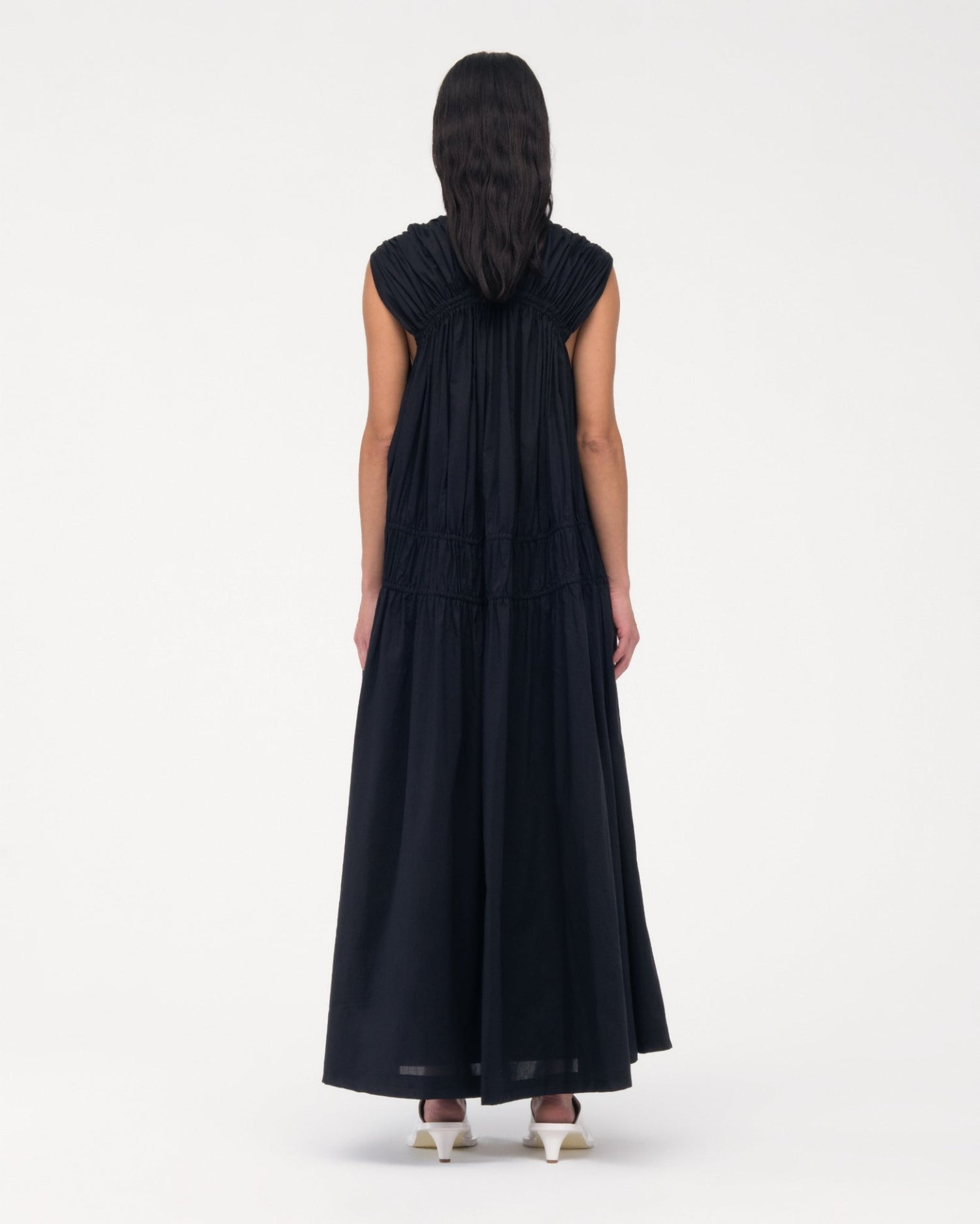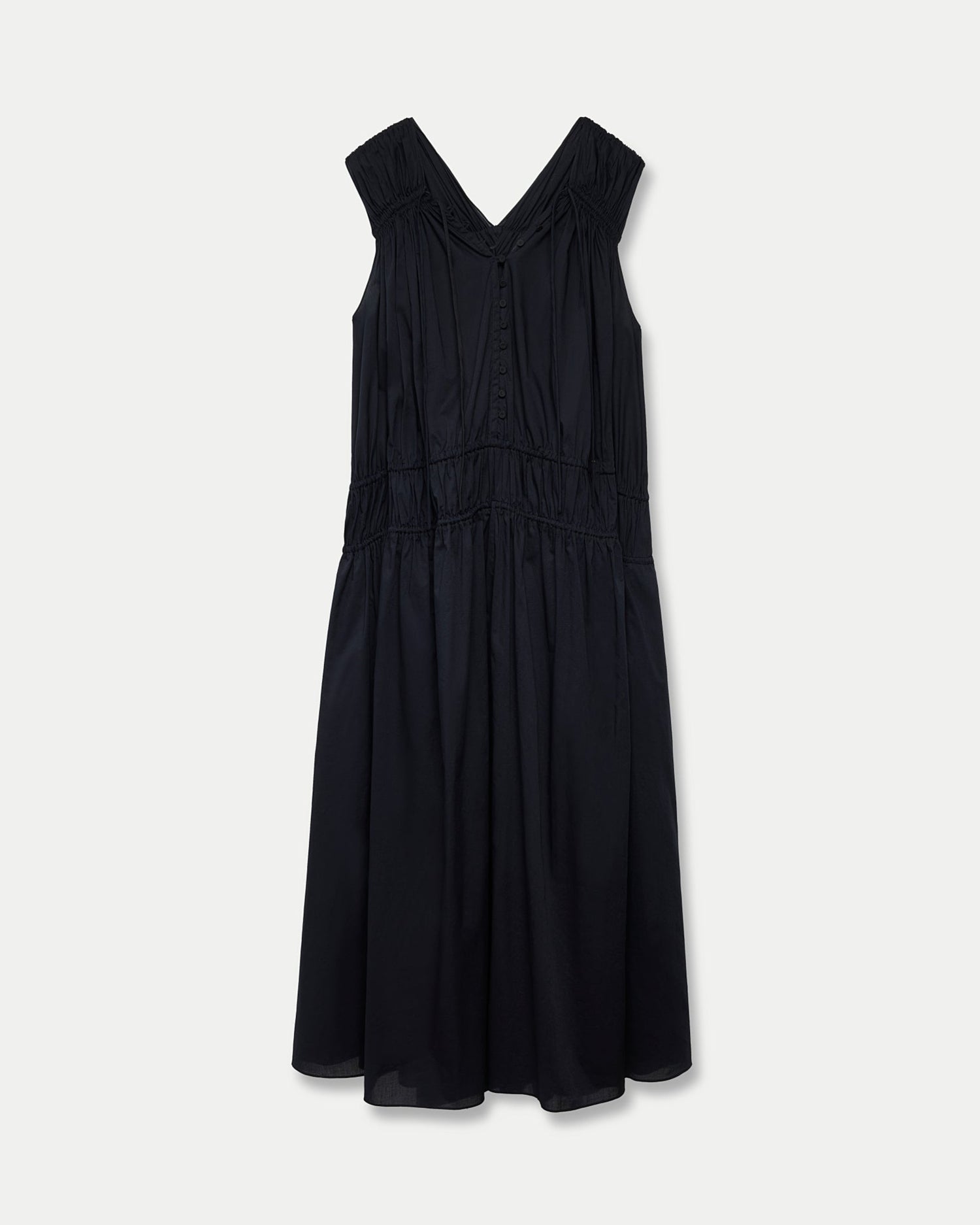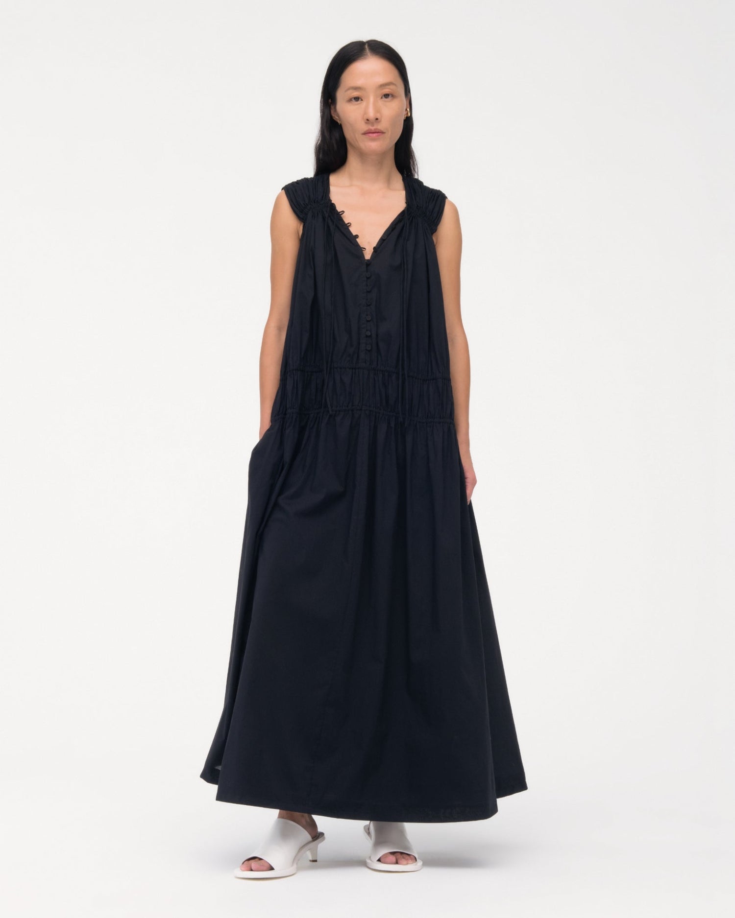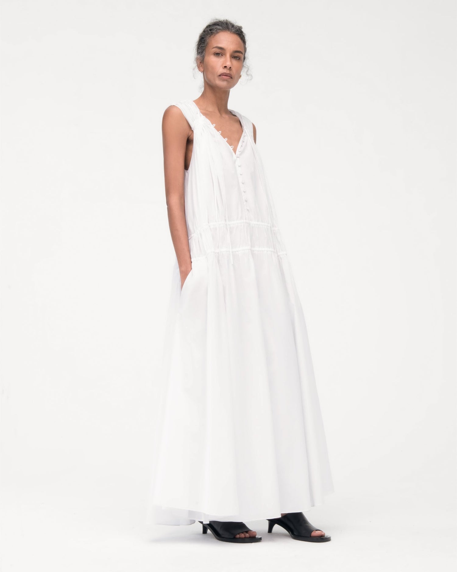 The gathered skirt of this dress is expansive and voluminous, falling to the ankle. With texture along the whole body and adjustable shirring at the shoulders. Features a removable interior slip.