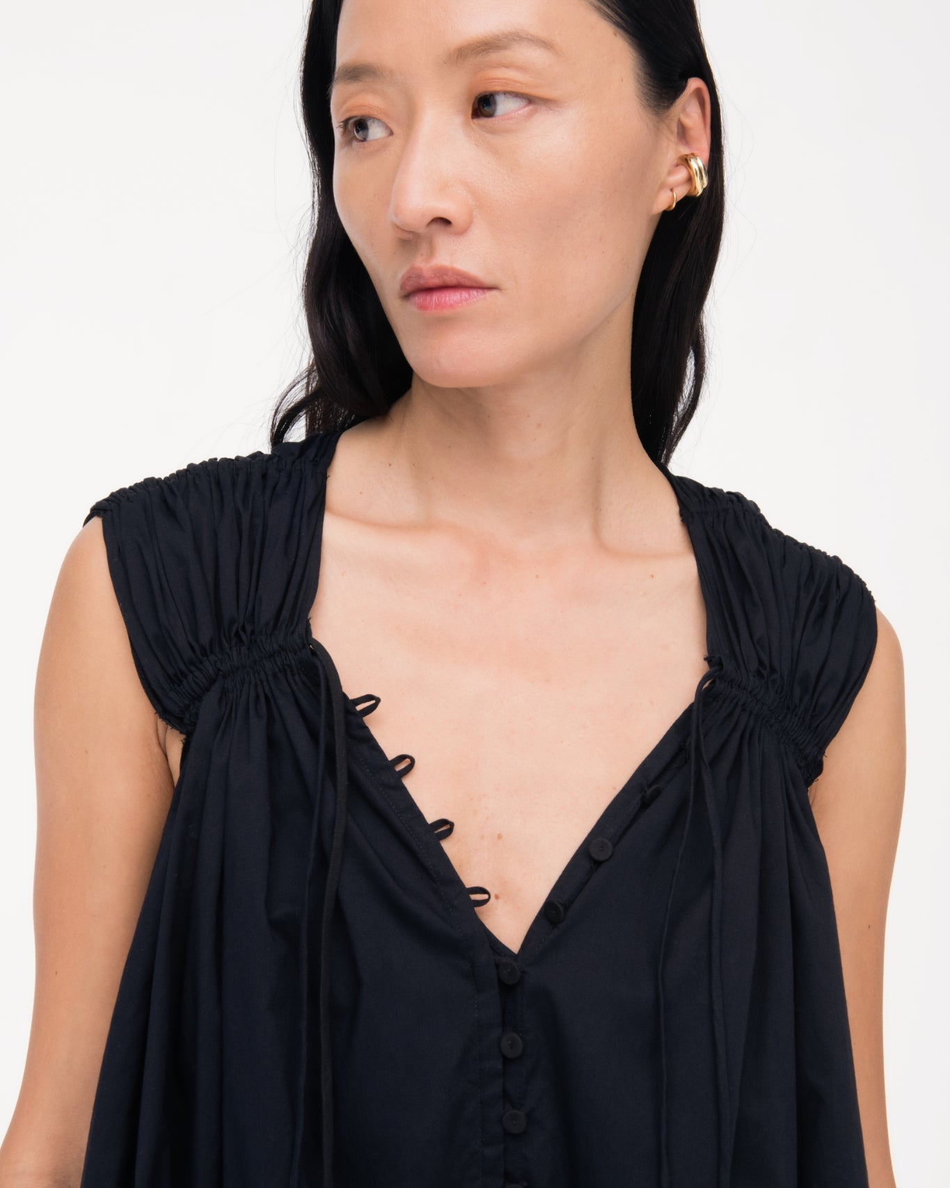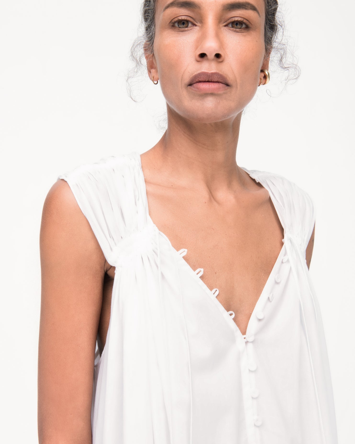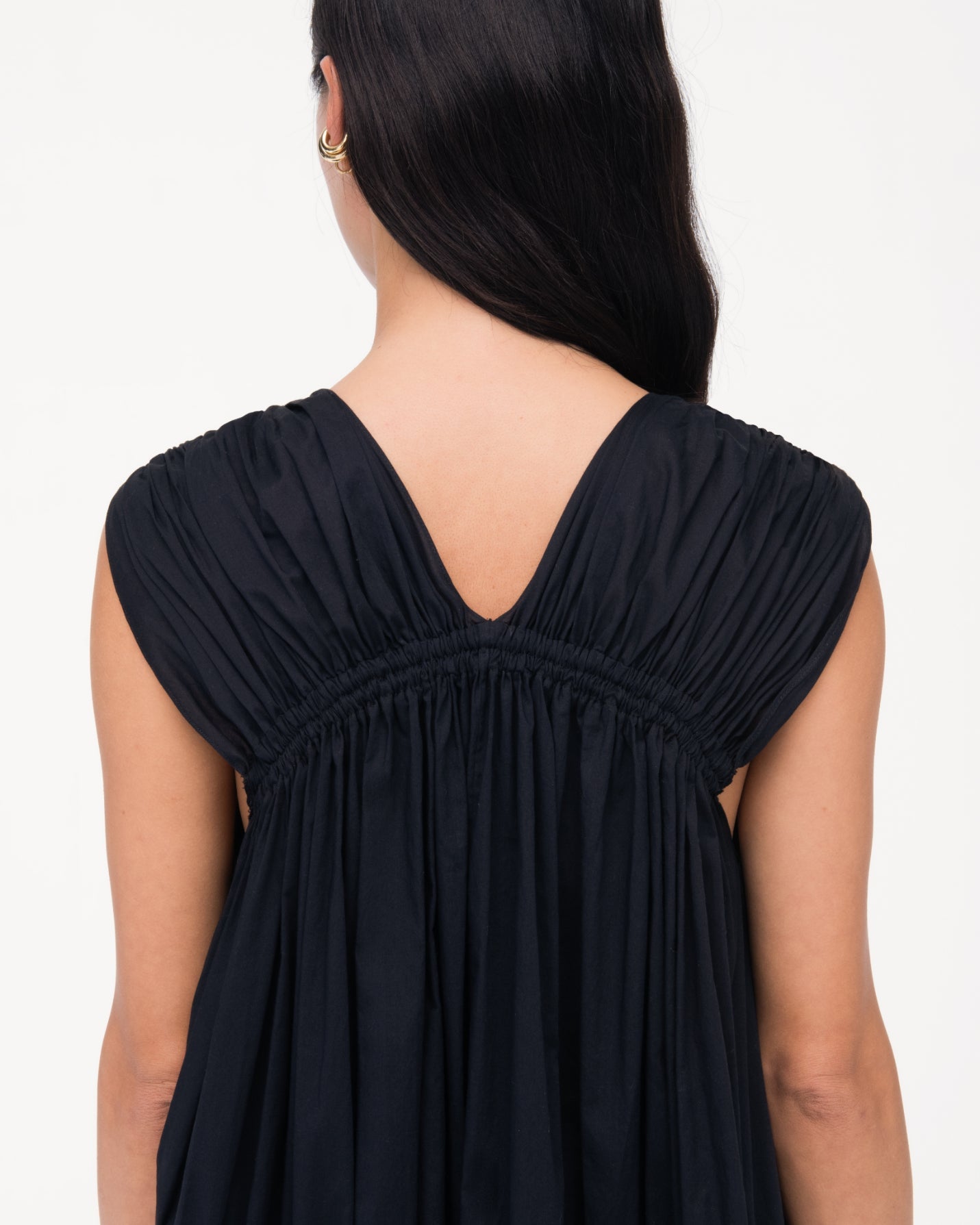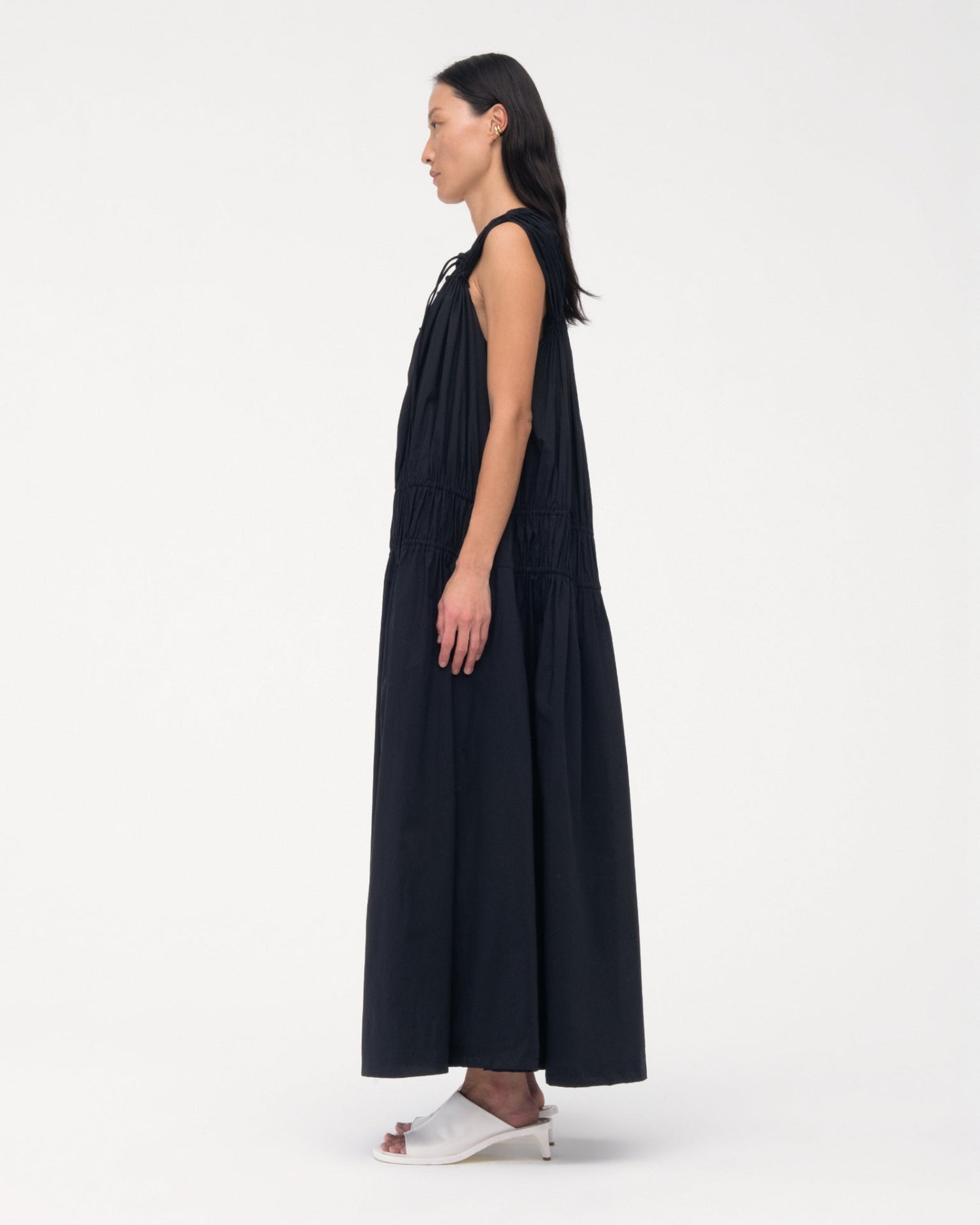 The gathered skirt of this dress is expansive and voluminous, falling to the ankle. With texture along the whole body and adjustable shirring at the shoulders. Features a removable interior slip.