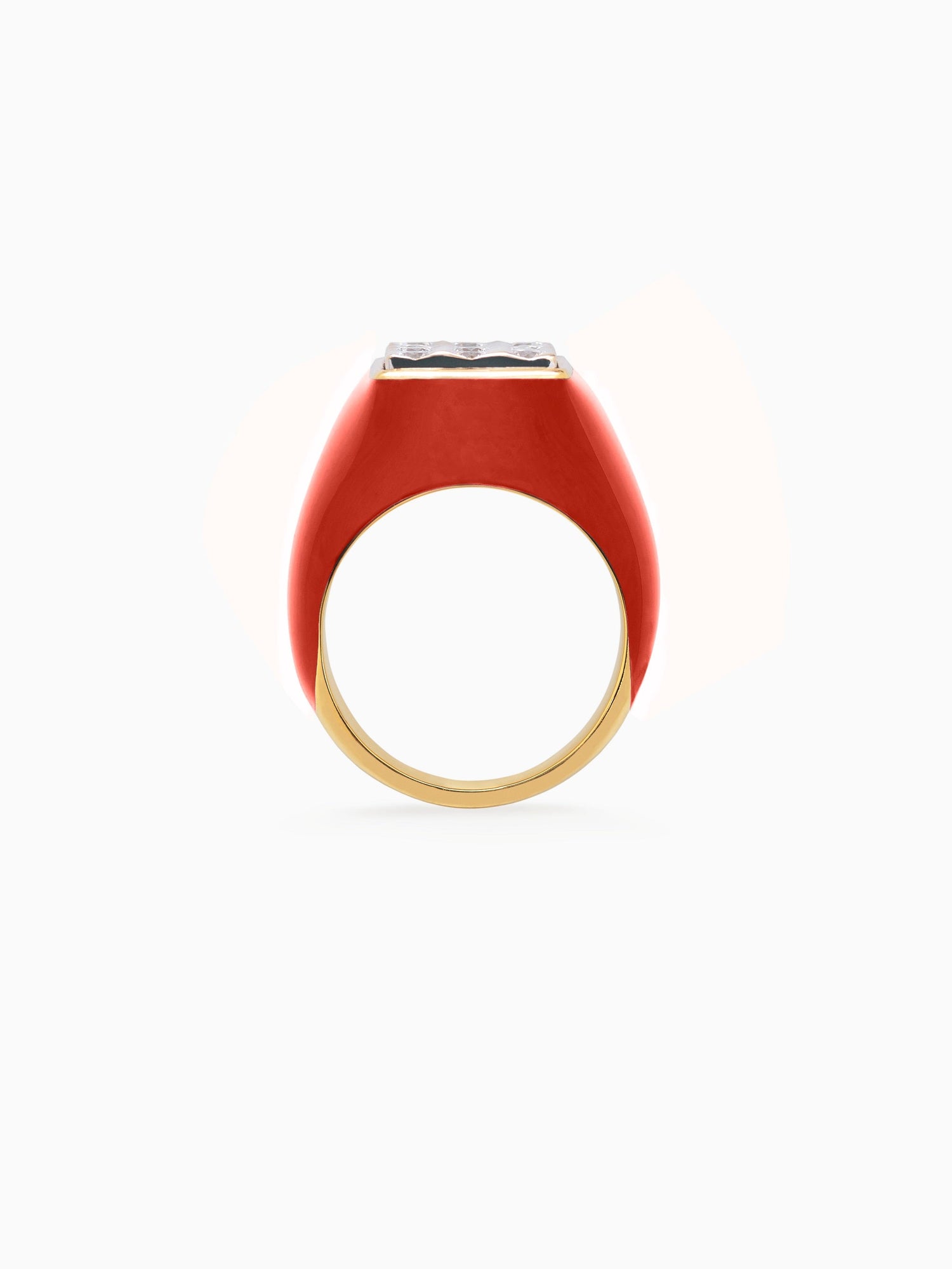 The Tuxedo Ring is crafted with a deep red enamel detailing and 12 brilliant-cut pave set diamonds within a pure gold geometric square design.