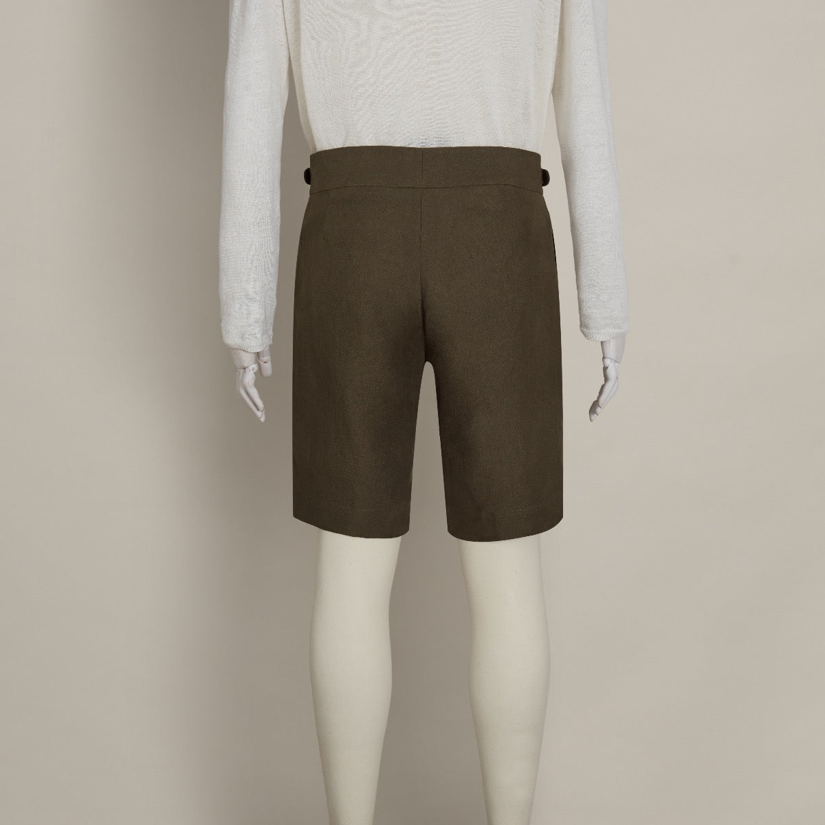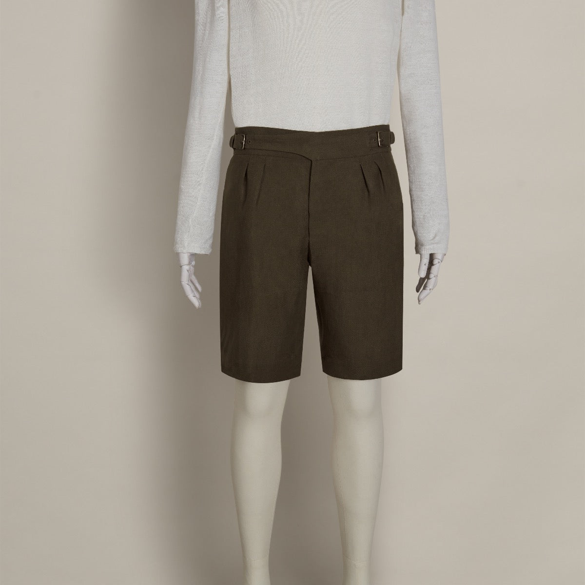 The Irish Linen Gurkha Shorts in Khaki are a timeless warm-weather staple, blending classic military-inspired tailoring with breathable comfort. Made in Italy from lightweight Irish linen, they feature a high-rise waist, double pleats, and adjustable side tabs for a clean, tailored fit. The khaki shade adds versatile, easygoing elegance—ideal for everything from relaxed weekends to smart summer outings.