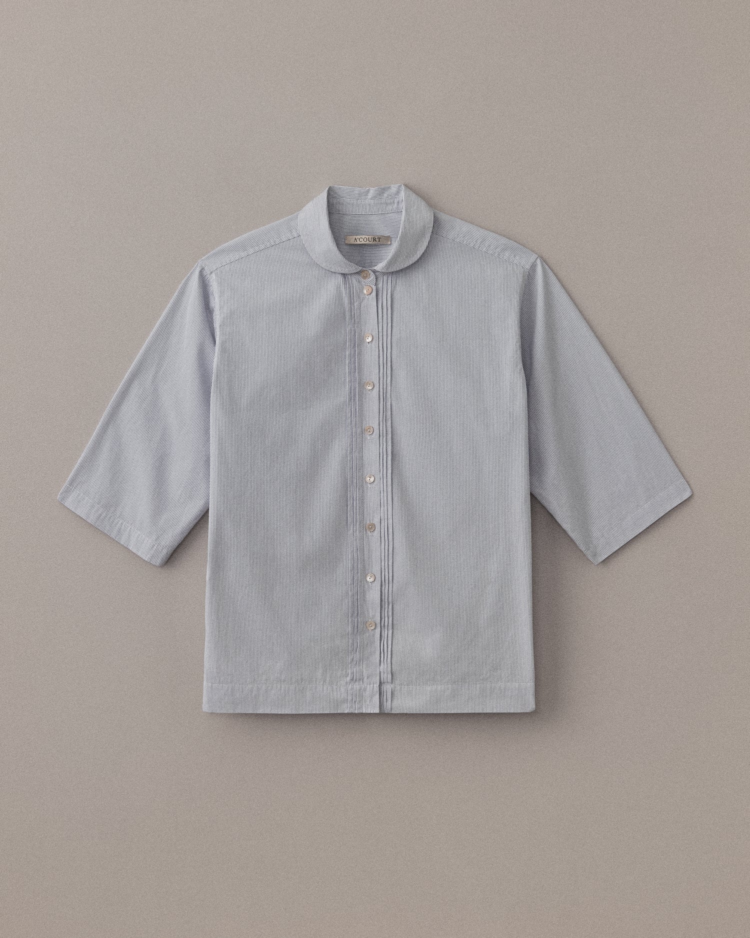 Rounded collar and crisp pin tucks framing the placket
