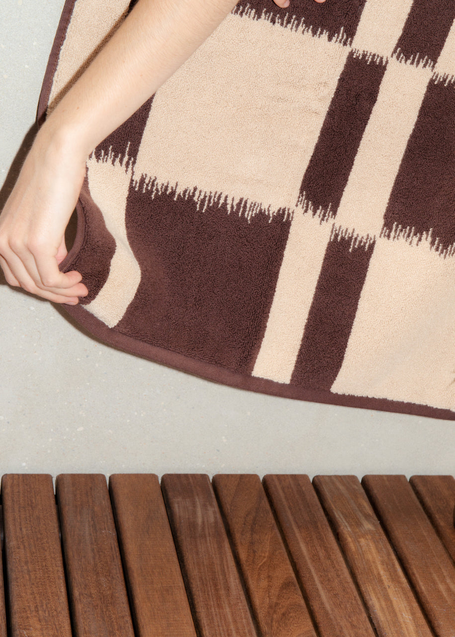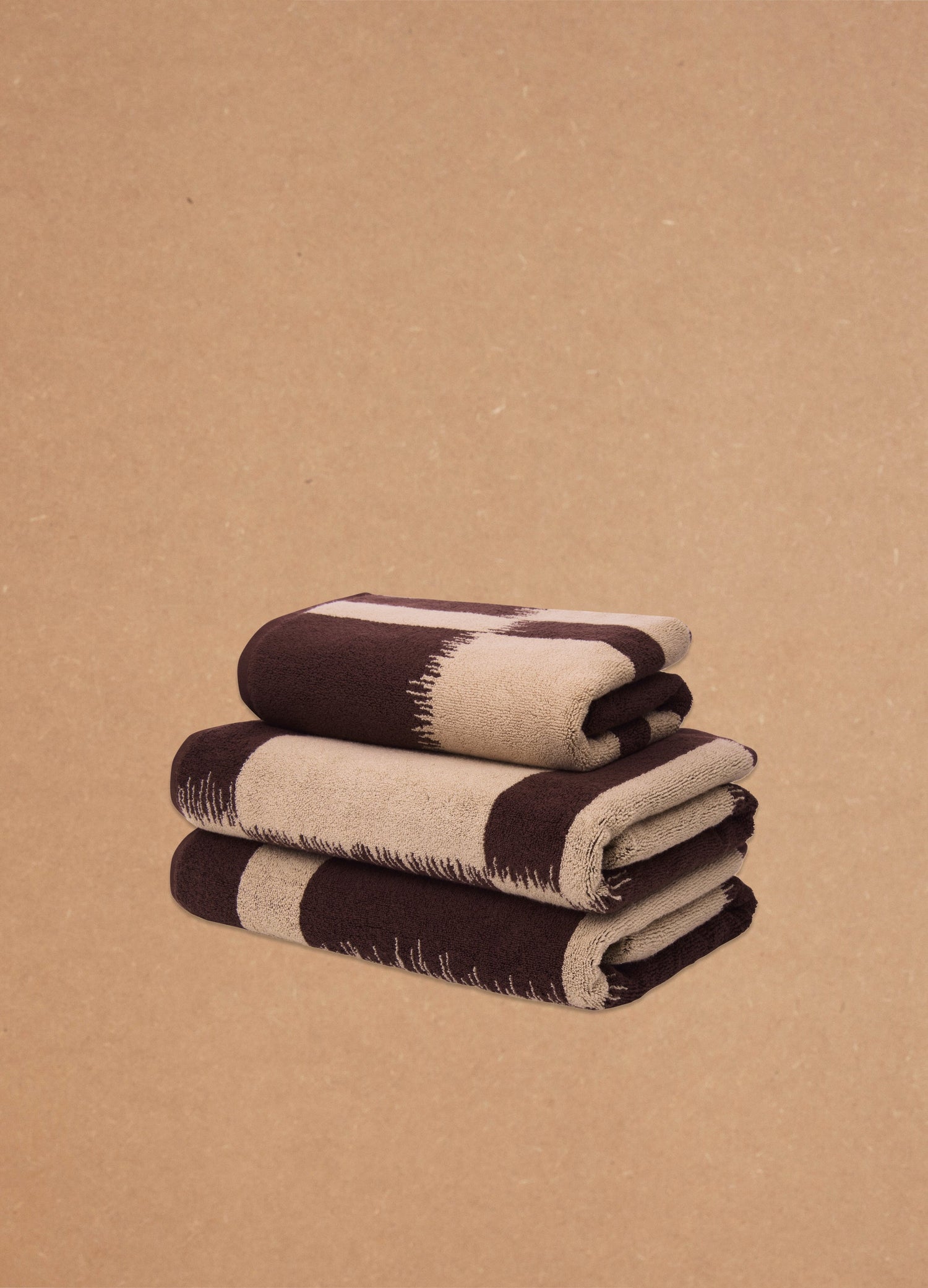 Inspired by traditional Ikat weaving techniques, this ultra-sophisticated set is fully reversible. The artisanal pattern is comprised of two tones in a low-key landscape of walnut and ecru. The generous double yarn is gratifyingly durable and maximizes comfort. This set absorbs and dries with ease thanks to the sumptuous surface area that forms an exceptionally even pile.