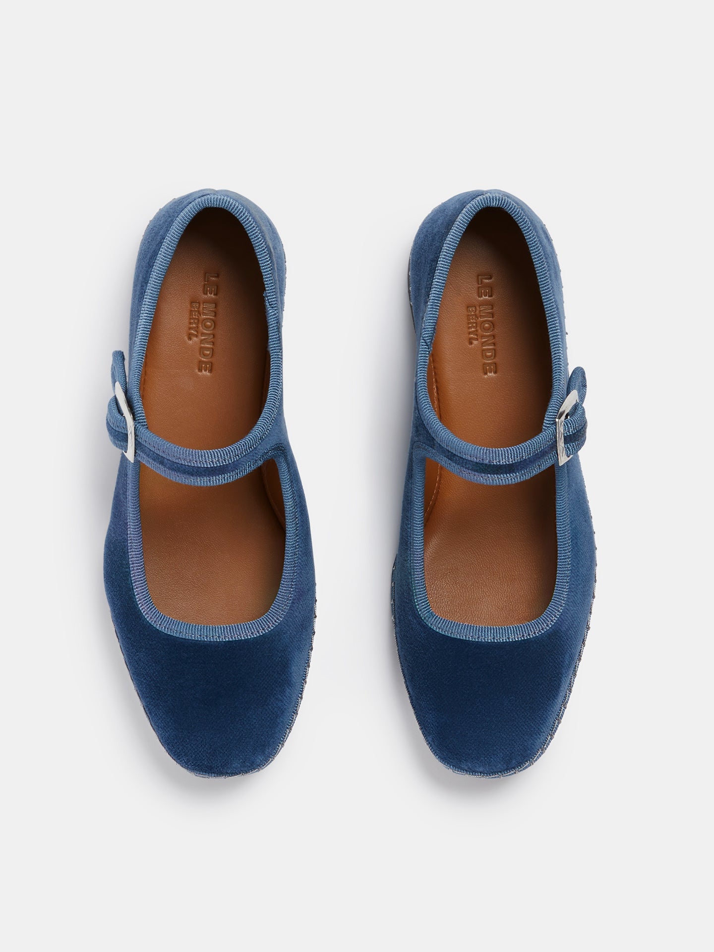 Kids Soft Mary Jane in denim velvet with a buckle, cushioned calf leather insole, and grosgrain piping; hand finished with stitching and rubber soles for a comfortable step.