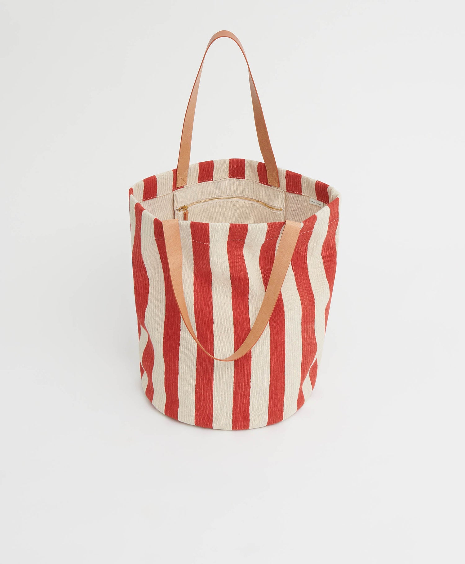 !!!Description---Made from Italian canvas, our limited edition Pascucci Tote features a hand stamped stripe in a beautiful sky blue and watermelon red. Each one of a kind tote has its own unique number on the interior pocket, making it a true collector's item. Finished with an interior pocket and vegetable tanned leather handles, it's the perfect summer tote for the beach and beyond.