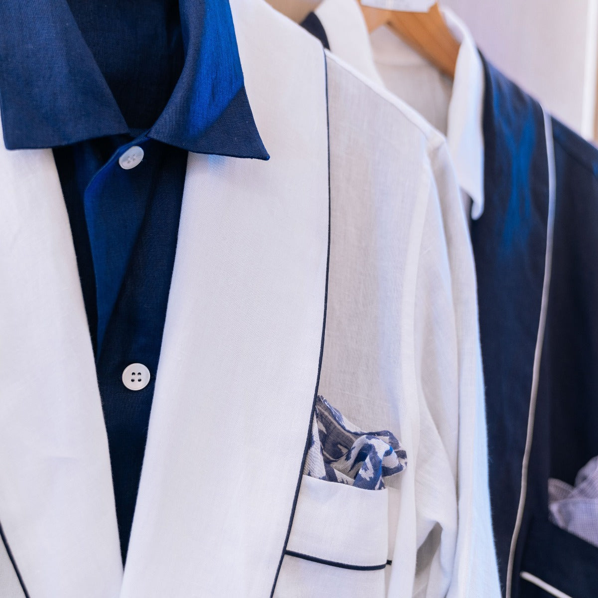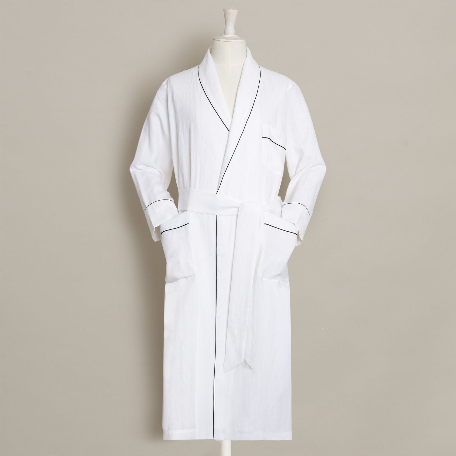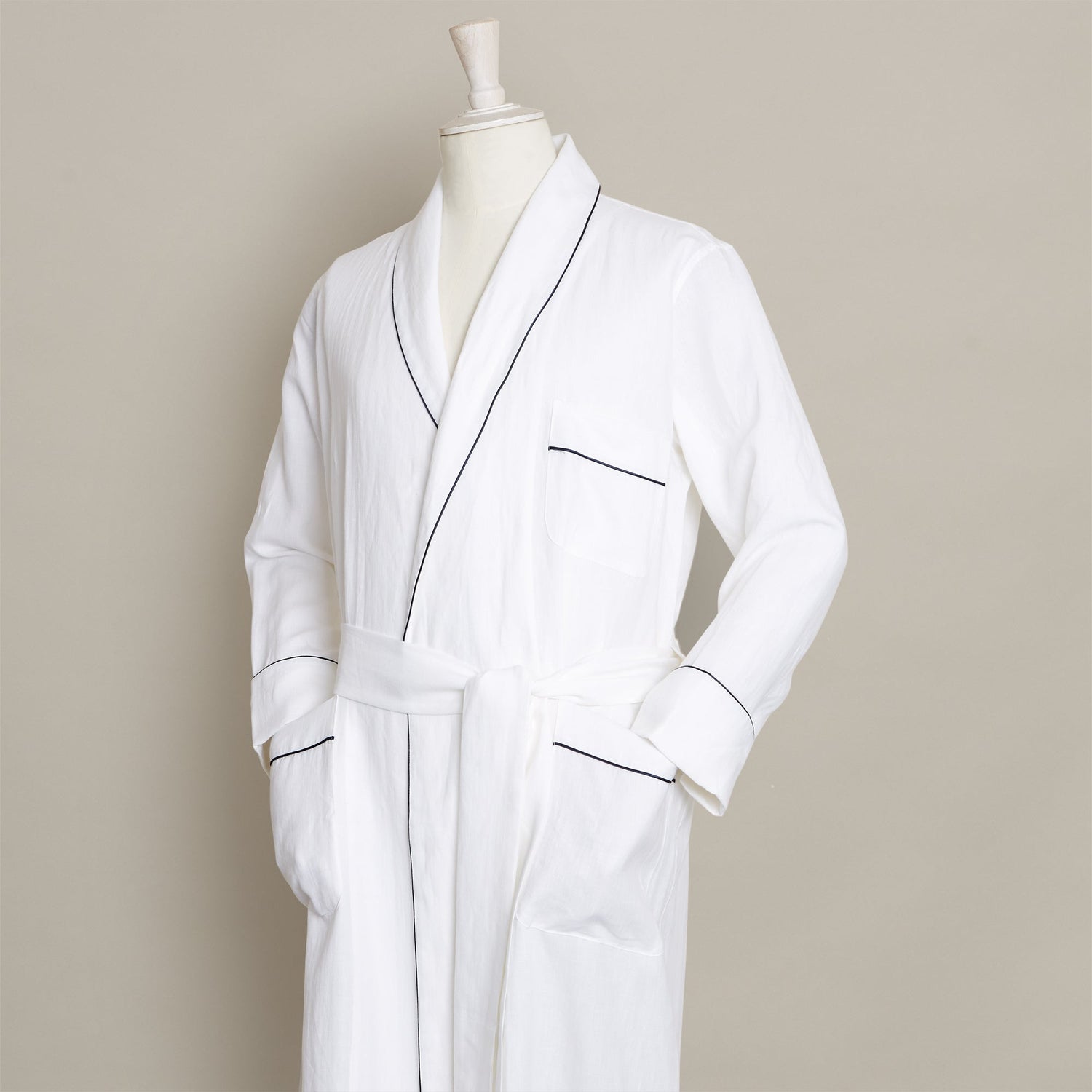 The Anderson & Sheppard Linen Dressing Gown in White is crafted from airy, lightweight linen that drapes effortlessly and grows softer with each wear. Tailored with a relaxed fit, it features a classic shawl collar, three roomy patch pockets, and a self-tie belt with internal ties for a secure wrap. Clean, minimal, and quietly luxurious, it's perfect for warm mornings, unhurried travel, or simply staying in with style.