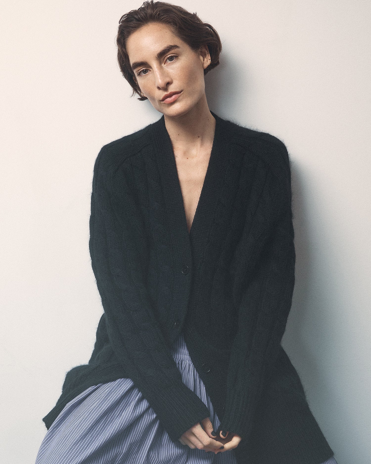 Spun in Italy from an indulgent eight-ply cashmere blend, the Lou Lou Sweater in Black carries a whisper of mohair for added softness. Its traditional cable-knit pattern nods to heritage craftsmanship, while the relaxed silhouette and mid-length cut make it the ultimate layering piece. Whether slipped over a crisp shirt or worn open with a simple tee, this cardigan lends understated warmth and texture to every ensemble.
