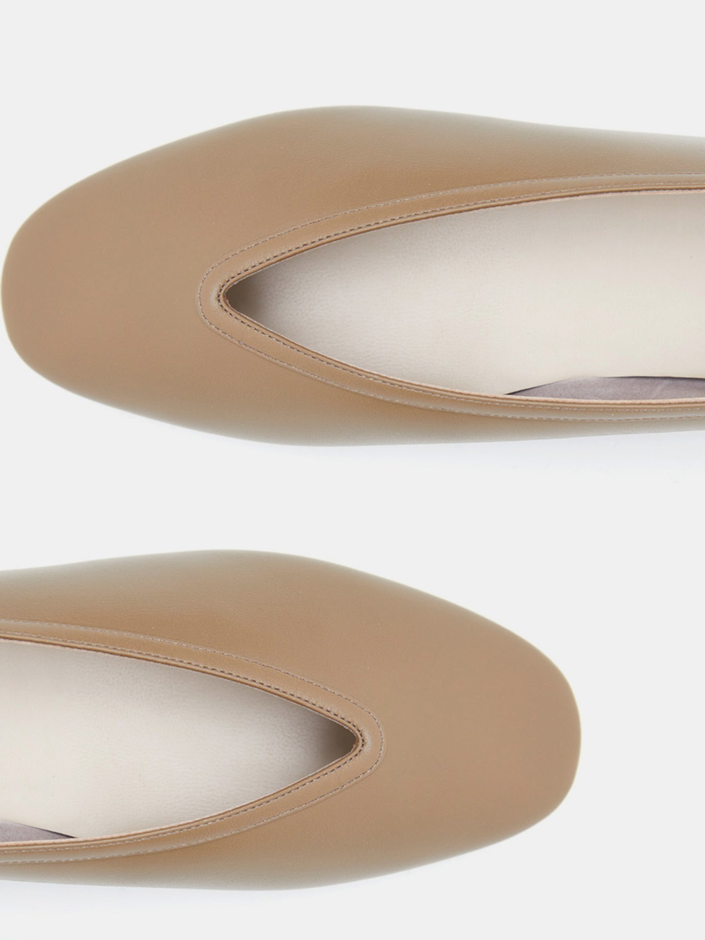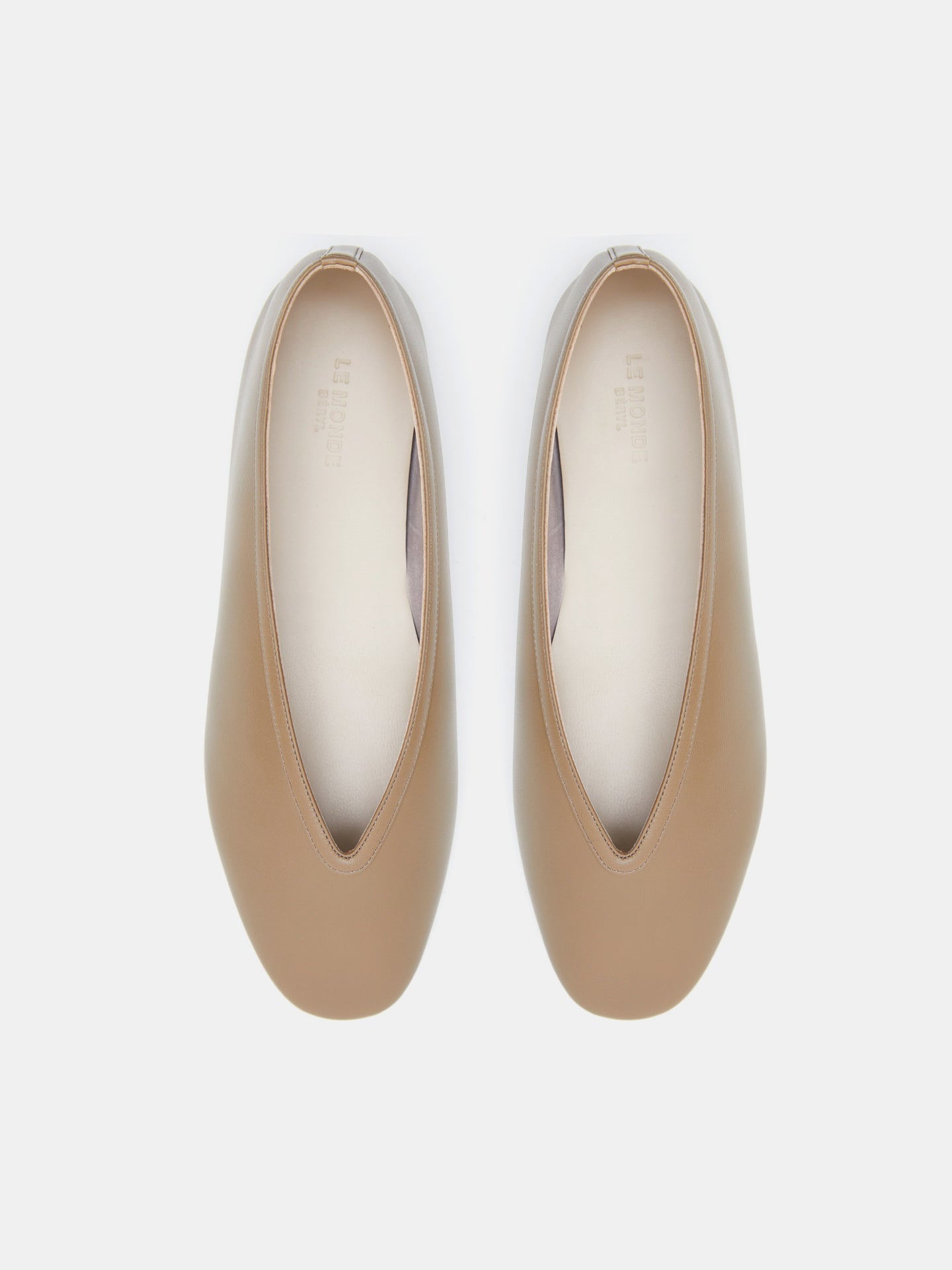 Taupe Luna Slipper in supple, deconstructed leather; a cushioned calf leather insole; and leather piping.