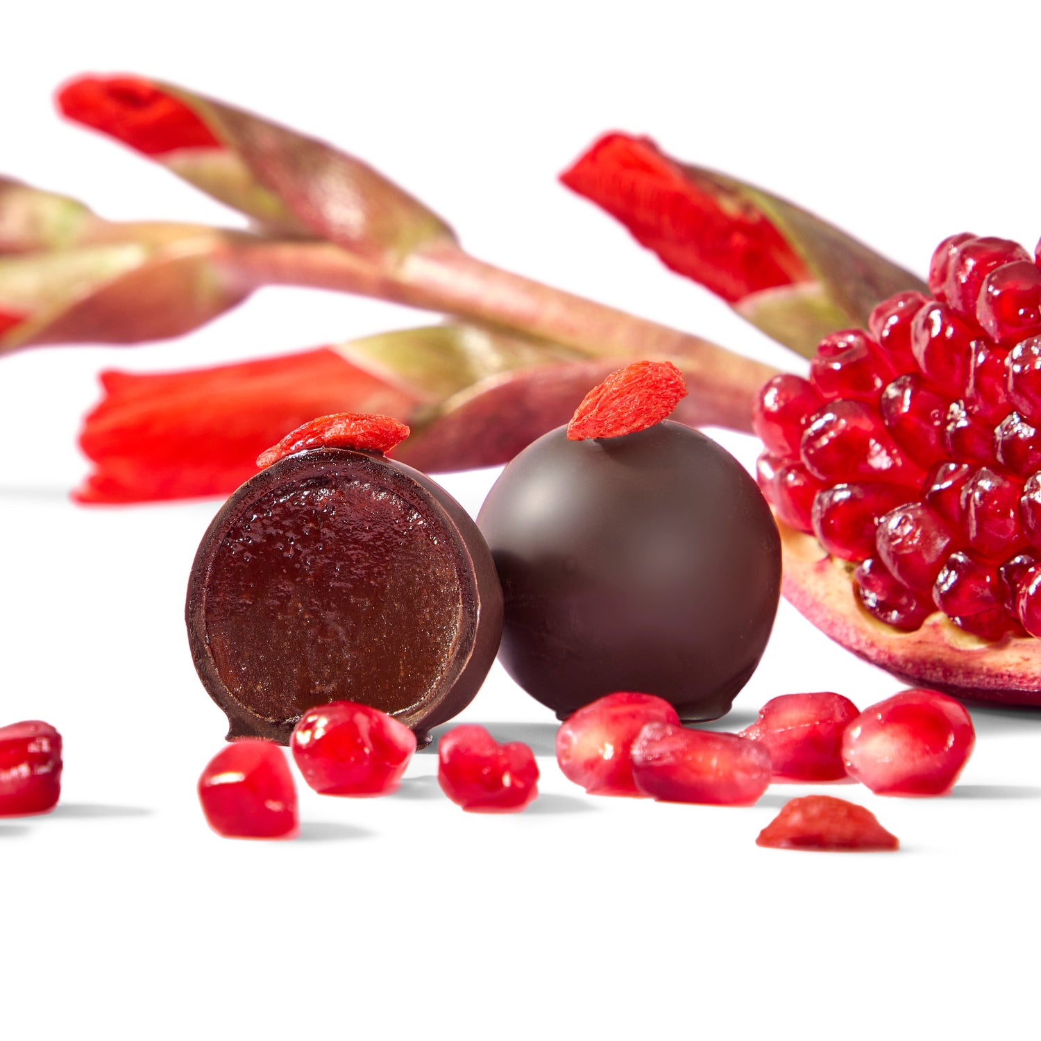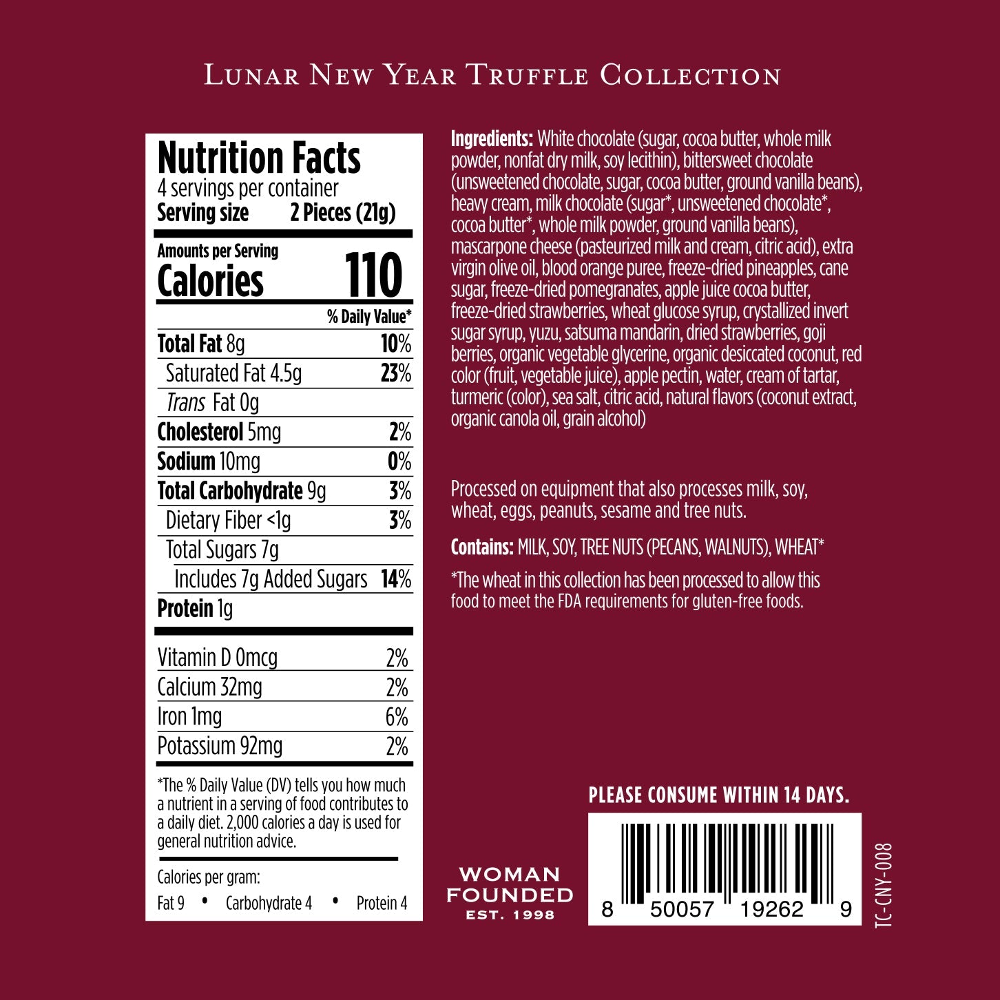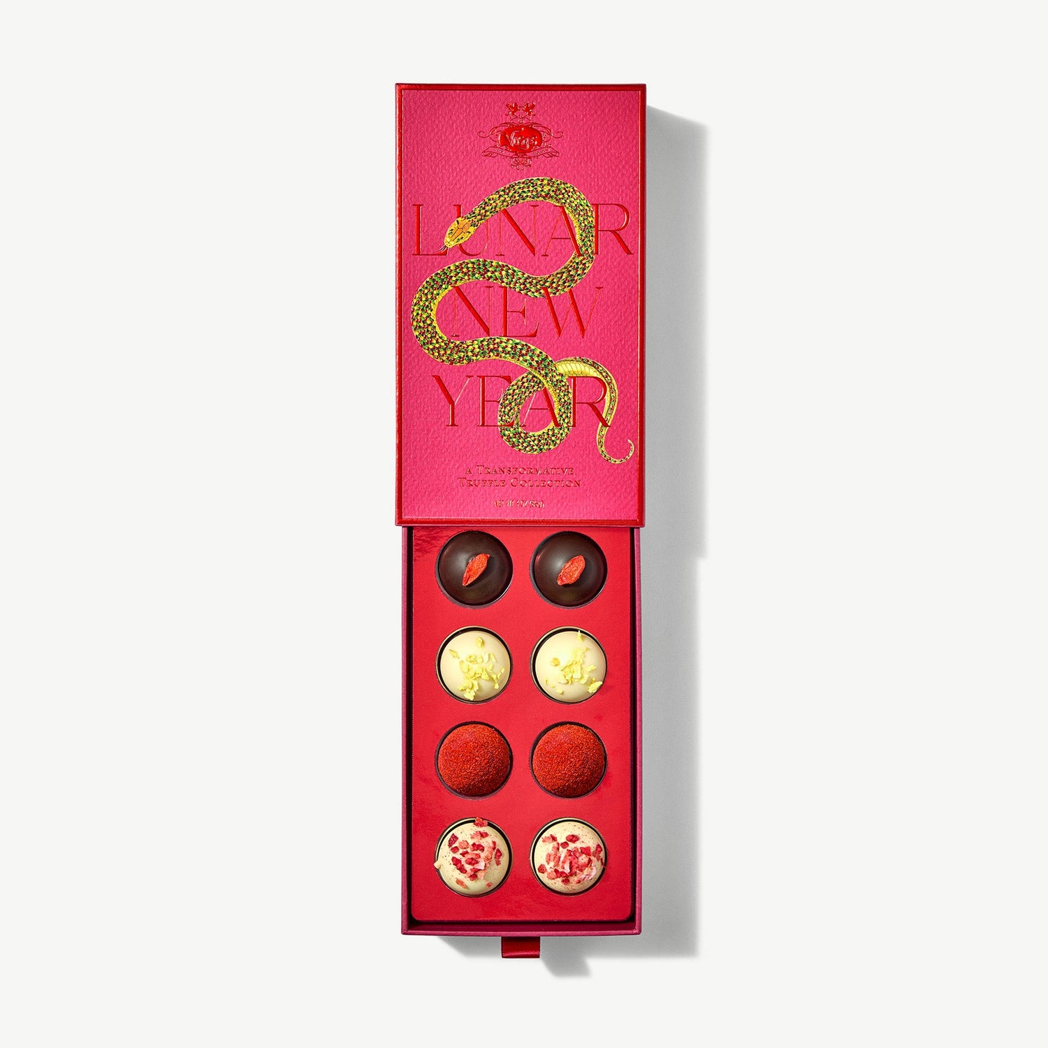 Ring in the Year of the Snake with a transformative truffle collection–a sensory exploration of prosperity, wealth, transformation, and success. Each bite bursts with dark red, juicy blood orange, wild strawberry and tart yuzu, vibrant pineapple, tart pomegranate, and goji berries. A truffle collection to wish good fortune. May you shed the past and rise like the serpent with renewed strength and purpose.