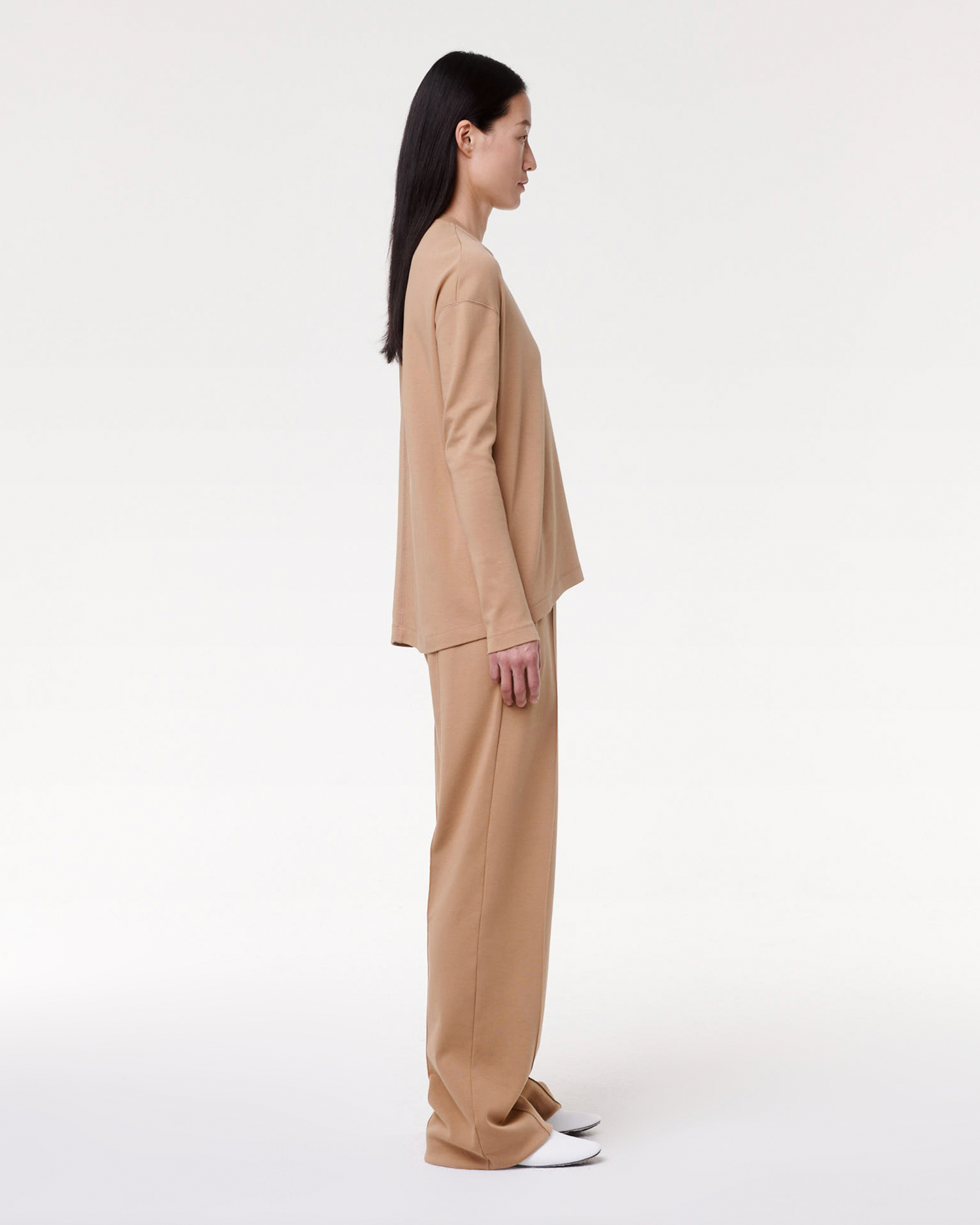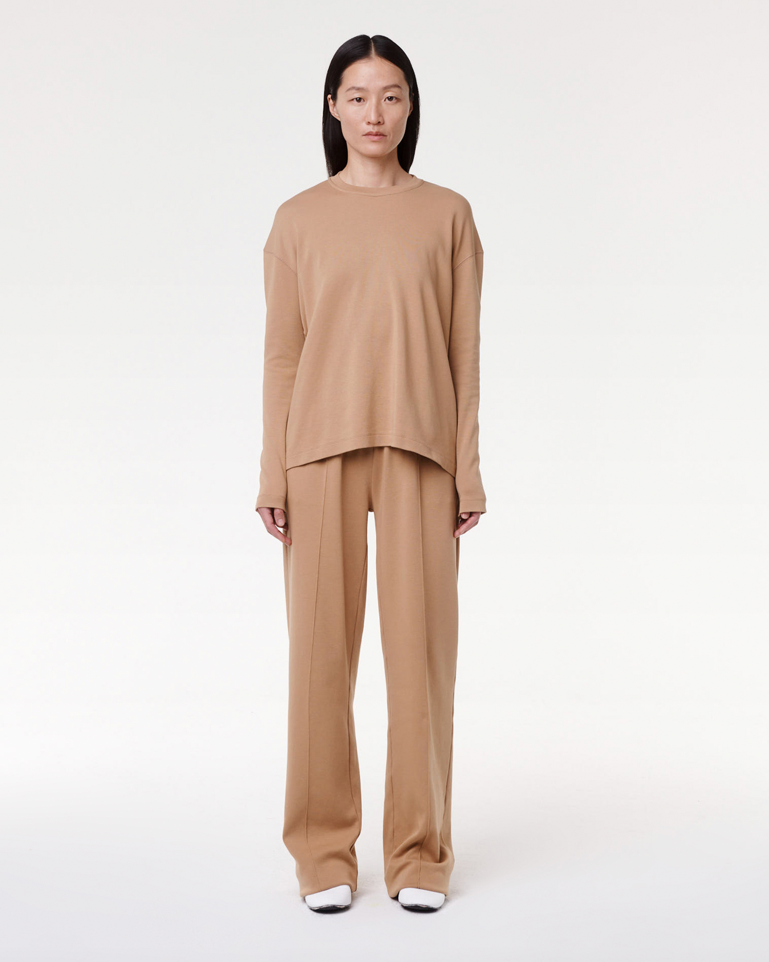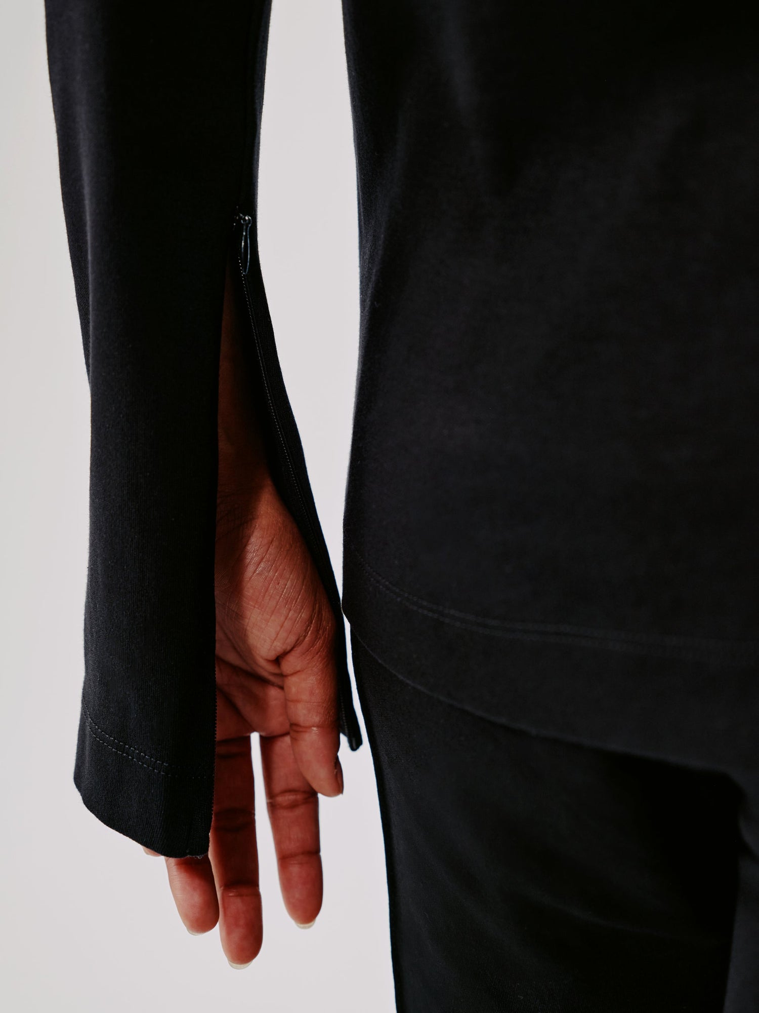 This top has a boxy silhouette, with slim sleeves that can be adjusted with an invisible zipper at the sleeve opening. Finished with a curved hem and a slit detail at the back of the neck.
