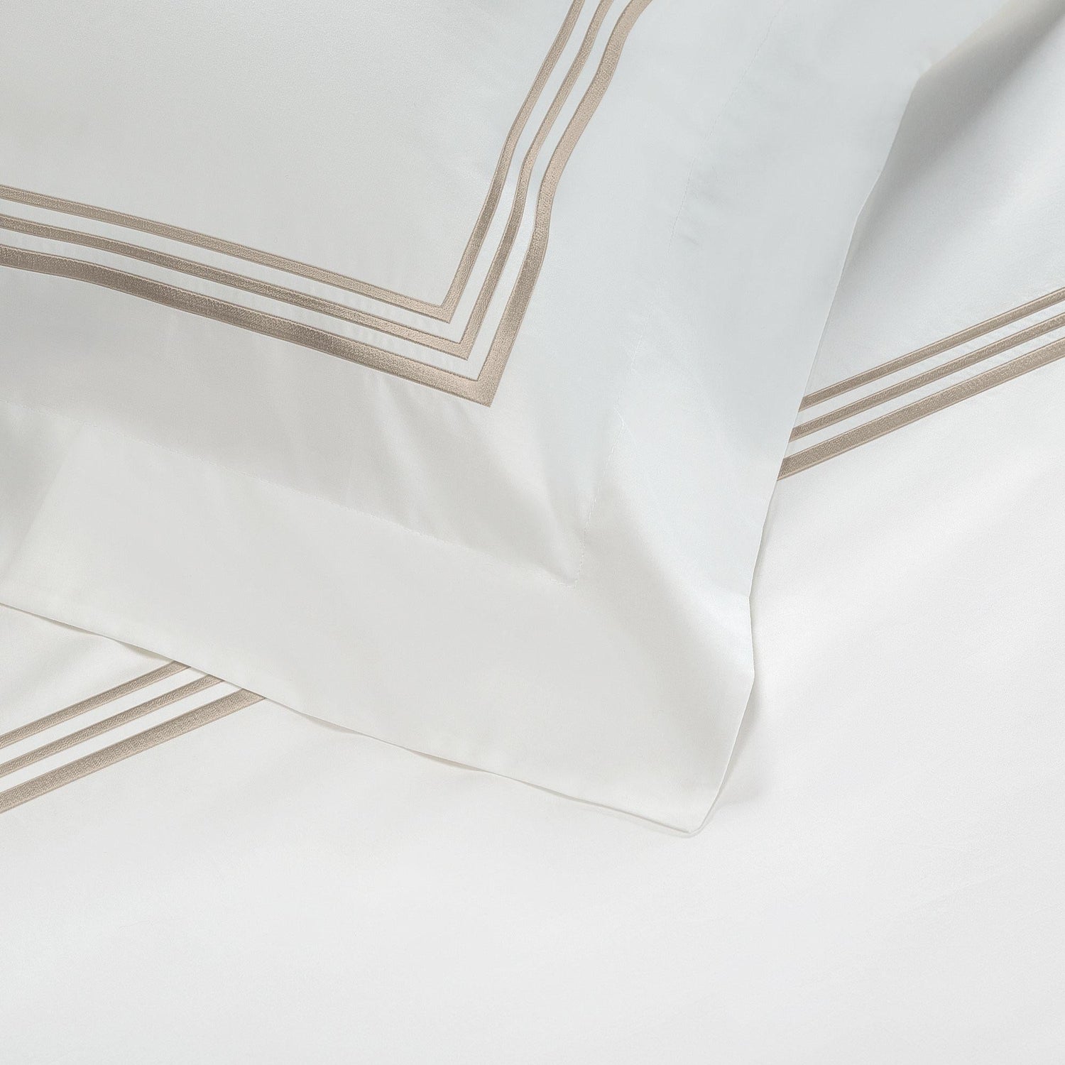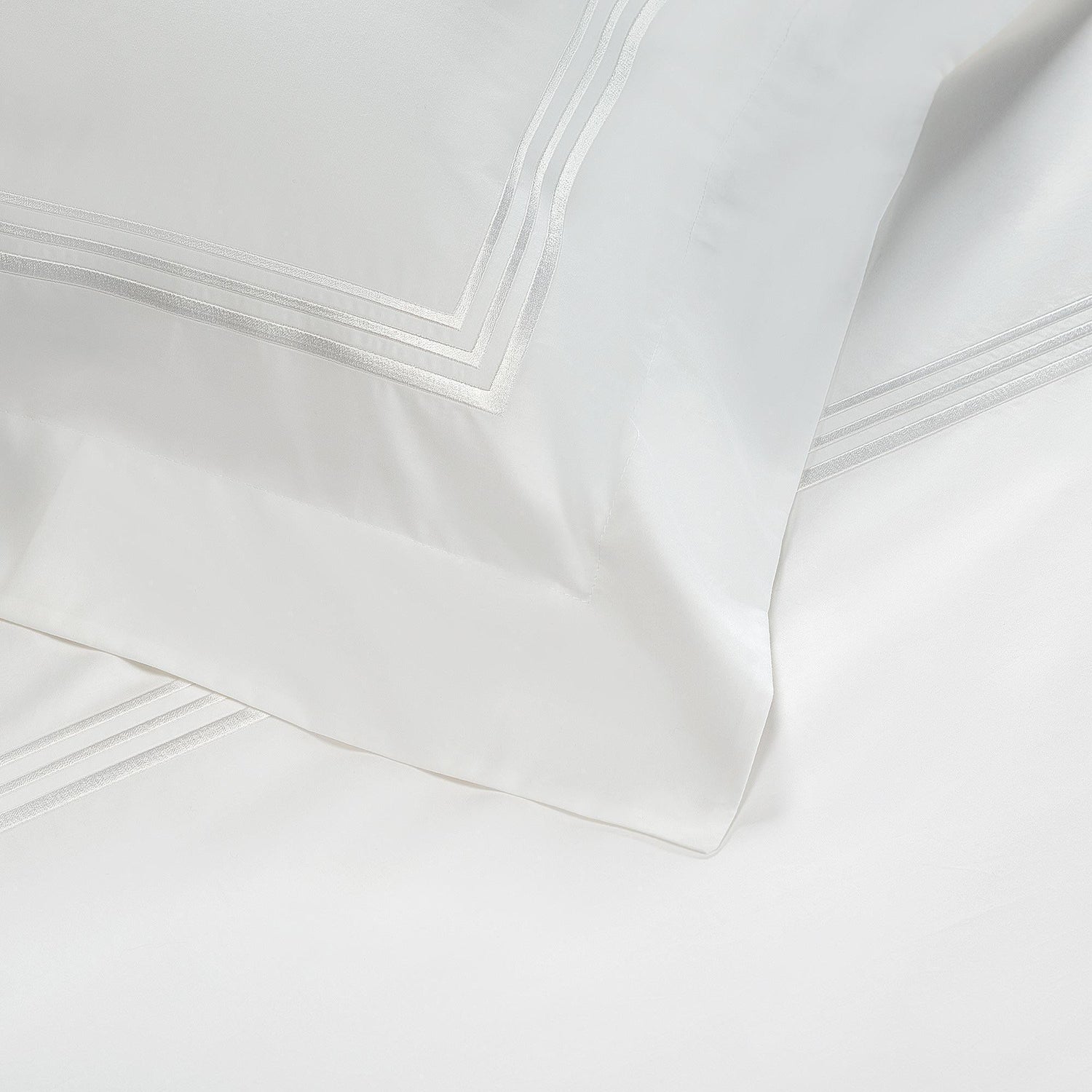 A sham in cotton percale with a three row embroidery. Simple and timeless, this versatile design can be easily paired with any colour or pattern. Standard and king shams are packaged as a set of 2. 100% Egyptian cotton percale. Made in Turkey.