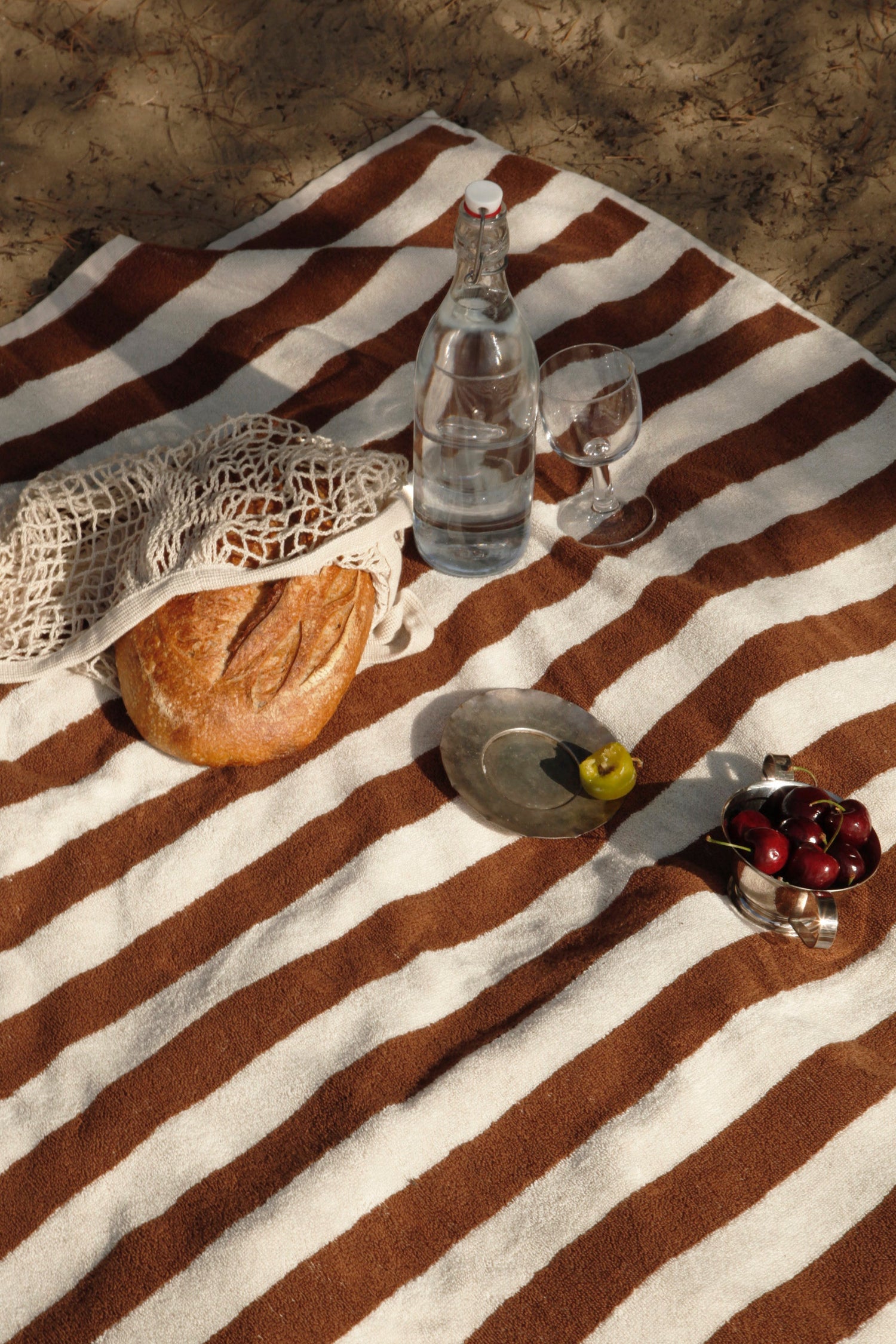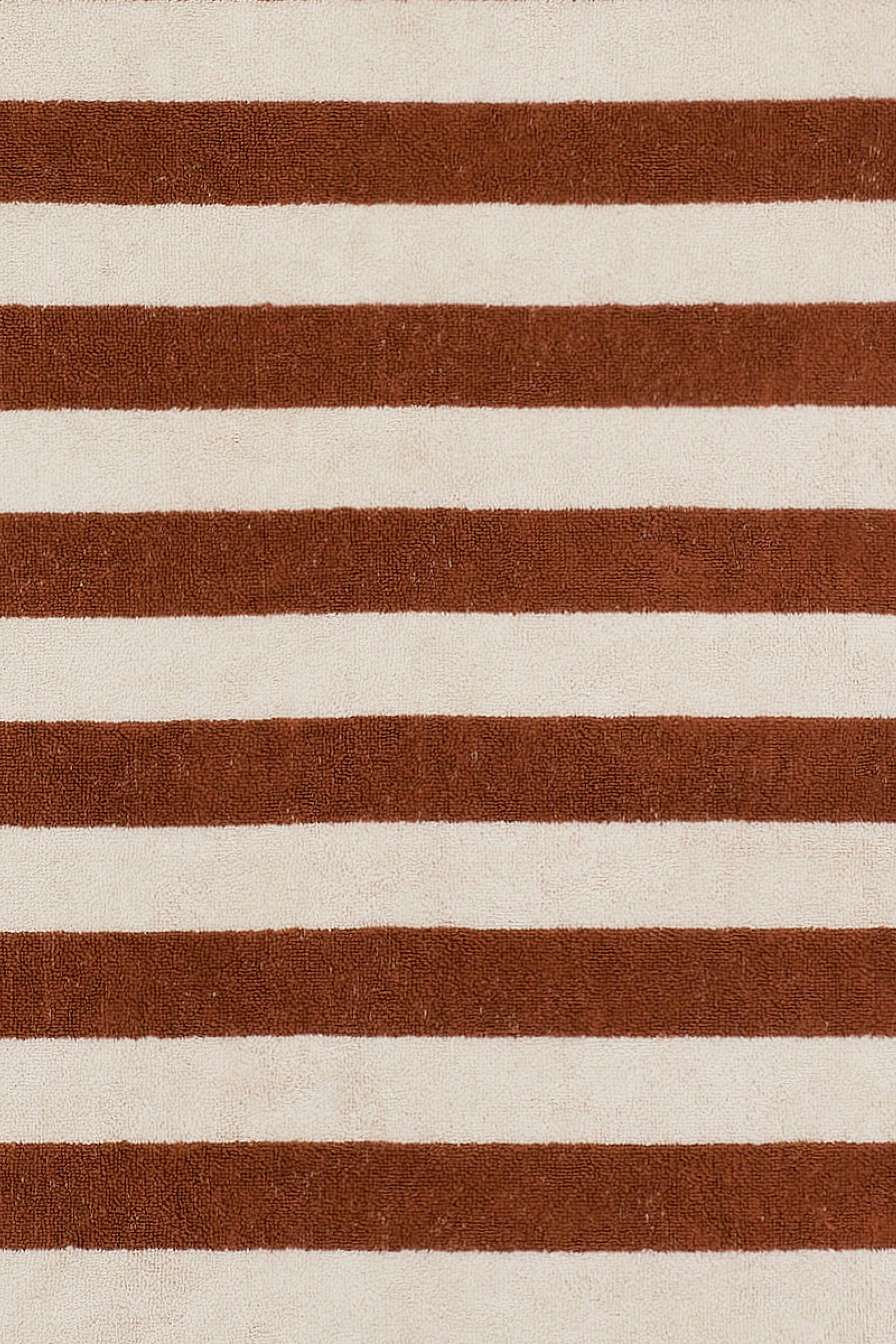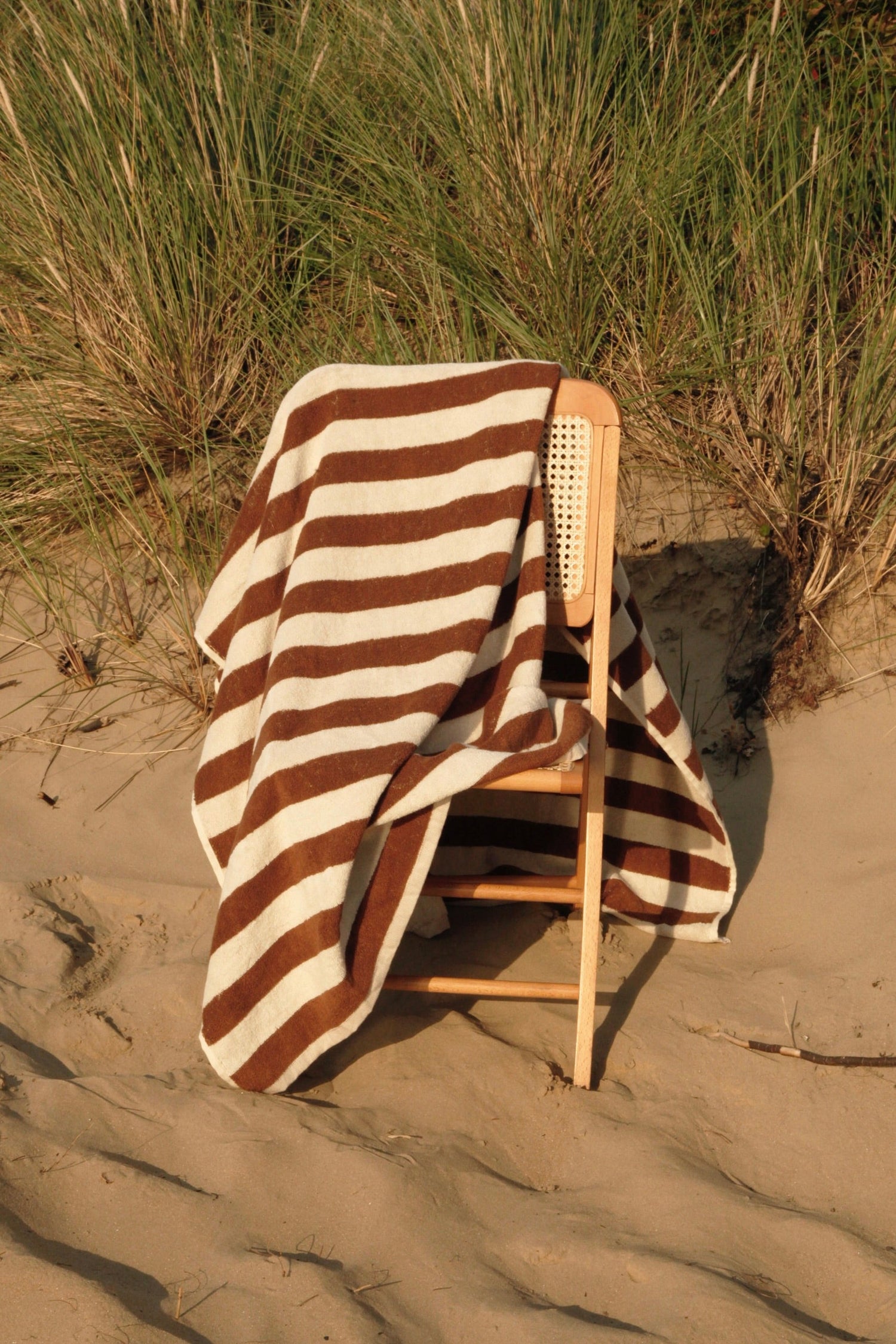 Reminiscent of the horizontal stripes seen throughout traditional carpet making, this array of natural hues celebrates the timelessness of ancient weaving. A plush, generously-proportioned organic cotton towel constructed in a double-sided jacquard weave. This towel is oversized and extremely absorbent–perfect for use as a beach mat, or to simply dry off.