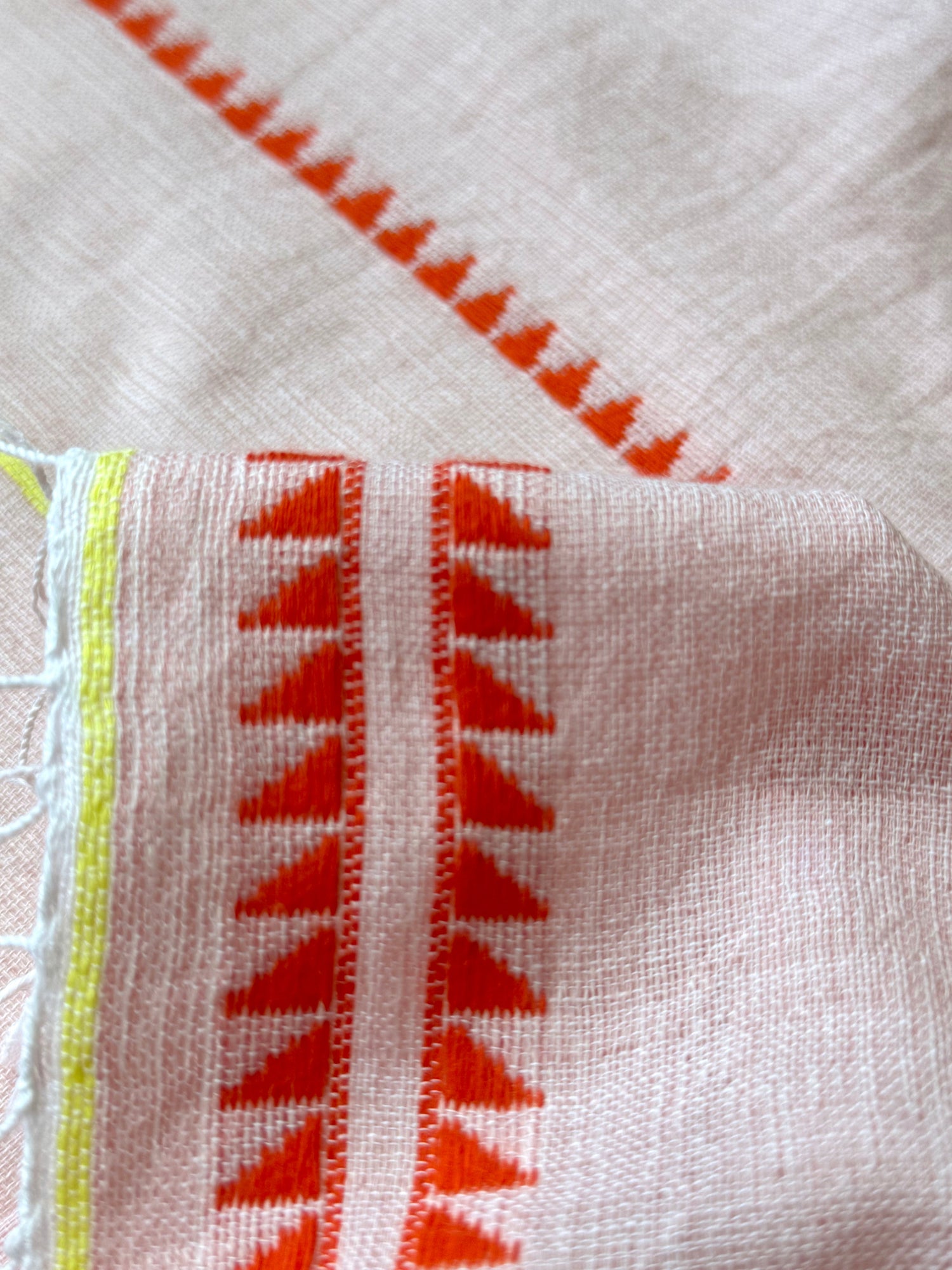The Bela Petal Collection features vibrant orange red Tibeb pattern on a soft antique rose pink background, with a hint of citron tipping.