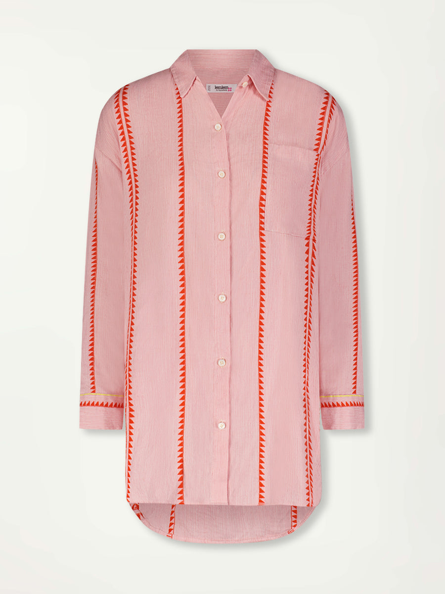 This shirt features an oversized, relaxed silhouette, side pockets, a back yoke, a curved shirttail hem, and sustainably sourced and produced natural shell buttons. It can be worn as a swim cover-up, a shirt, or a short dress.