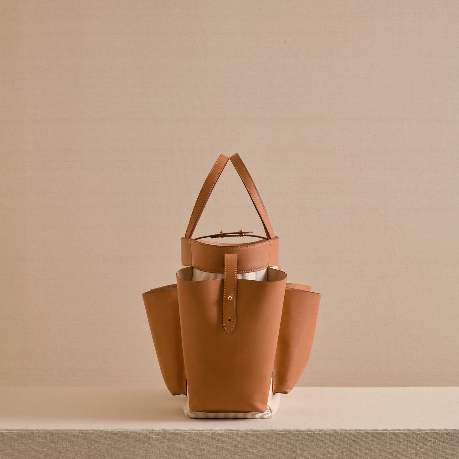 This collaboration focuses on elevating everyday life; four pieces which are functional yet aspirational. Crafted in Italy from natural canvas and calfskin vacchetta leather, the Garden Tote features six external pockets and an interior well.