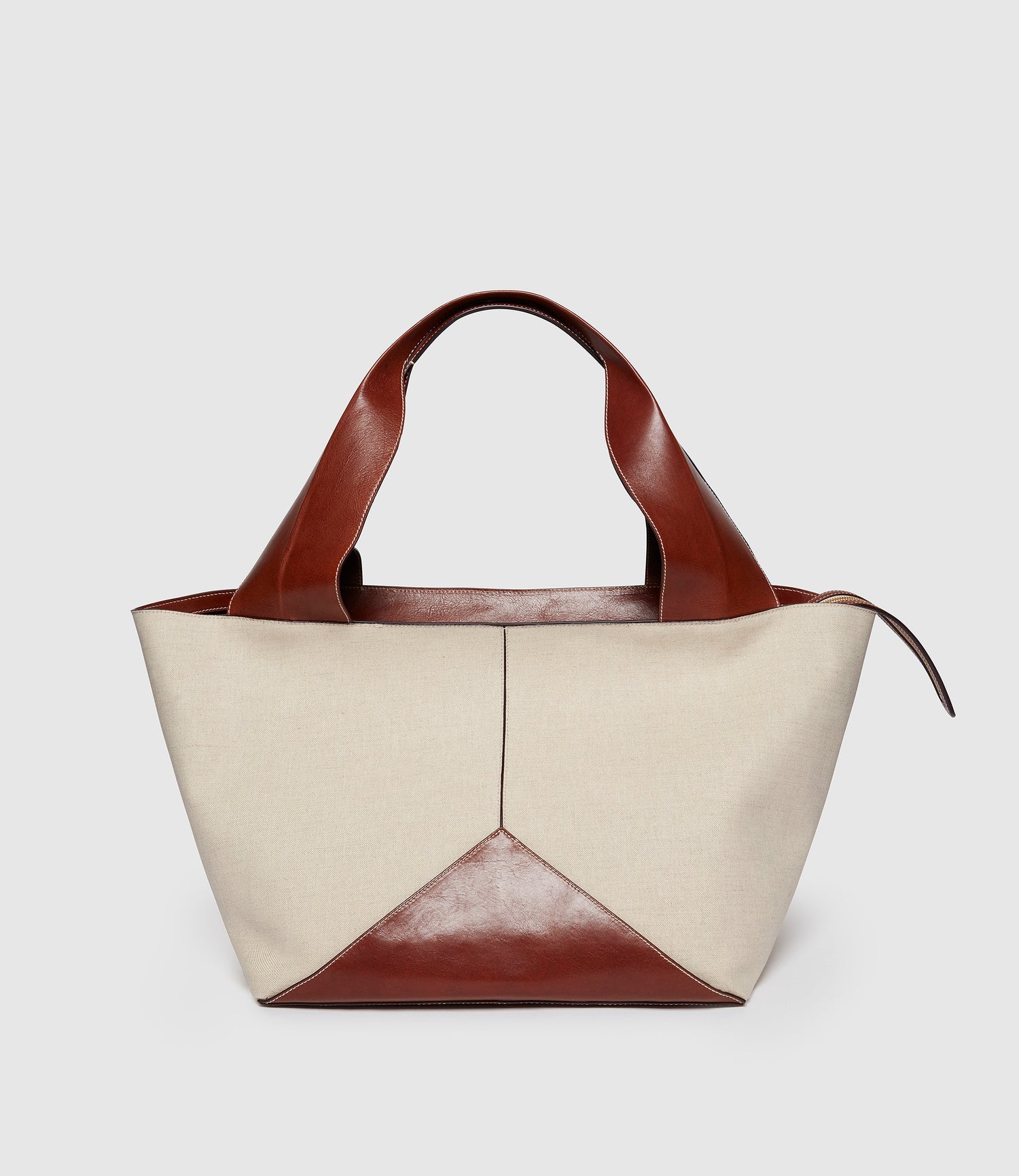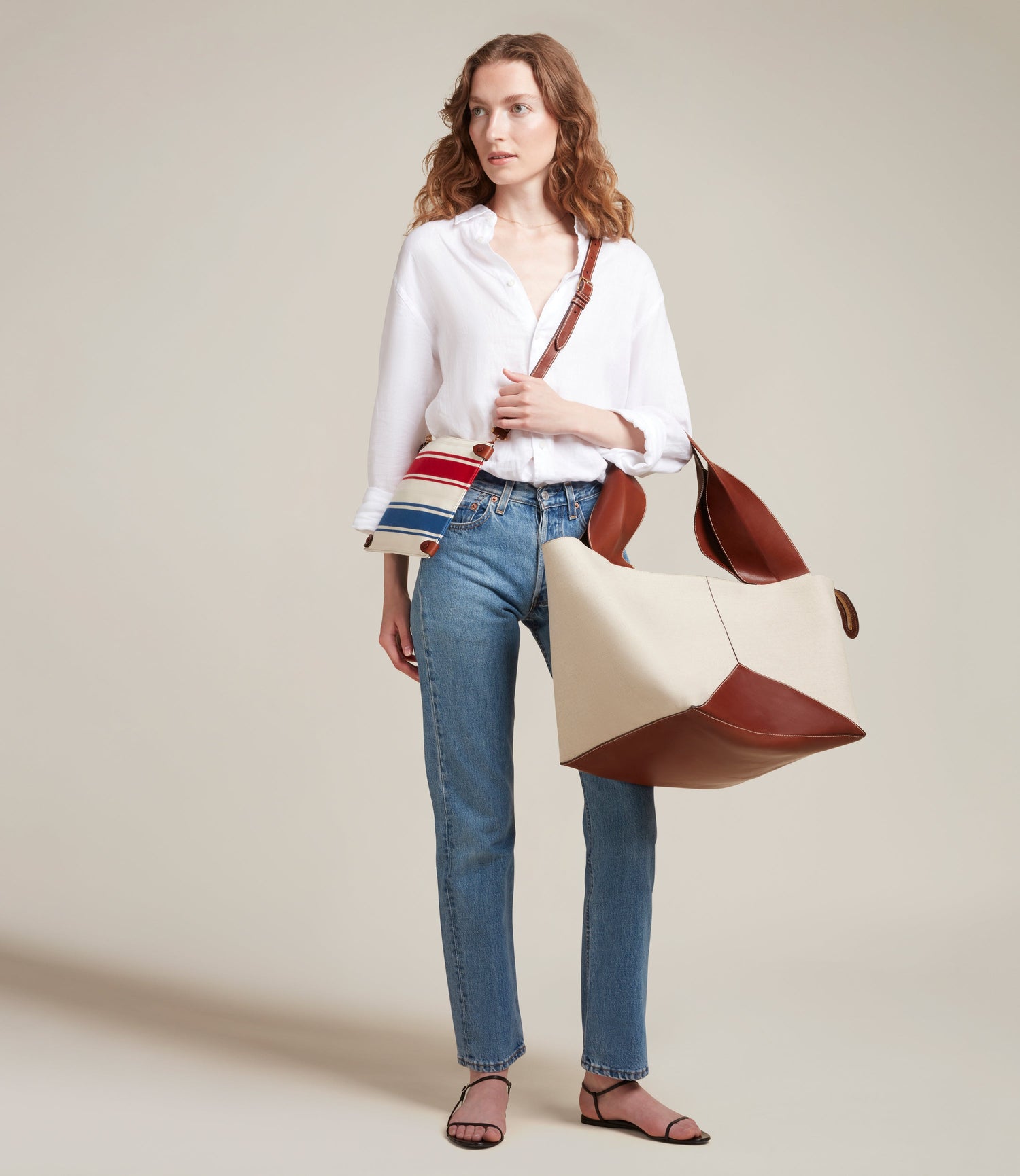 Designed to rival your favorite boat-and-tote, the featherlight Market Weekend Bag is cleverly engineered to seamlessly take you from the airport lounge to the seafront. Quite literally a twist on a classic, the tote's base has been twisted and tailored to rest lightly against the body, while its wide and supple handles, attached from the corner points, create the perfect slouch. As always with Métier, there's more than meets the eye. The bag is fitted with two exterior zippered compartments beneath the flaps, keeping valuables within reach, as well as an interior snap pocket. Ready to pull a rabbit out of your hat (so to speak)? Its interior pouch comes with a detachable strap and clips out to double up as a crossbody bag—that's what we call a two-for-one!